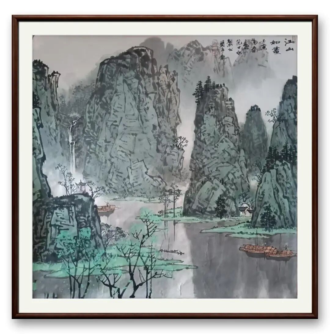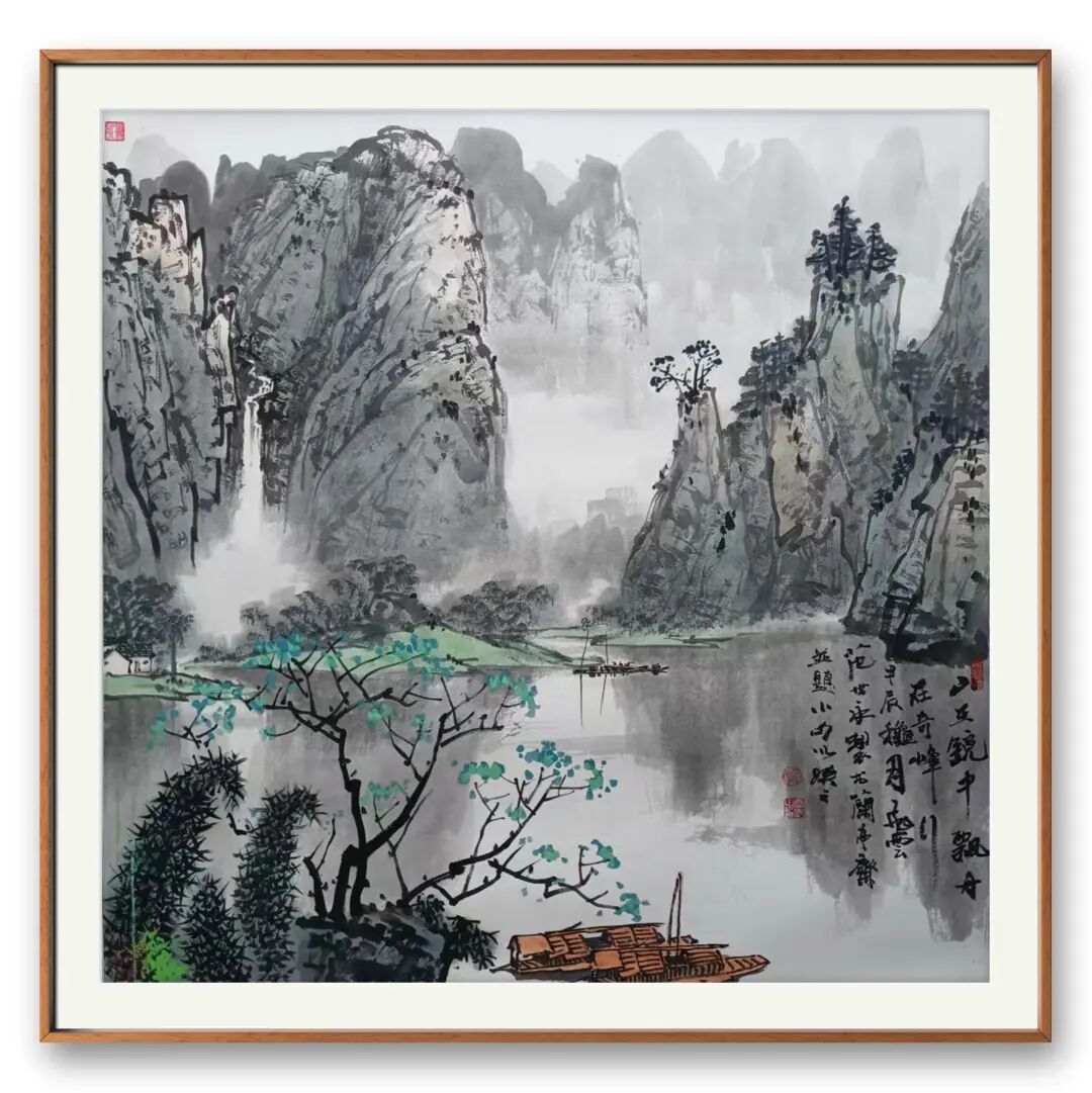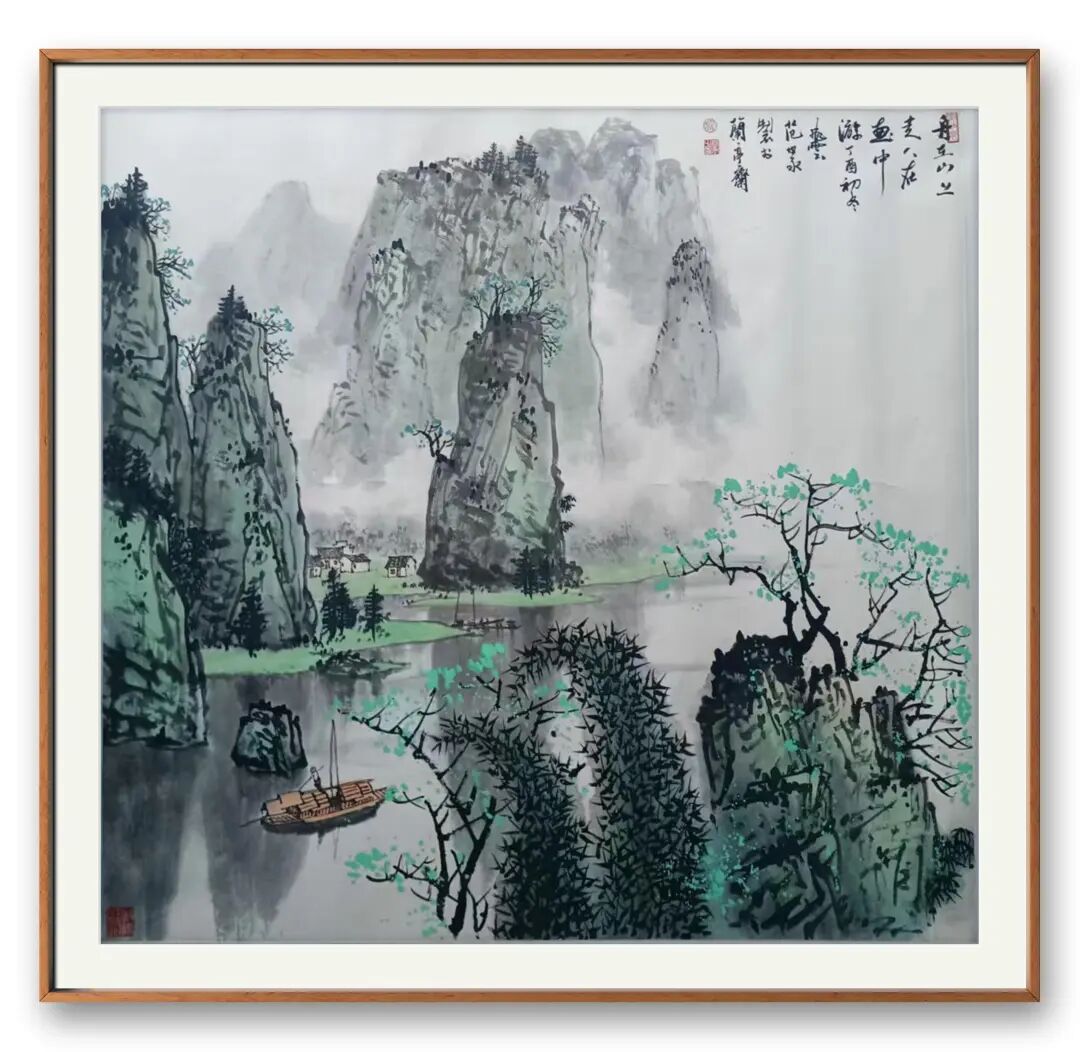 先生山水之作,重“气”尚“韵”,以笔墨铺陈天地灵秀,以意境传递人文情怀。其笔下山水,不执着于具象描摹的精苛,而着力于气韵贯通的营造,师法传统却不泥古不化,兼收西泠画院的清雅与齐鲁山水的雄浑,将南北山水之韵熔铸一炉。墨色运用堪称精妙,干墨皴擦见山石肌理,湿墨晕染显烟岚缥缈,浓淡相生间,远山如黛含雾,近石嶙峋见骨,溪泉隐现藏声,林木葱茏含翠,既有“千山鸟飞绝”的静谧,又有“清泉石上流”的灵动。构图上讲究虚实相映、开合有度,留白处藏风纳气,落笔处见筋见骨,不贪多求繁,却能以简驭繁,让每一寸笔墨都服务于意境营造,观之如置身丘壑之间,尘心渐息,顿生“澄怀观道”之思。