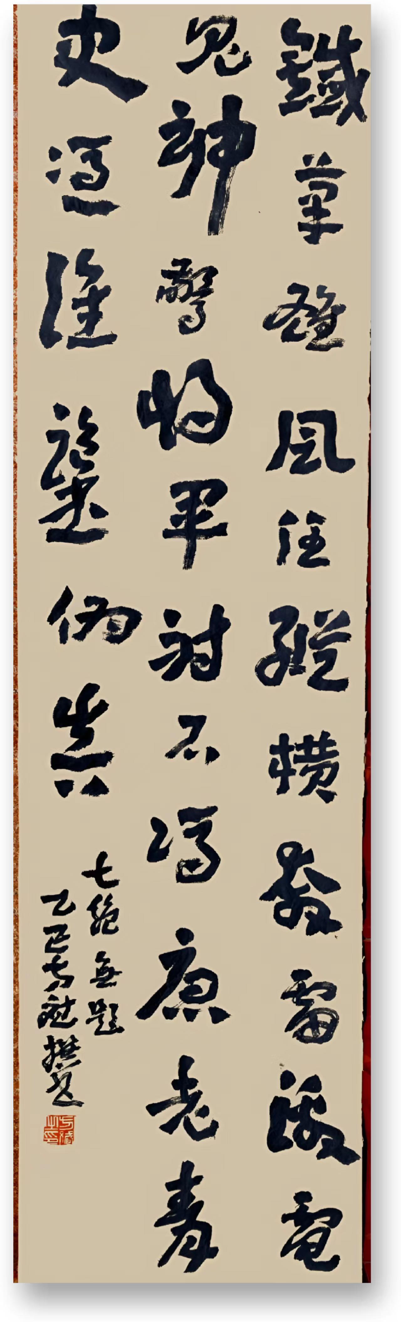在当代书坛,方斌先生的章草创作以其深厚的传统功底与鲜明的个人面目独树一帜。这幅《七绝·自题》立轴,不仅是其章草艺术的凝练表达,更是“书文合一”境界的生动体现,堪称当代章草创作的典范之作。