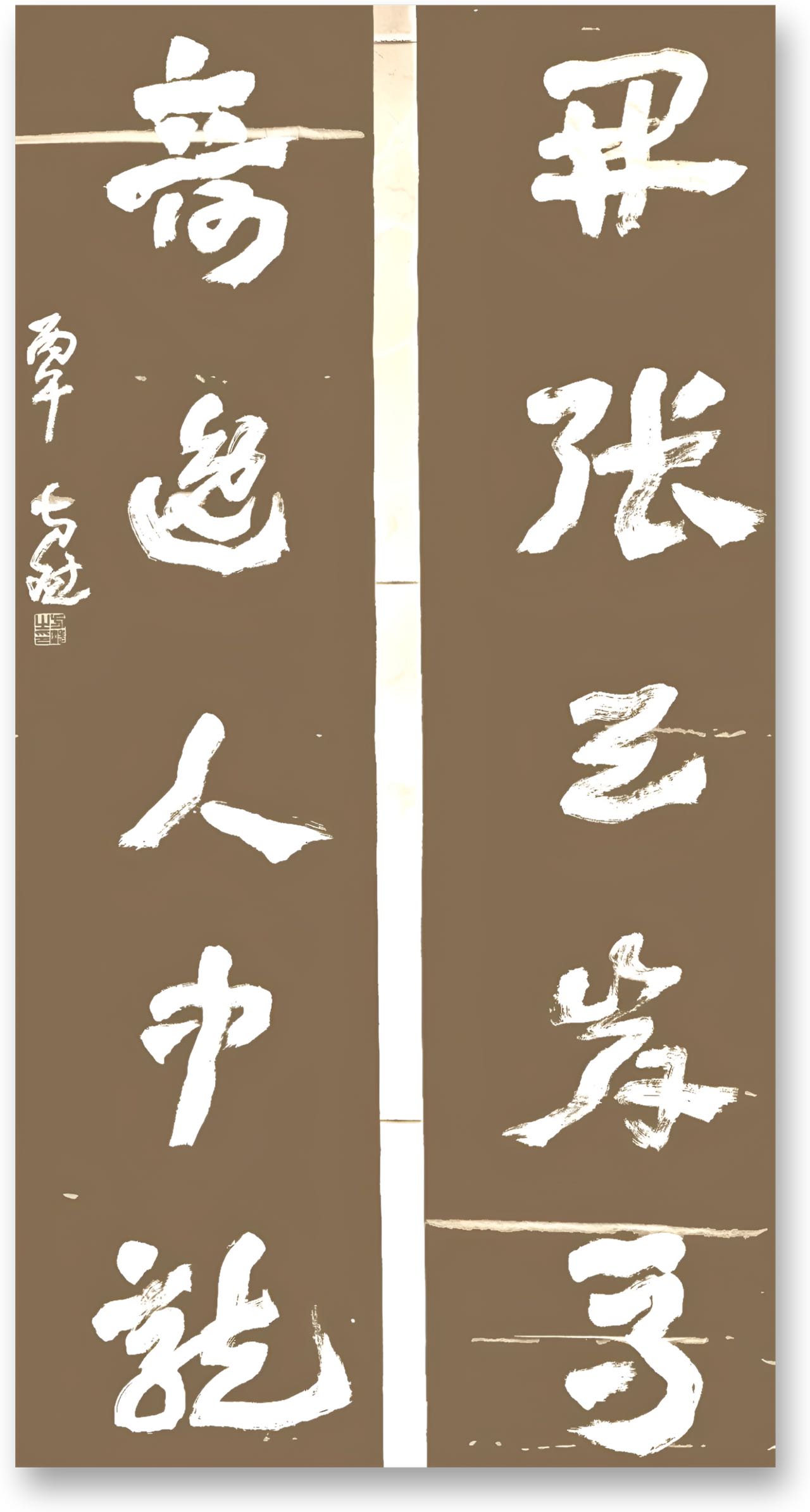 1. 出处背景:此联相传为五代宋初道家宗师陈抟(希夷先生)所书,原刻于河南洛阳龙门石窟,亦称“陈抟十字卷碑”。其书法取法北魏《石门铭》,被康有为推崇为“飞逸奇浑”的神品。