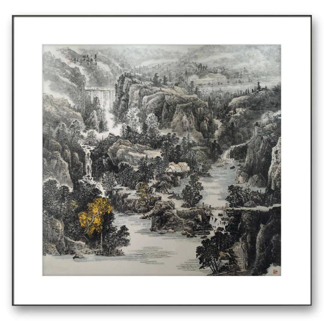 张成良老师善于用线条勾勒山川的轮廓、草木的形态,线条疏密得当、虚实相生,既凸显了山水的雄浑气势,又展现了草木的灵动多姿;用皴法表现山石的肌理,笔触细腻、层次丰富,让山石显得苍劲厚重、质感十足,仿佛能触摸到山川的脉络。在墨法上,他借鉴传统水墨“墨分五色”的技法,灵活运用浓墨、淡墨、干墨、湿墨,墨色氤氲、虚实相生,既营造出山水的立体感与层次感,又为色彩的运用奠定了沉稳的基调,避免了色彩过于艳丽而显得俗媚。这种精妙的笔墨运用,让张成良老师的作品既具有传统山水画的韵味,又兼具现代彩墨的鲜活气息,笔墨之间尽显艺术匠心。