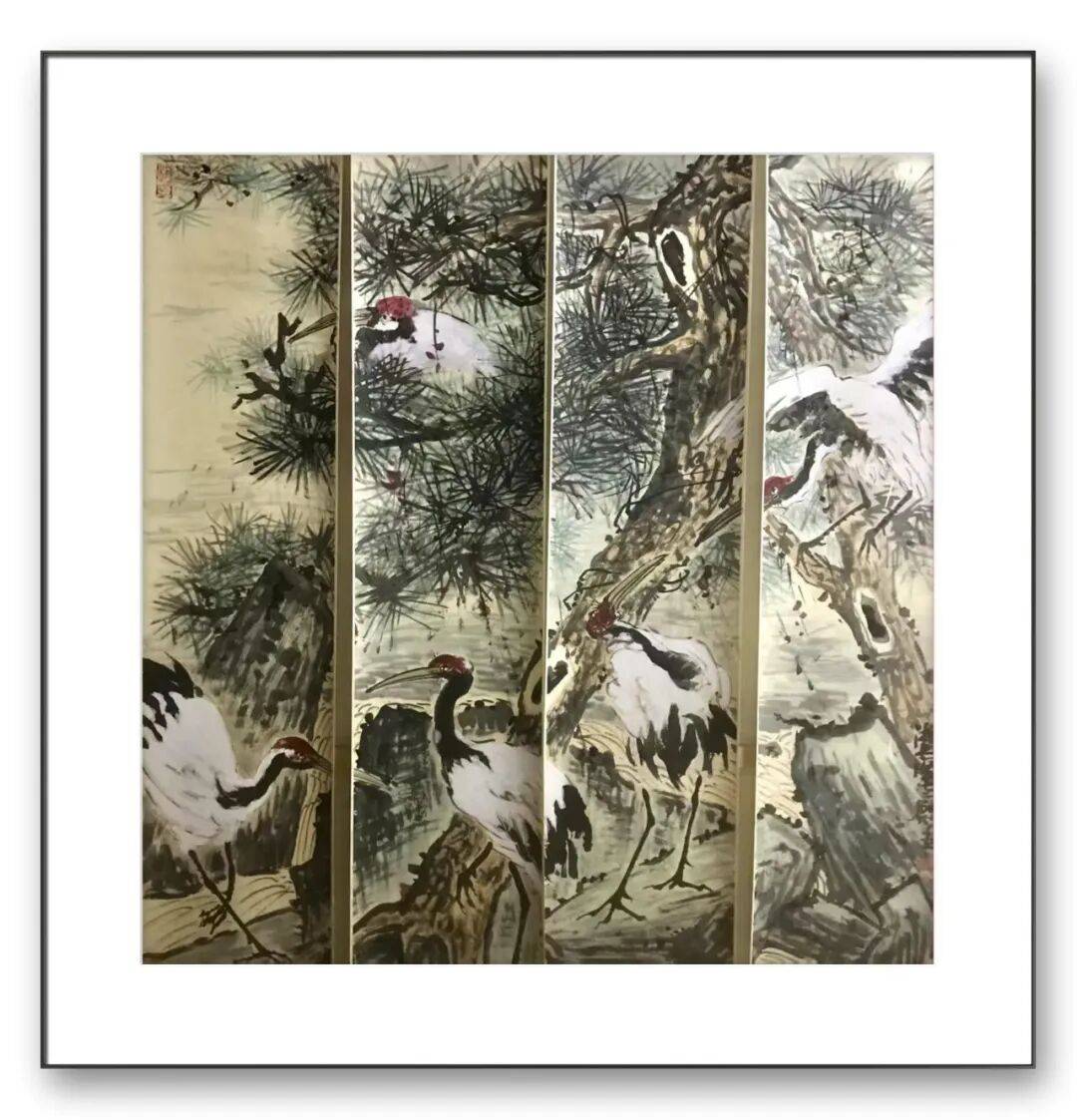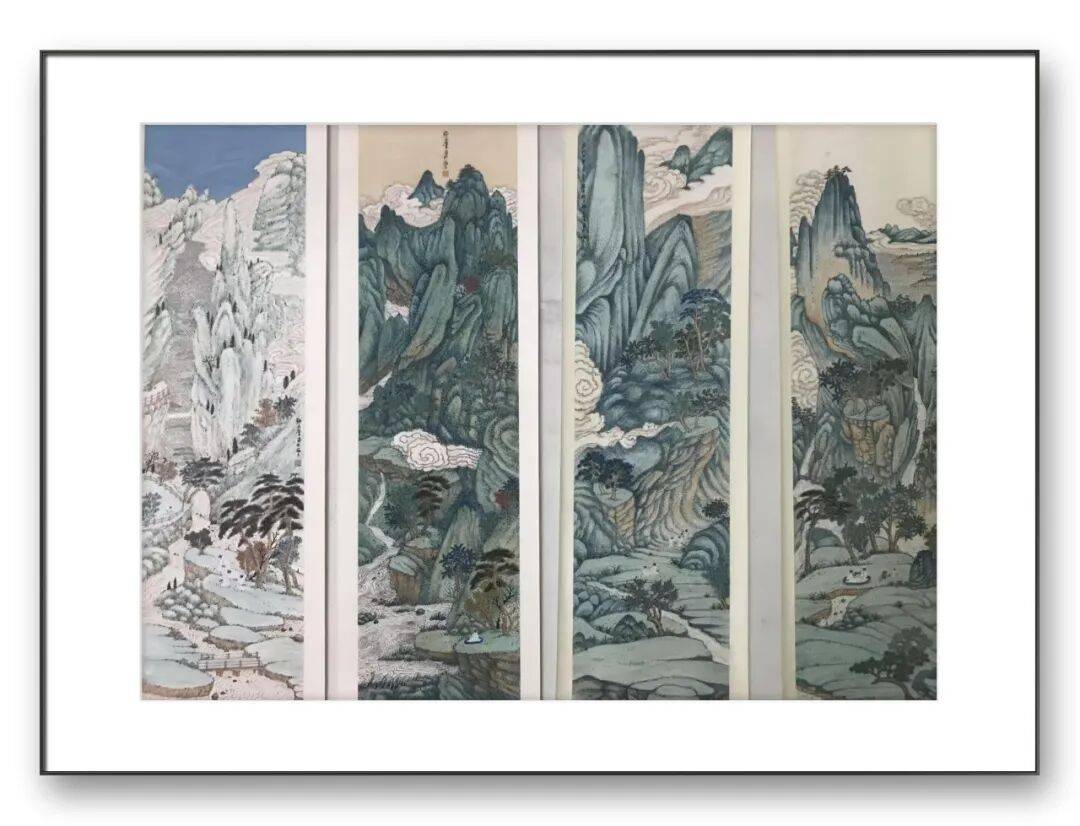 韩长荣的山水画,始终以“气韵生动”为核心追求。在他的作品中,笔墨不仅是造型手段,更是情感与精神的载体。以其青绿山水四条屏为例,画面以石青、石绿为主调,层层晕染出峰峦叠嶂的层次感,云雾以留白与淡墨晕染,似动似静地穿梭于山峦之间,营造出“山在虚无缥缈间”的空灵意境。前景的古松以浓墨点叶,枝干虬曲苍劲,与中景的屋舍、人物形成呼应,传递出“可居可游”的文人意趣。
