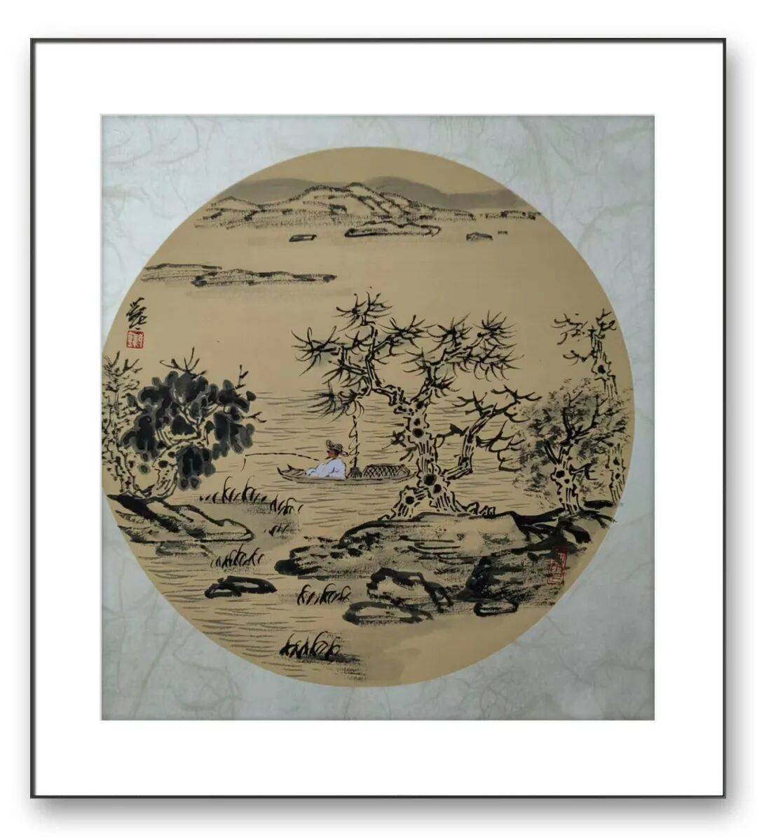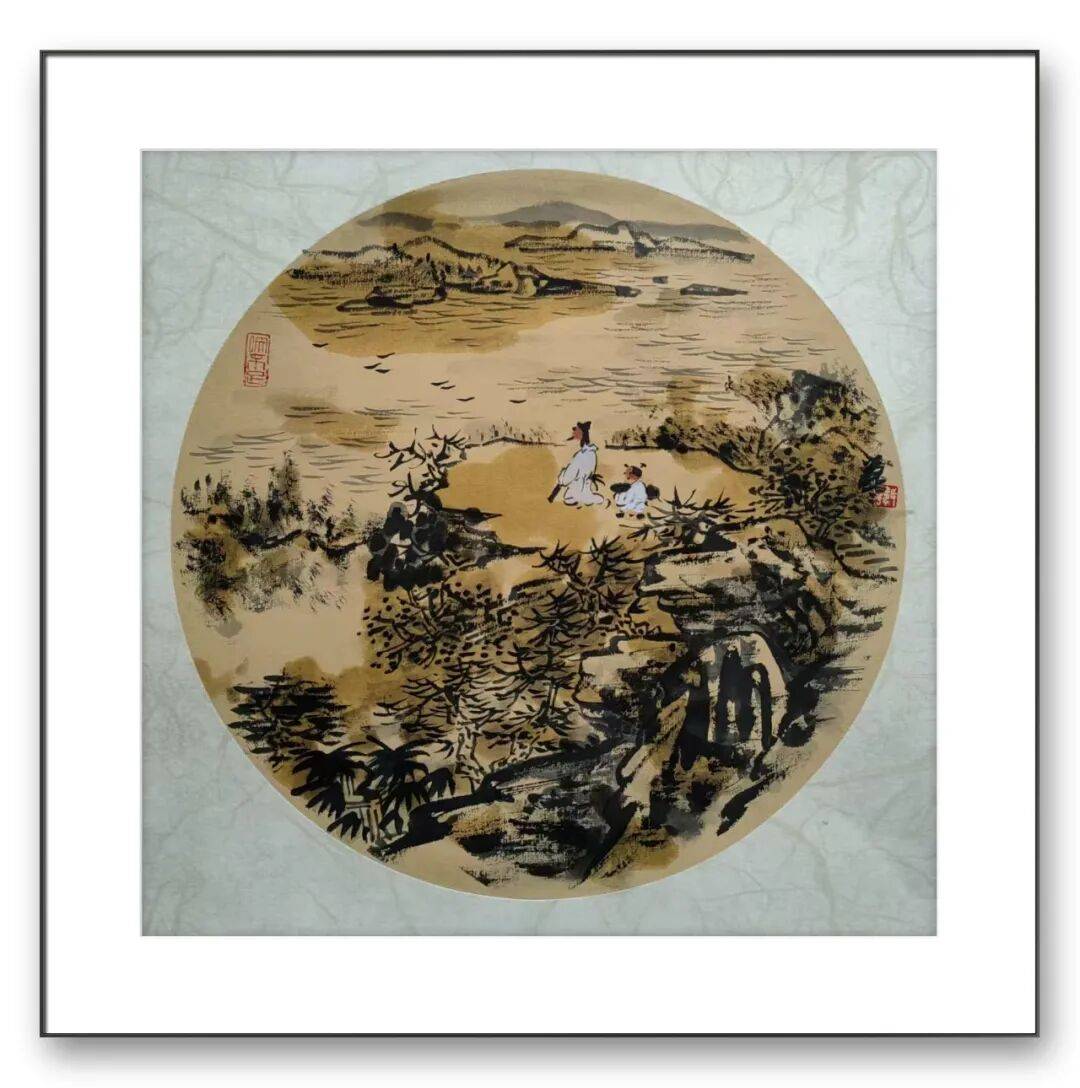 在水墨作品游云欲浮中,他以解索皴表现山石肌理,用枯笔焦墨勾勒松枝,再以淡墨渲染水面,墨色的浓淡干湿变化,既塑造了物象的质感,又强化了画面的韵律感。这种笔墨运用,既遵循了传统山水画的法度,又融入了个人性情:行笔的提按顿挫间,可见其对自然的细腻观察;墨色的氤氲流转中,蕴含着对天地精神的深刻体悟。值得注意的是,韩长荣的作品中常点缀人物意象:或策杖寻幽,或临江垂钓,或对坐论道。这些人物并非简单的场景补充,而是“天人合一”哲学思想的视觉表达——人在山水间,既是自然的观察者,也是意境的参与者。如他的扇面山水秋江独钓,一叶扁舟、一竿钓丝,在寥廓江天的映衬下,将传统文人“独与天地精神往来”的情怀表现得淋漓尽致。