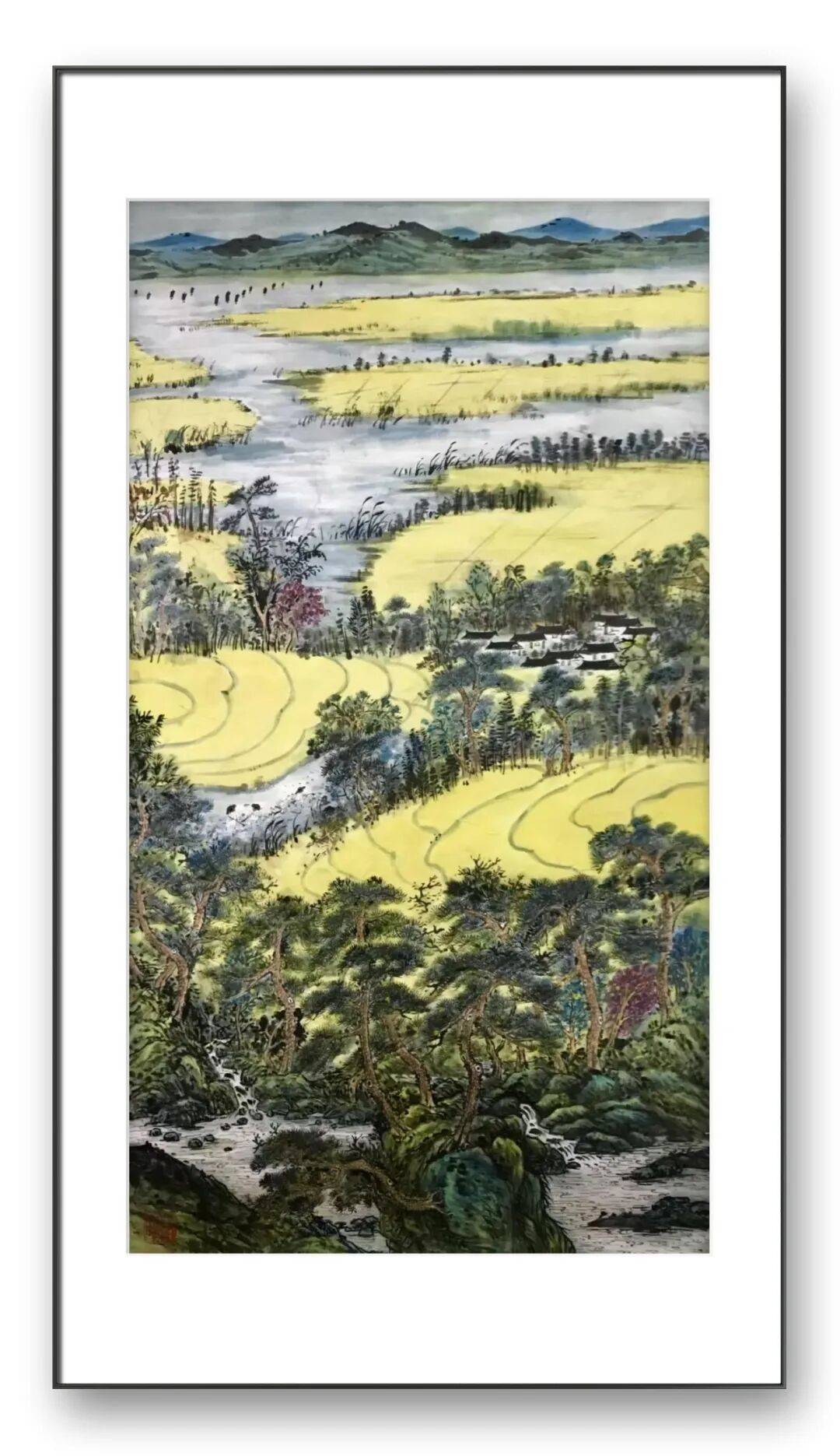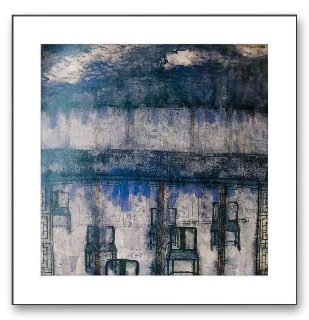 国画的笔墨意趣,又借鉴了西方绘画的色彩构成,营造出极具视觉冲击力的画面效果。在另一幅作品空谷梵音中,他以淡蓝与灰紫的色调渲染古刹,用线条勾勒门窗与桌椅,将传统建筑的结构美与现代抽象的形式感相结合,传递出“空寂悠远”的禅意。这种创新并非对传统的背离,而是在深刻理解传统精神基础上的拓展——他始终认为,山水画的核心是“意境”,而意境的营造可以通过多元的艺术语言实现。