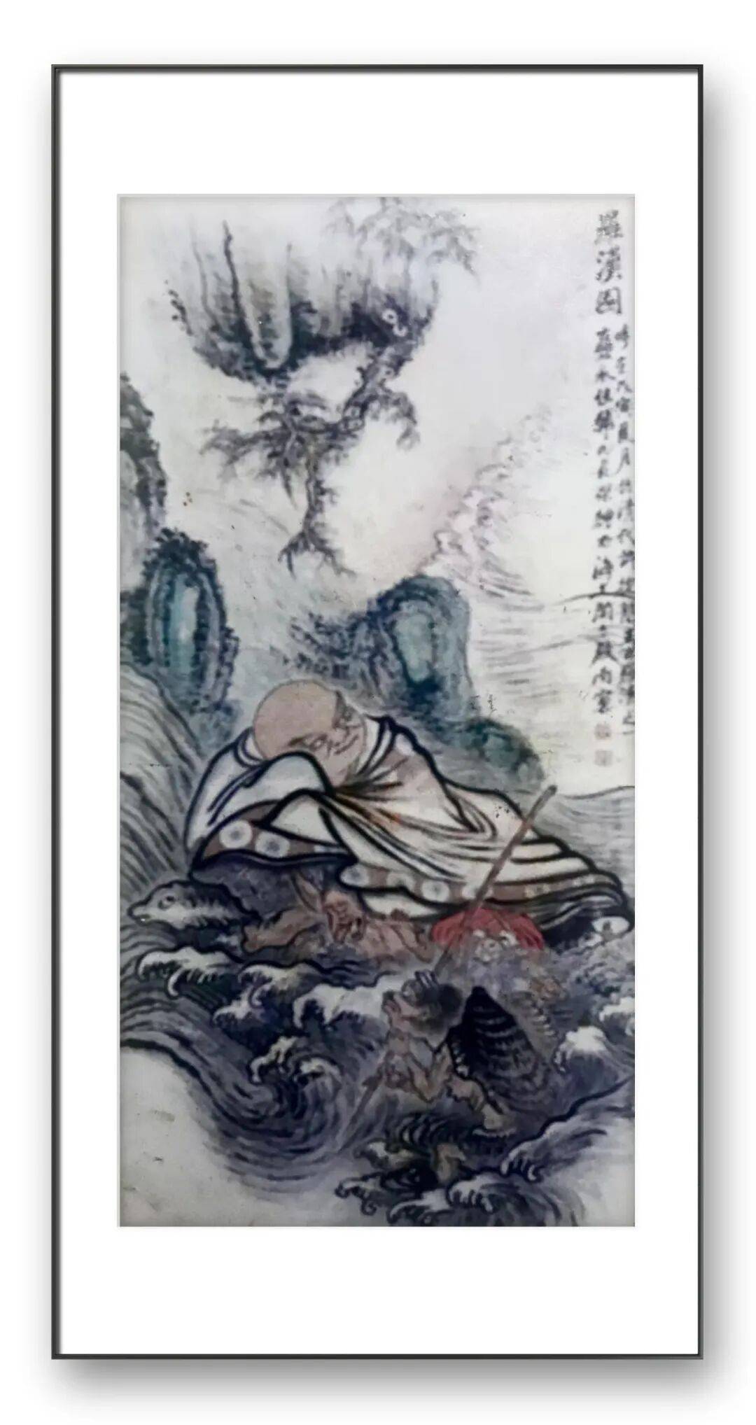 韩长荣的人物画,在传统笔墨中注入了鲜活的当代意趣,展现了他对人物精神世界的深刻洞察。画家以浓墨勾勒山石的嶙峋,用淡墨晕染远山的空濛,营造出一种 “空山不见人,但闻人语响” 的禅意氛围。罗汉的神态各异,或凝神沉思,或侧耳倾听,于静默中流露出对佛法的参悟,体现了画家对传统释道人物画的深厚功力。画家以简练的线条勾勒人物,用淡墨晕染衣袍,梅花的艳红与喜鹊的黑白形成鲜明对比,将 “喜上眉梢” 的吉祥寓意表现得生动而不媚俗。这两幅作品,一静一动,一禅一俗,既展现了韩长荣对传统笔墨的坚守,也体现了他在当代语境下对人物画的创新探索,是其 “重气韵、尚自然” 艺术理念的生动注脚。