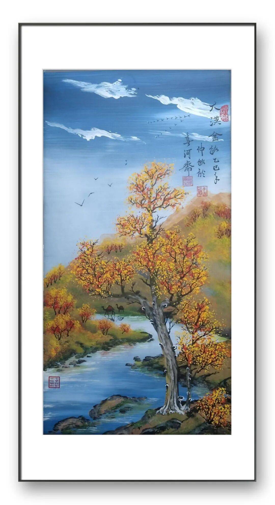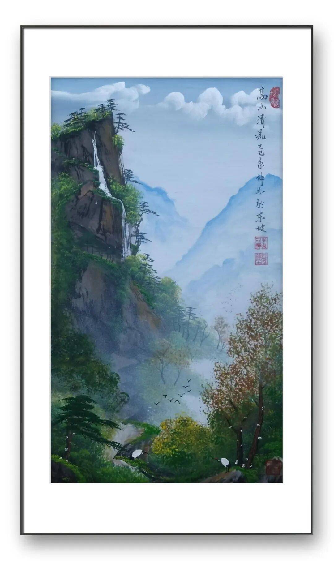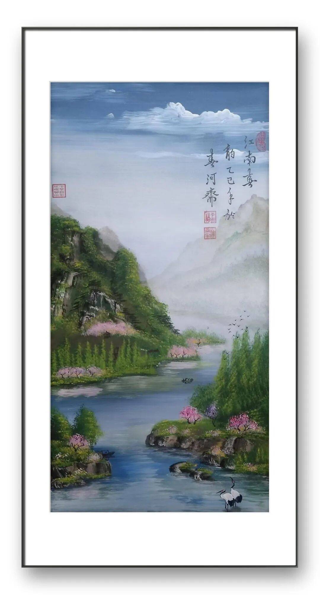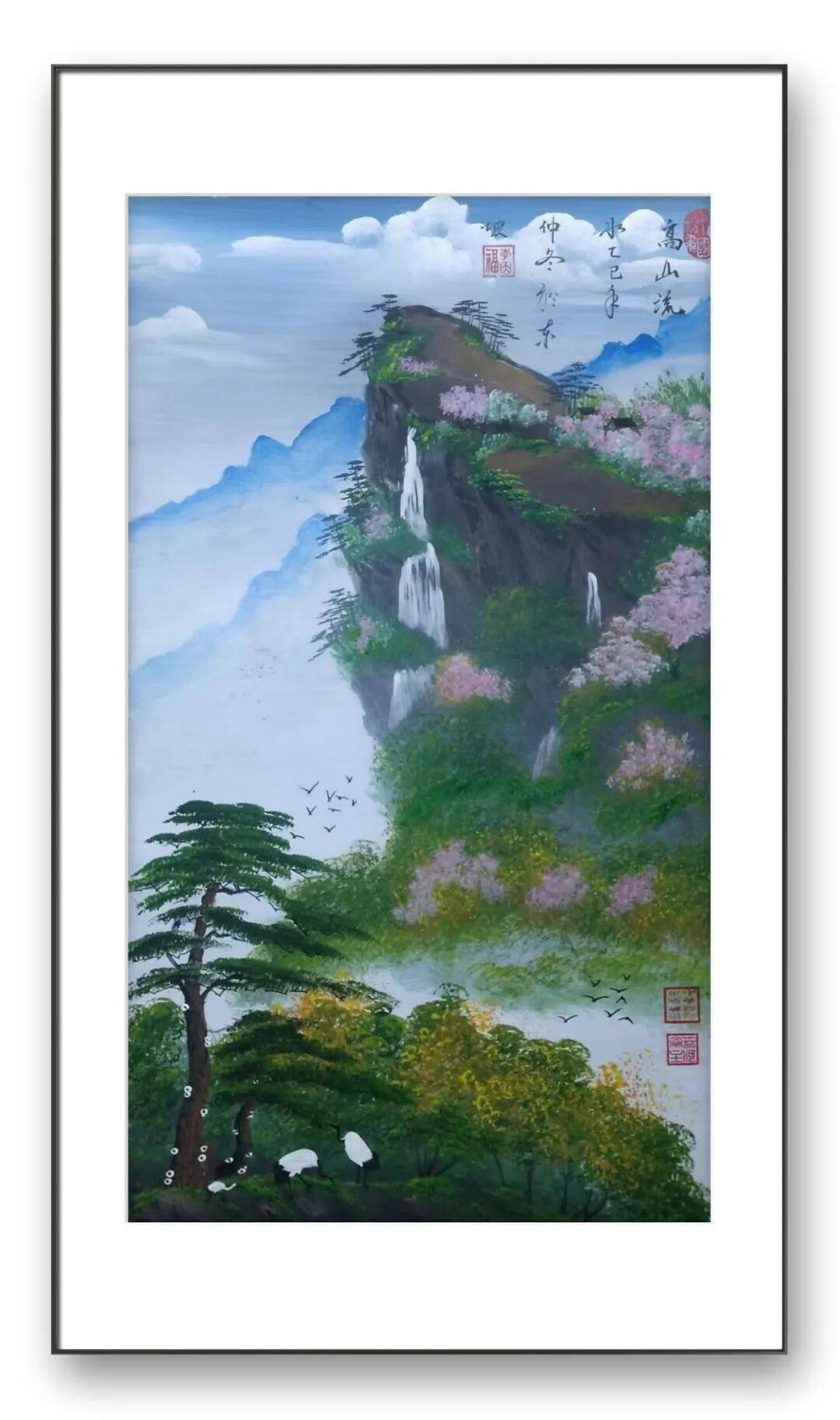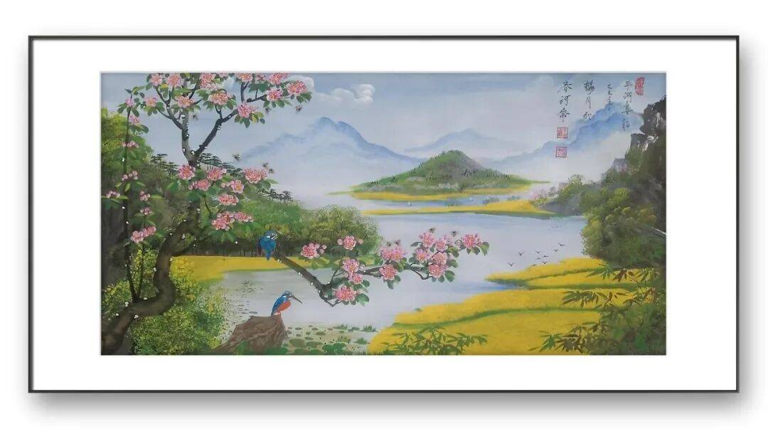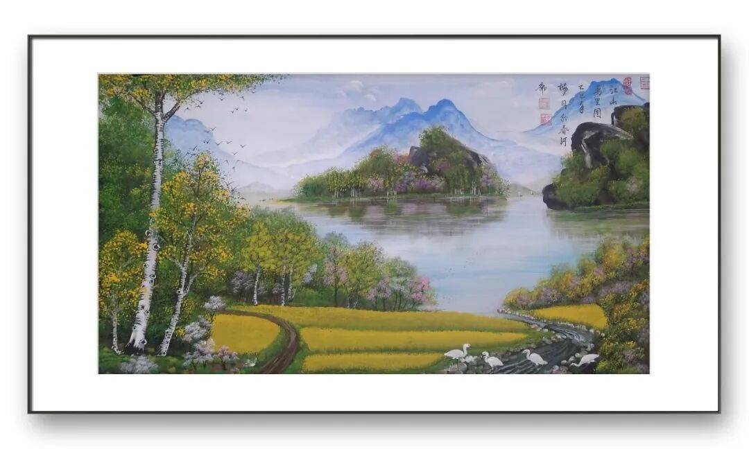 除了独创的砂纸粉彩画,李因福先生在传统书画领域的造诣同样令人惊叹。他涉猎广泛,国画、油画、烫画、玻璃画皆有涉猎,尤其擅长山水长卷、仕女、花鸟,每一种题材都能展现出独特的艺术魅力,彰显出他深厚的艺术功底与多元的创作能力。山水长卷是李因福先生的拿手好戏,他的长卷作品,构图恢弘大气,笔墨流畅洒脱,兼具气势与韵味。创作中,他注重整体布局的疏密有致,将山峦、溪流、屋舍、林木等元素有机融合,既展现出自然山水的磅礴气势,又蕴含着细腻的人文情怀。