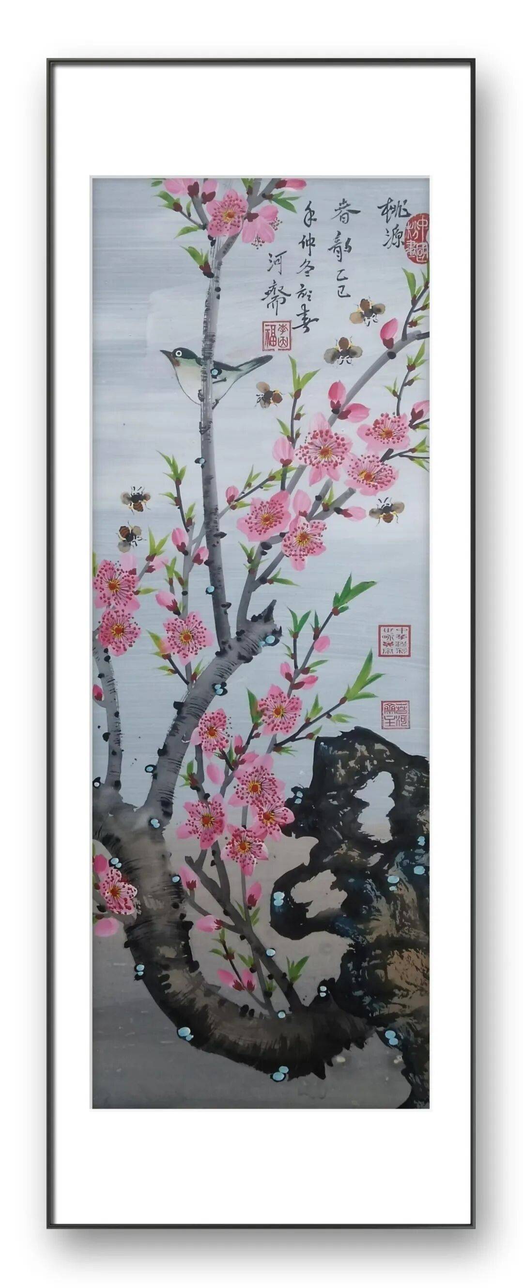 先生的创作始终秉持“心师造化,融情于形”的理念,笔下的每一株花、每一只鸟都不是简单的物象复刻,而是有灵性、有情感的生命个体。他善于捕捉自然中的瞬息之美,将春日繁花的绚烂、夏日荷花的清雅、秋日菊韵的淡然、冬日寒梅的傲骨,都融入笔墨之中。无论是欢快跳跃的青蛙、优雅翩跹的蝴蝶,还是悠然游弋的鱼儿、静立枝头的雀鸟,在他的笔下都拥有了鲜活的内在世界,仿佛能让人听到画中细微的生命律动,感受到大自然的生机与温情。这种对生命的深刻理解与细腻表达,让他的作品超越了视觉艺术的范畴,成为情感与灵魂的载体。
