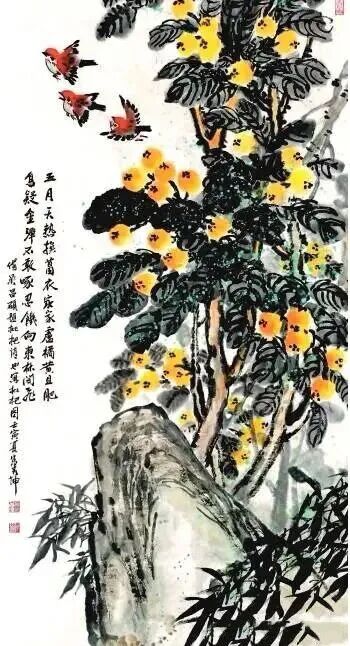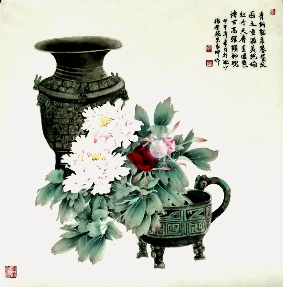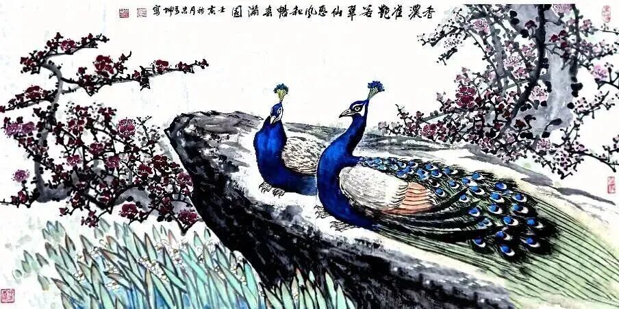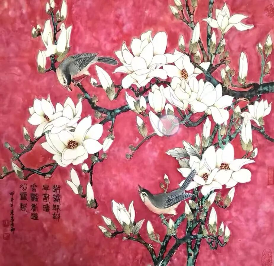 四、现场观感——站在画幅前的“一眼识别” - 三步之外:气势扑面——巨枝横斜、花团锦簇,先感受到北方阳光般的炽烈。 - 一步之内:生机暗涌——翎毛上的淡粉、花心里的露珠,皆是江南晨雾般的轻灵。 - 再退两步:雄秀消融——浓墨重彩与虚淡空间互为衬托,既“慑人”又“动人”,完成南北美学的和解。