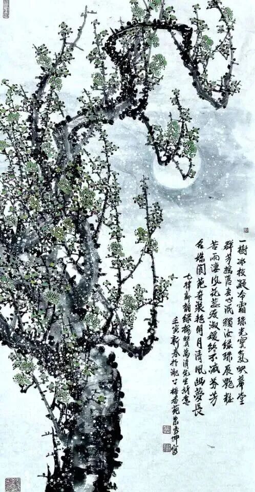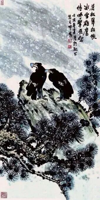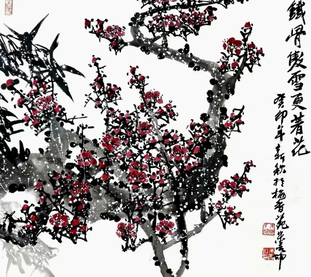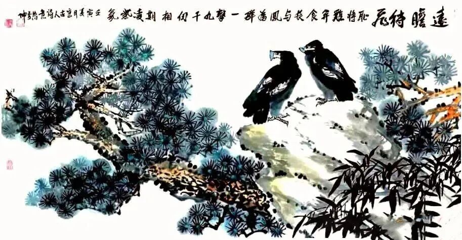 1. 构图——宏大骨架与空灵留白并举 - 北派“满构图”造势:常用顶天立地的枝干、斜势切割的山石,先立“钢筋铁骨”。 - 南派“呼吸留白”:在密匝匝的工笔花叶间留出一泓“气眼”,使雄强骨架间自有秀逸呼吸。