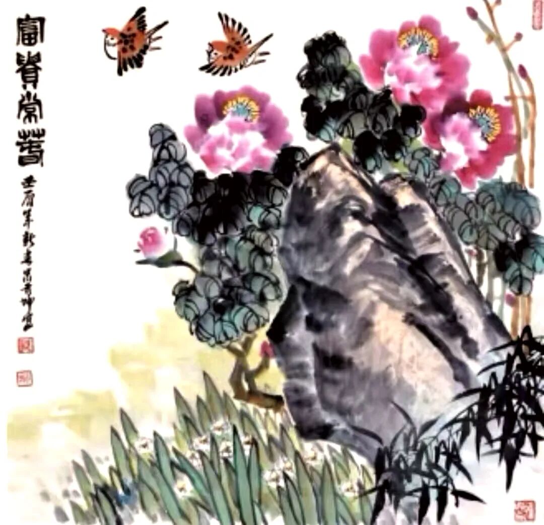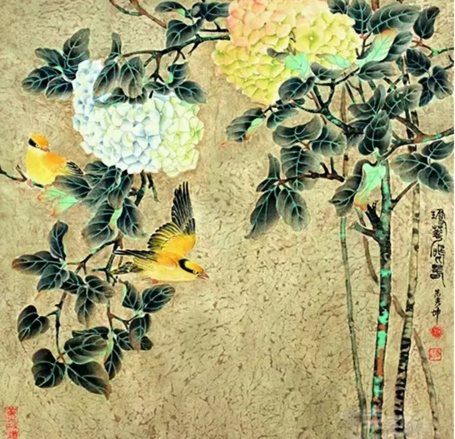 2. 用笔——“斧劈皴”般的顿挫与“春蚕吐丝”般的游丝共存 - 老干、湖石用侧锋飞白,如刀砍斧劈,得北派阳刚。 - 花蕊、羽翎用中锋游丝,细若游丝却韧劲内敛,显南派灵秀。
