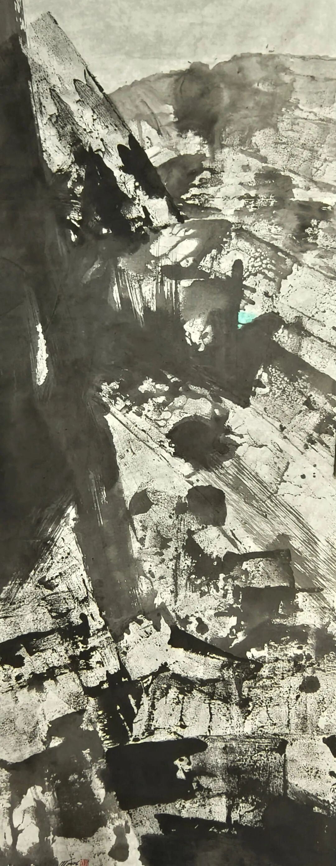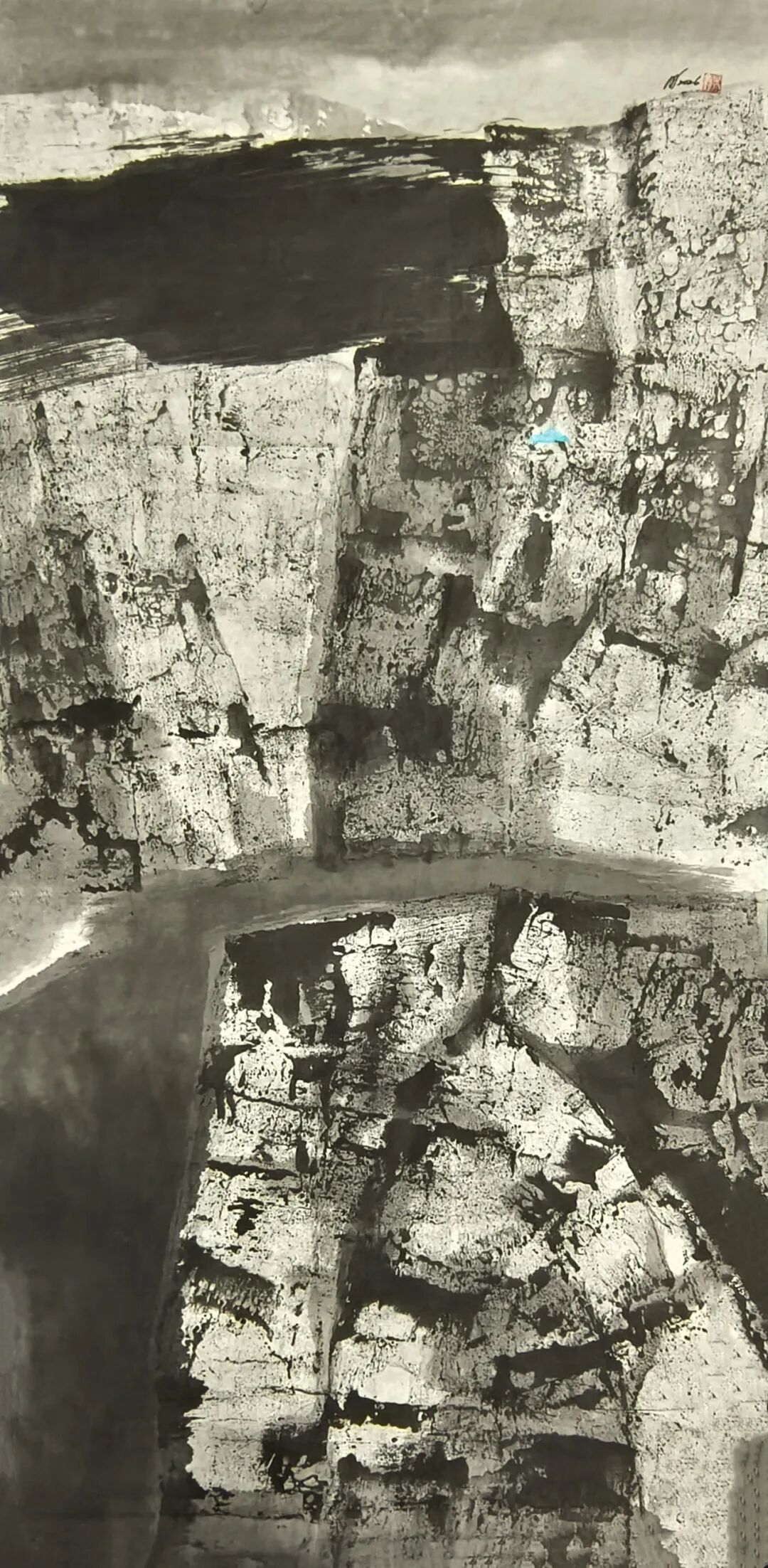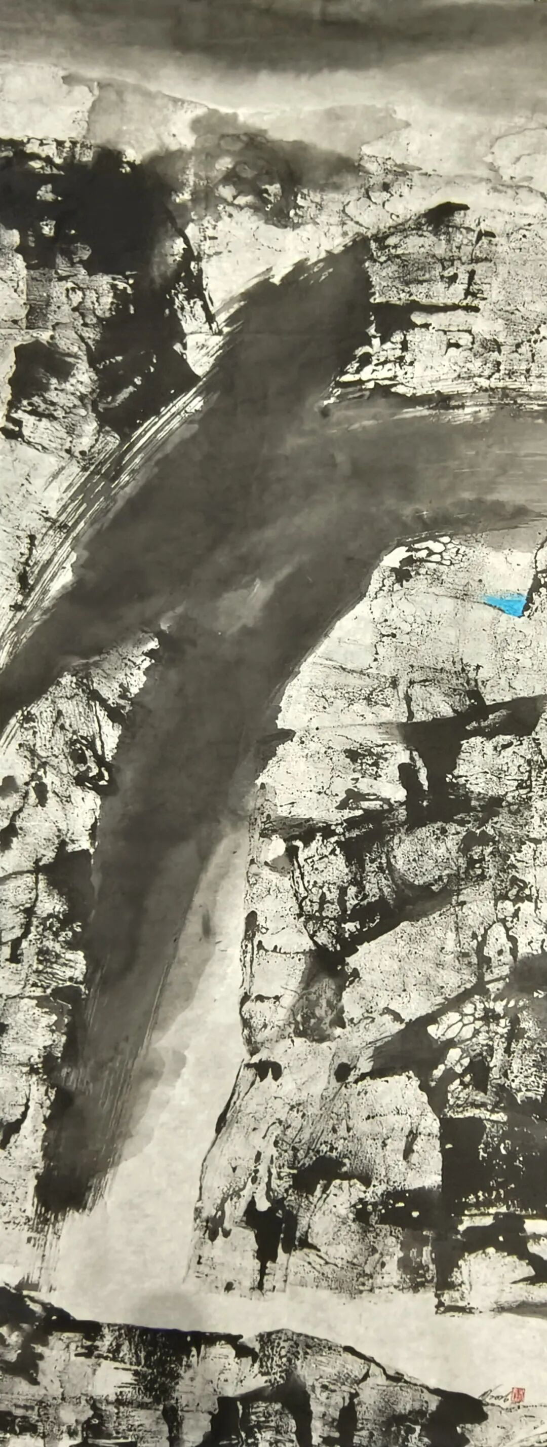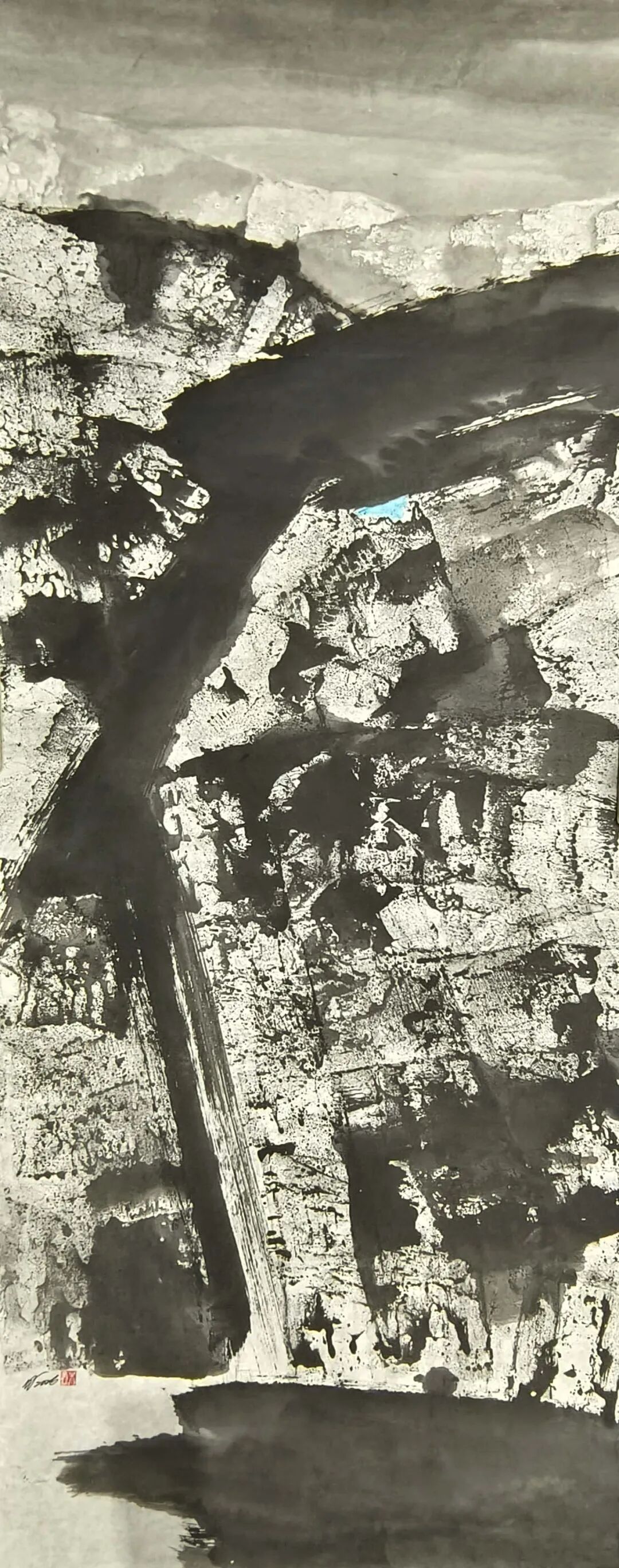 在他的笔下,峡谷的嶙峋怪石不再是温婉的写意勾勒,而是通过浓淡干湿的墨色叠加、枯笔焦墨的擦刮皴擦,形成丰富的肌理层次。墨色的堆积如岩层的褶皱,枯笔的飞白似山石的裂纹,刀刻般的笔触则赋予画面一种雕塑般的质感,仿佛能触摸到峡谷岩壁的粗糙与坚硬。这种技法的突破,让大山峡谷不再是静态的风景再现,而是充满生命律动的精神载体。