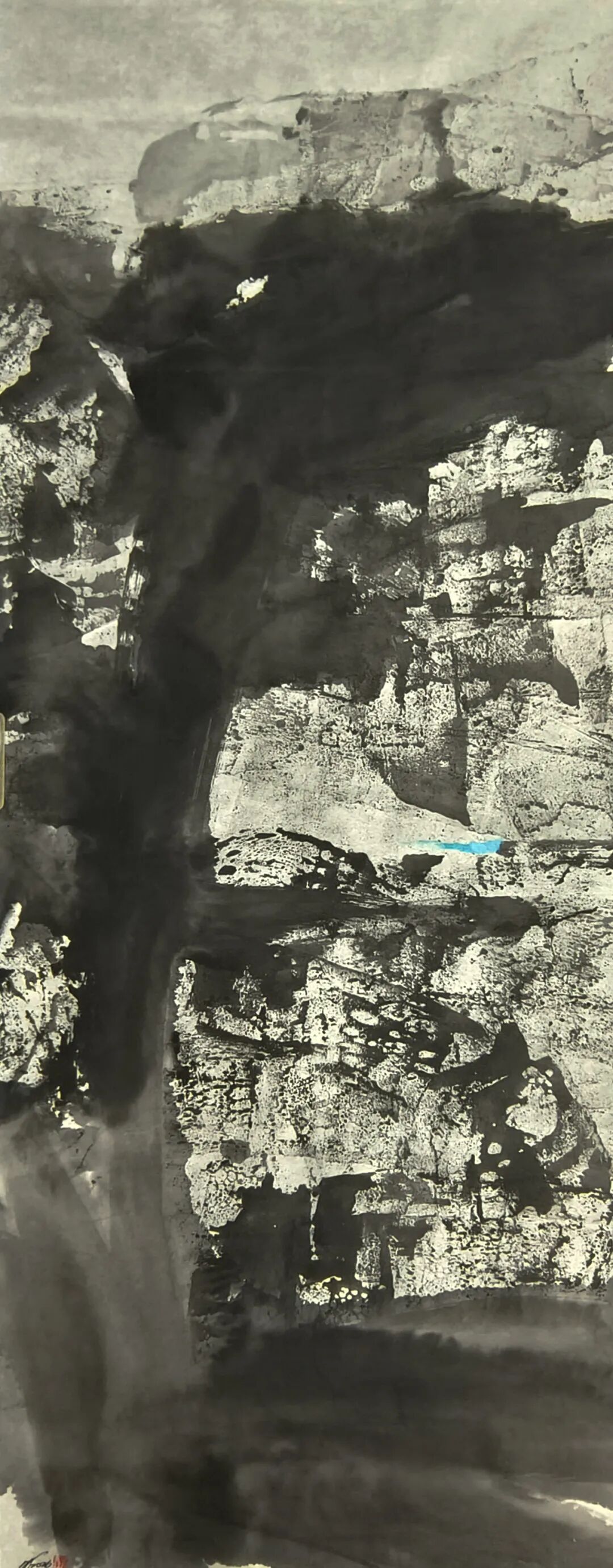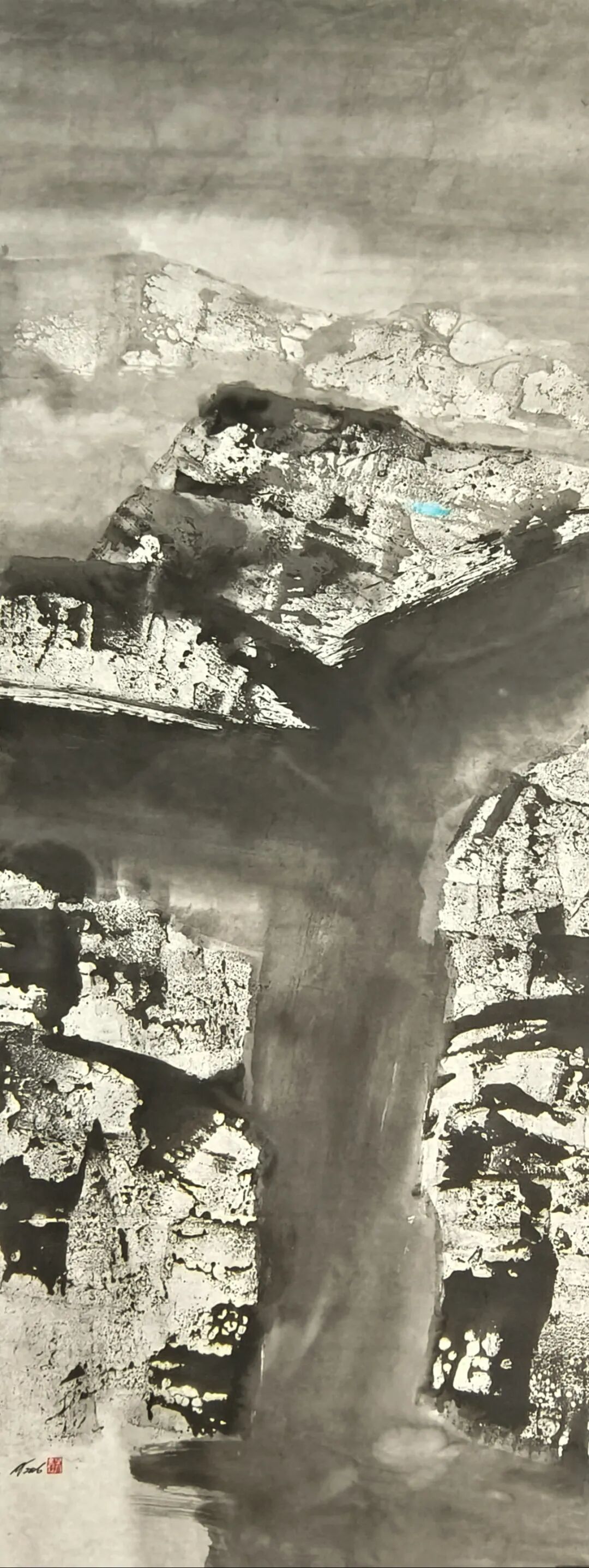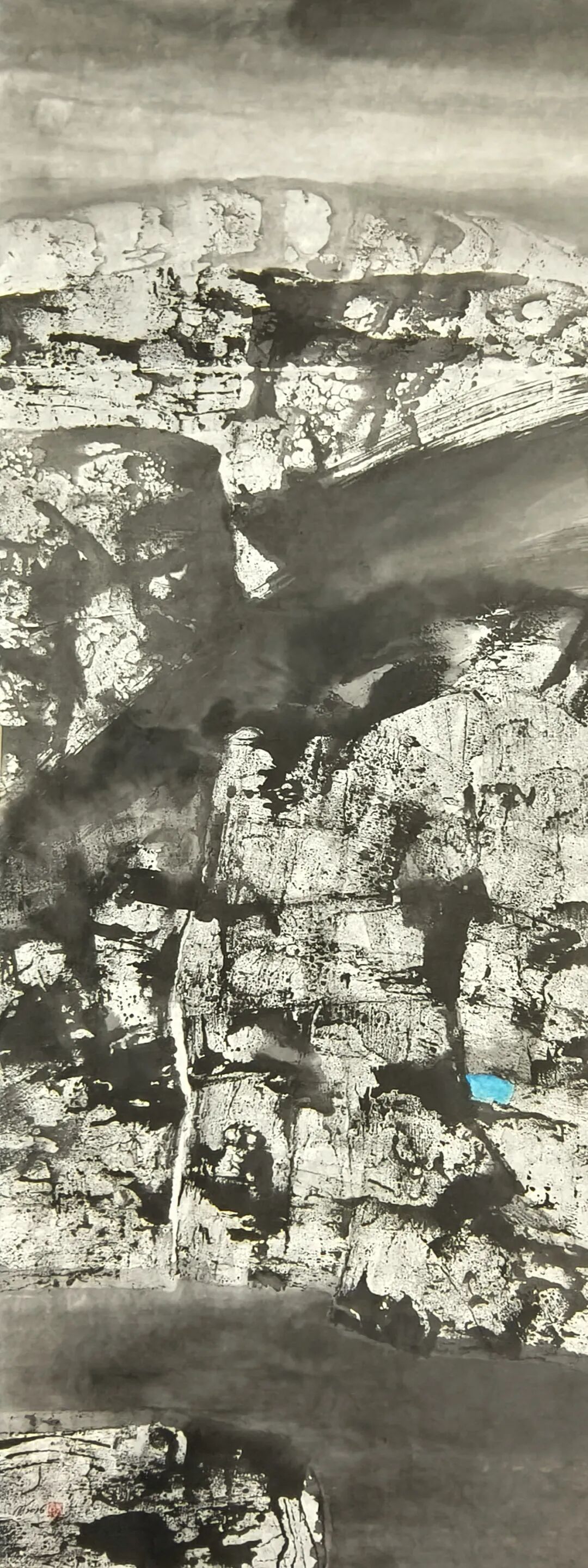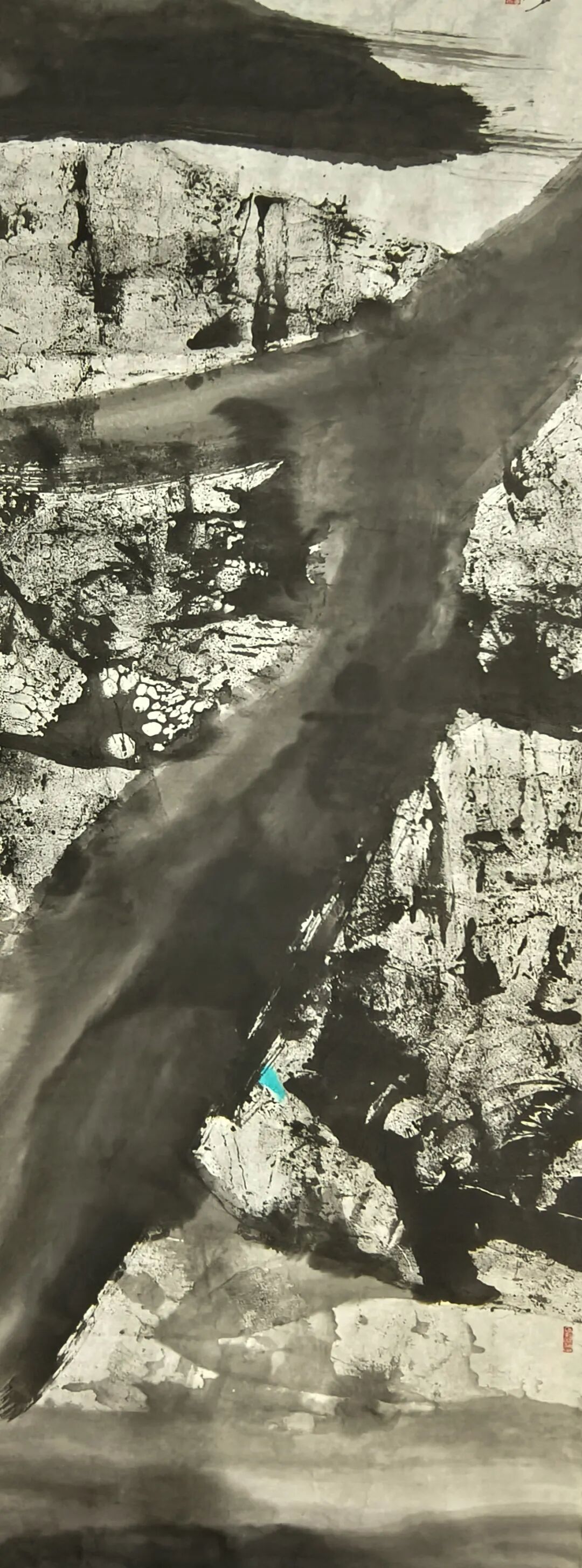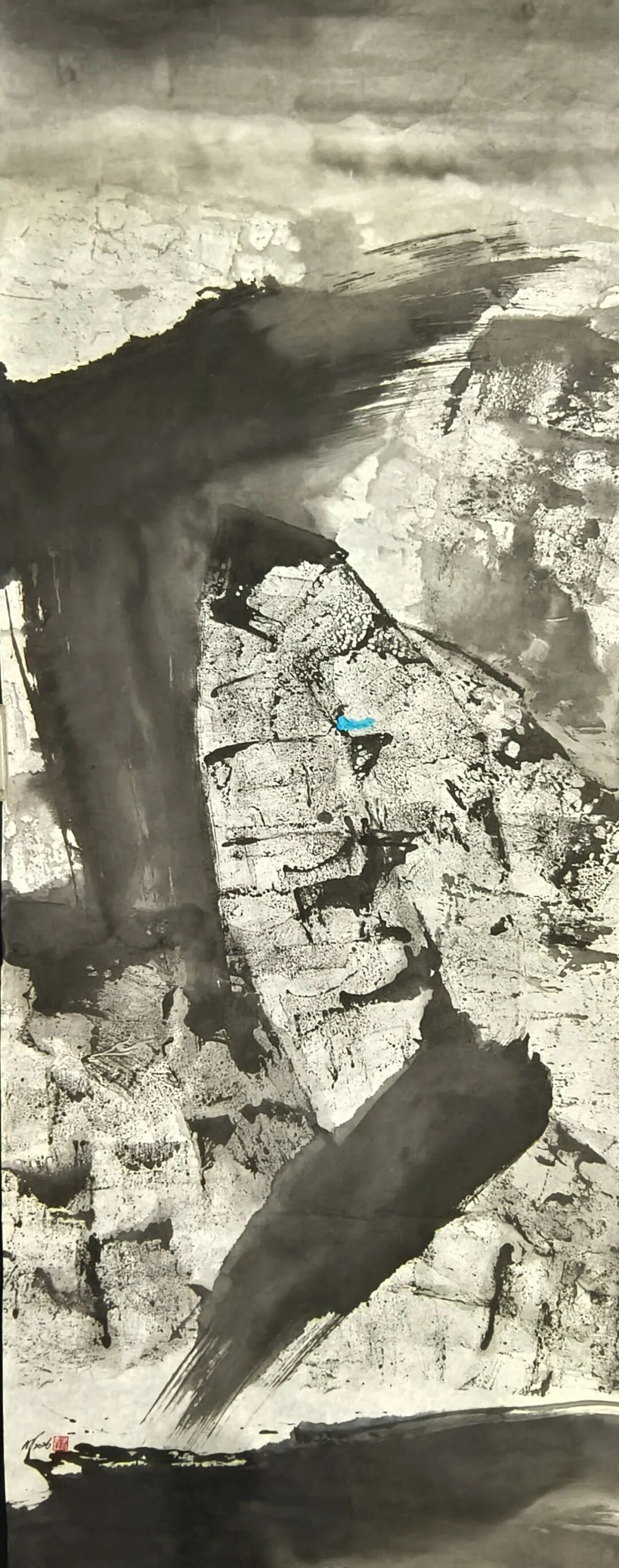 在他的笔下,峡谷的嶙峋怪石不再是温婉的写意勾勒,而是通过浓淡干湿的墨色叠加、枯笔焦墨的擦刮皴擦,形成丰富的肌理层次。墨色的堆积如岩层的褶皱,枯笔的飞白似山石的裂纹,刀刻般的笔触则赋予画面一种雕塑般的质感,仿佛能触摸到峡谷岩壁的粗糙与坚硬。这种技法的突破,让大山峡谷不再是静态的风景再现,而是充满生命律动的精神载体。