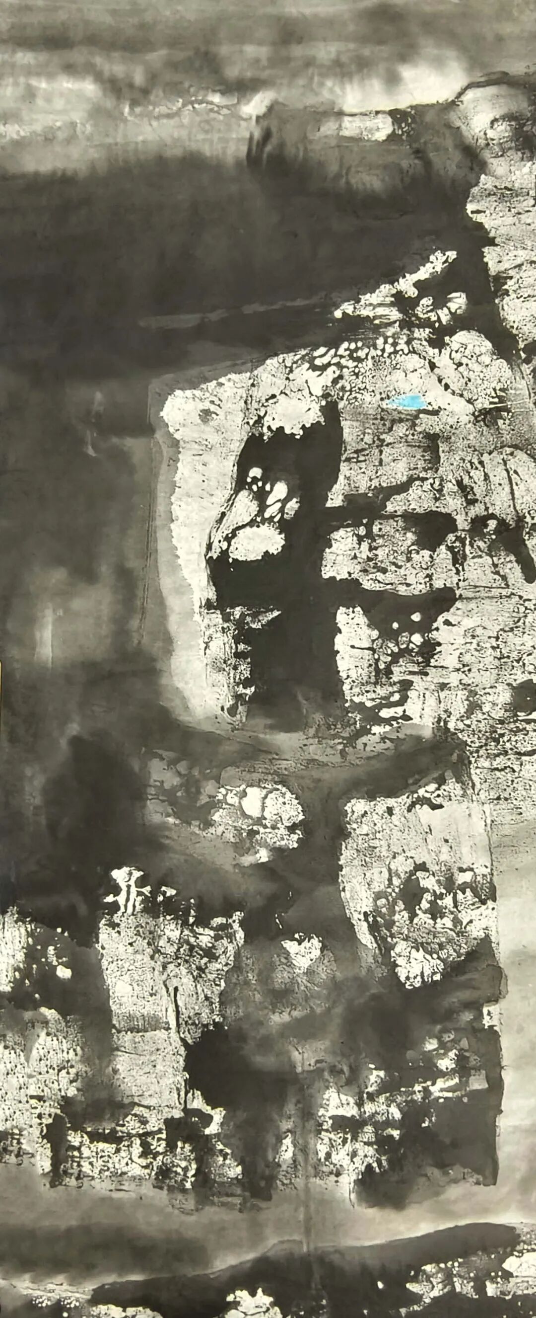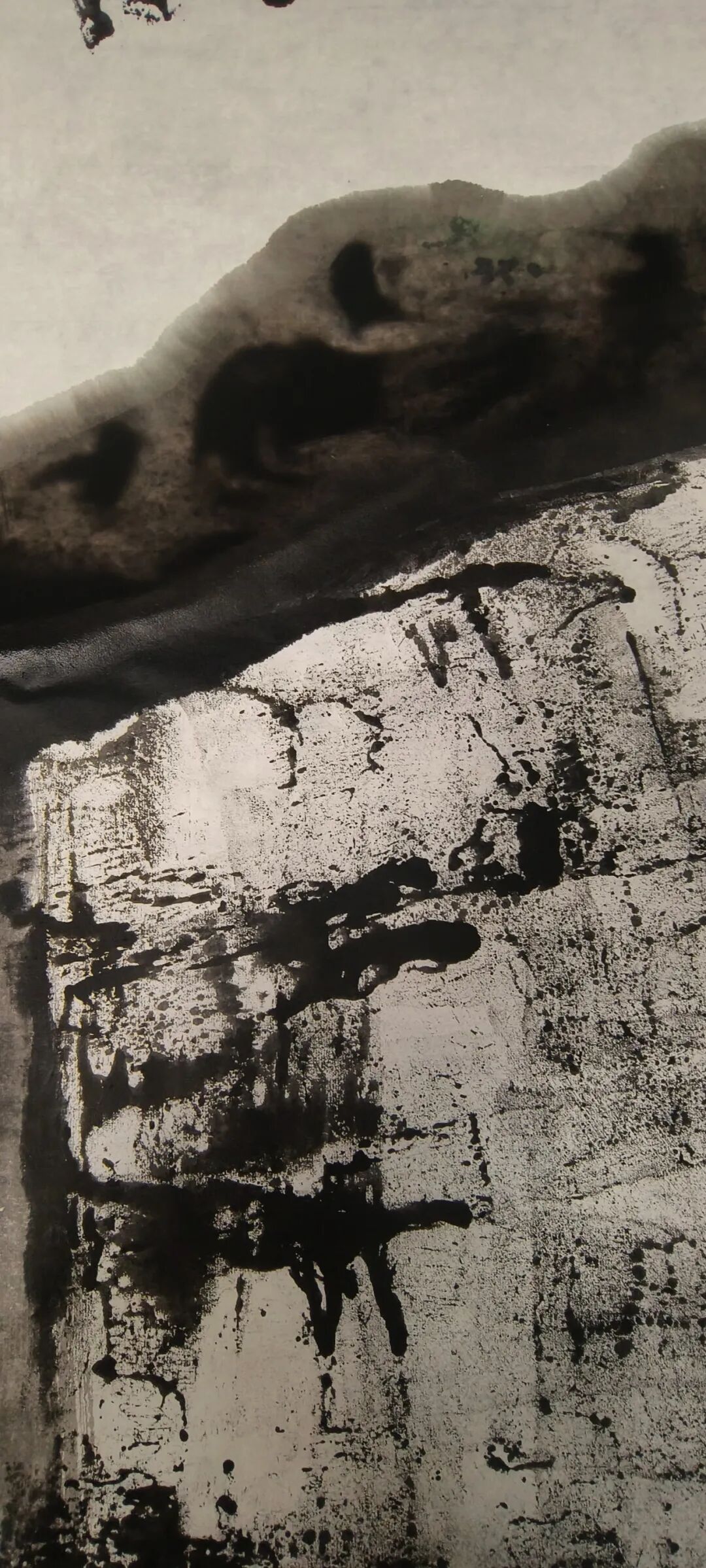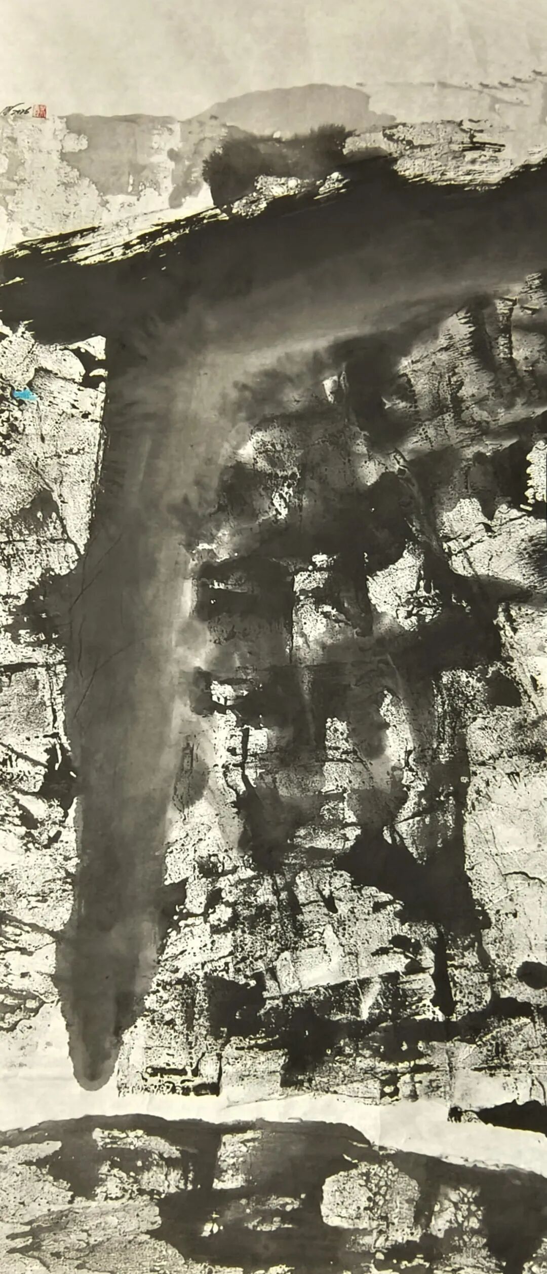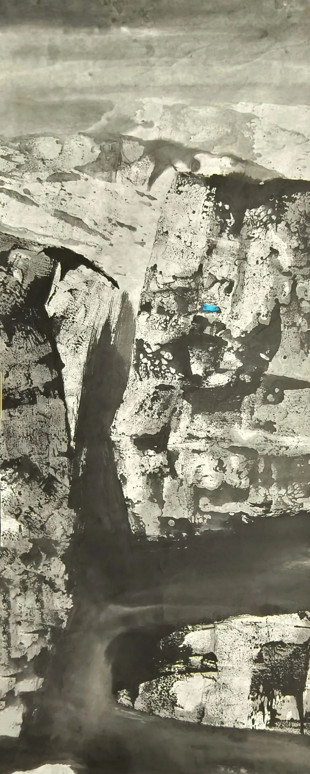 在他的笔下,峡谷的嶙峋怪石不再是温婉的写意勾勒,而是通过浓淡干湿的墨色叠加、枯笔焦墨的擦刮皴擦,形成丰富的肌理层次。墨色的堆积如岩层的褶皱,枯笔的飞白似山石的裂纹,刀刻般的笔触则赋予画面一种雕塑般的质感,仿佛能触摸到峡谷岩壁的粗糙与坚硬。这种技法的突破,让大山峡谷不再是静态的风景再现,而是充满生命律动的精神载体。