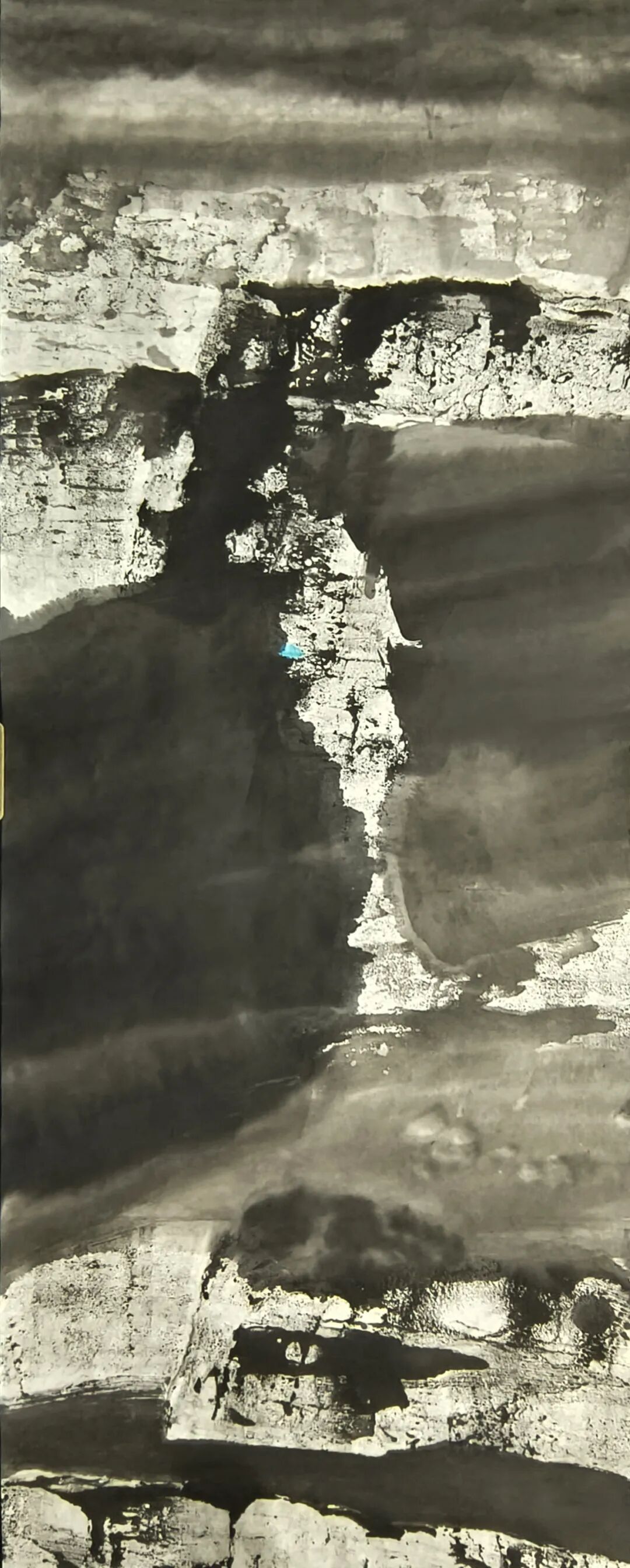 在构图上,米金铭摒弃了传统山水画“三远法”的平稳布局,转而采用更具现代构成感的视角。他常常将峡谷的纵向纵深与横向开阔并置,以大面积的墨色块面挤压留白,让画面形成强烈的视觉冲击。如《峡谷惊雷》中,浓黑的山岩占据画面主体,仅在缝隙处留一抹浅淡的云气,岩石的肌理与云气的轻盈形成鲜明对比,仿佛能听见峡谷间回荡的雷声,感受到自然力量的磅礴。