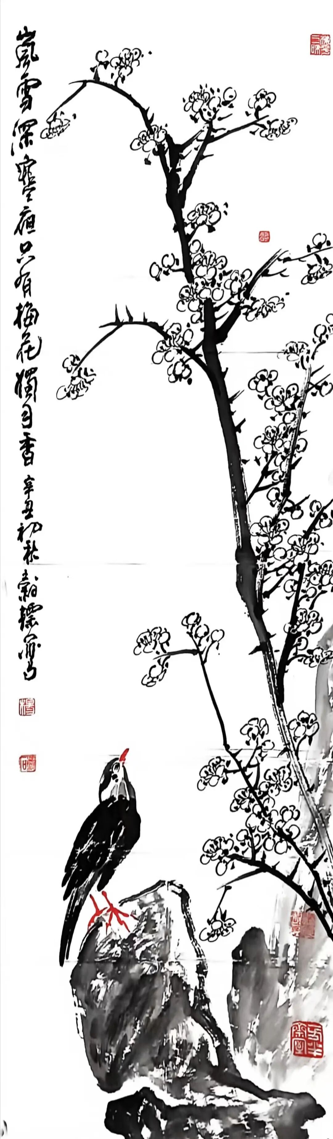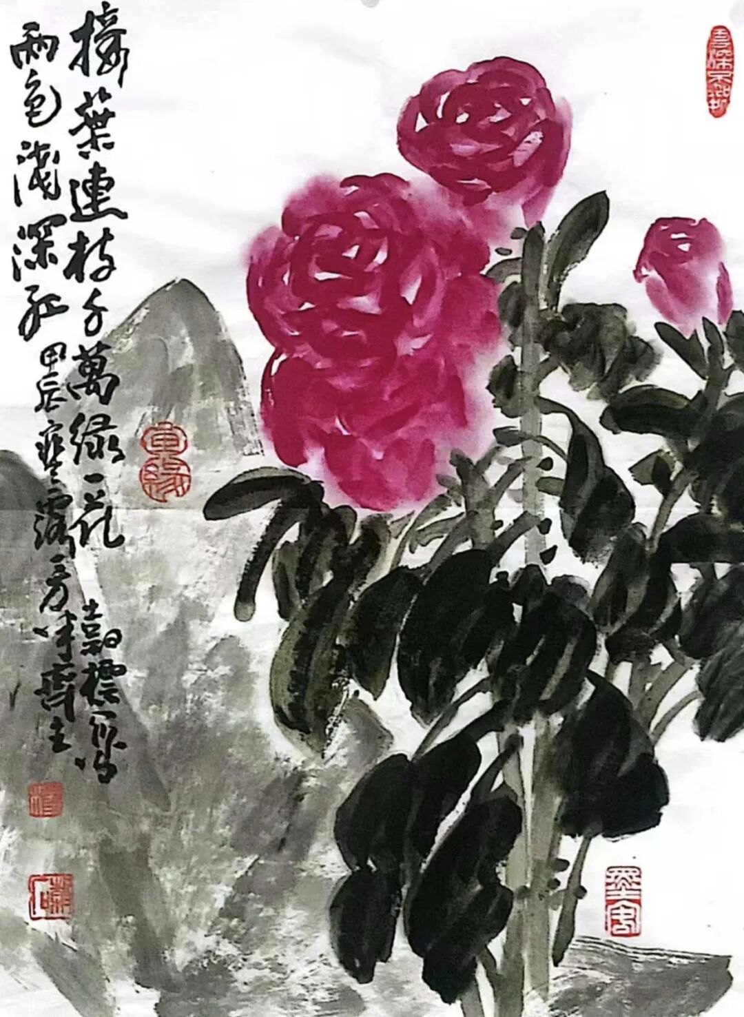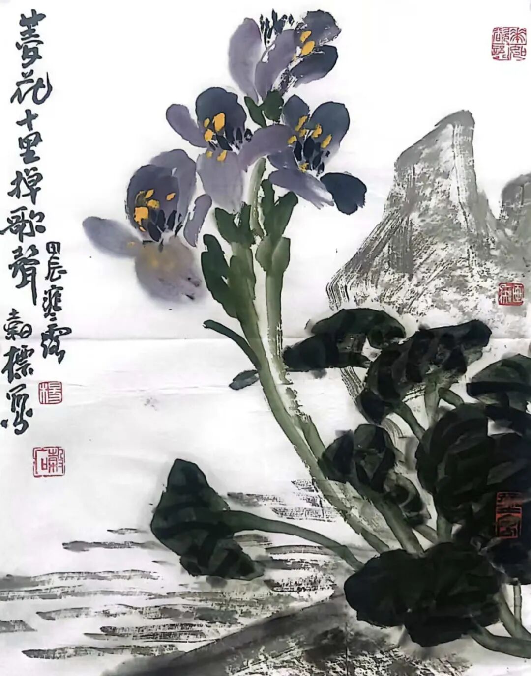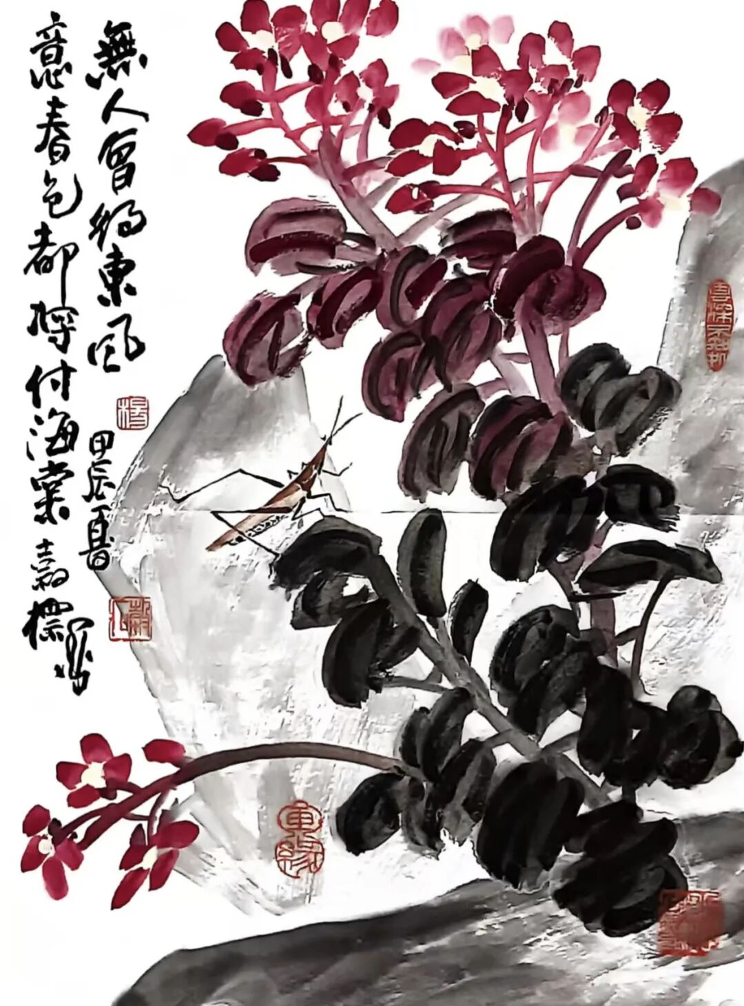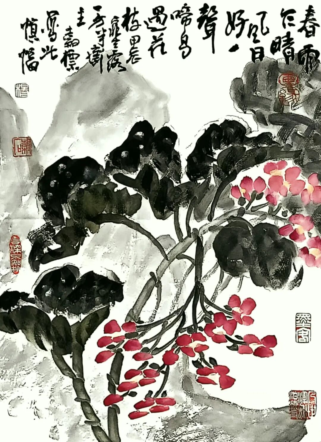 传统的中国画家喜欢画梅兰竹菊四君子或者画松竹梅岁寒三友。当然,中国花鸟画家并不只是画这些题材,潘天寿先生曾说:“创新不能单看,我以为从内容到形式,从题材到技法,从风格到意趣都要创新。”花鸟画创新的地盘大可开拓,花鸟山水画可在同一个画面上交融。潘老的“纪写雁荡山花”“小龙湫一角”诸多名作就是他在花鸟画与山水画相结合方面的尝试。