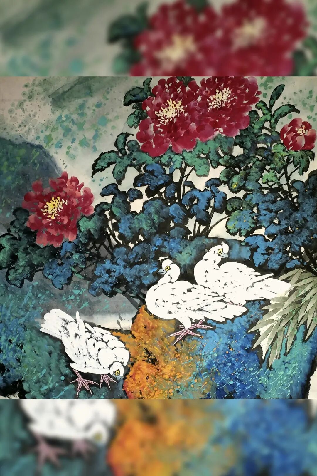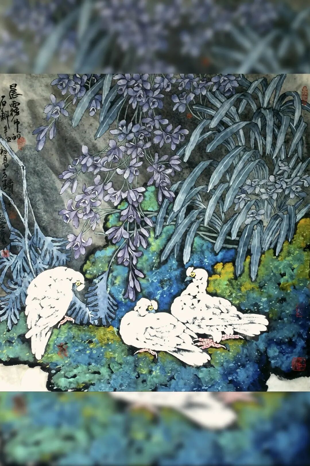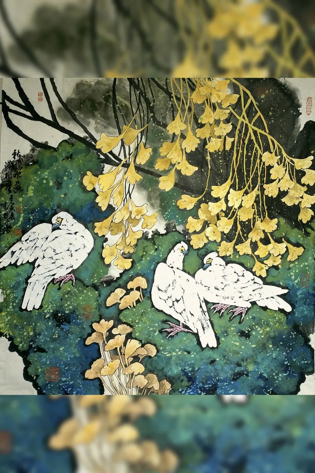 请读读他对作品的创作随想:满树银杏错落有致远近分明,水墨树干浓淡得宜层层叠叠,银杏叶在秋色的月夜中呈现一片金灿灿,仿佛鲜花散落人间,动中有静煞是好看。银杏树下溪水淙淙,白鸽伫立于坡石之上,顾盼生情安详宁静,聆听小溪潺潺的流水声,欣赏着大自然无限的美景.....此画中西结合兼长并用,将花鸟画与山水画技法浑然一体,粉彩添之泼墨墨上擦青粉绘丹鸟,写意中见笔,写实中见形,取自然之意趣得天然之真境。