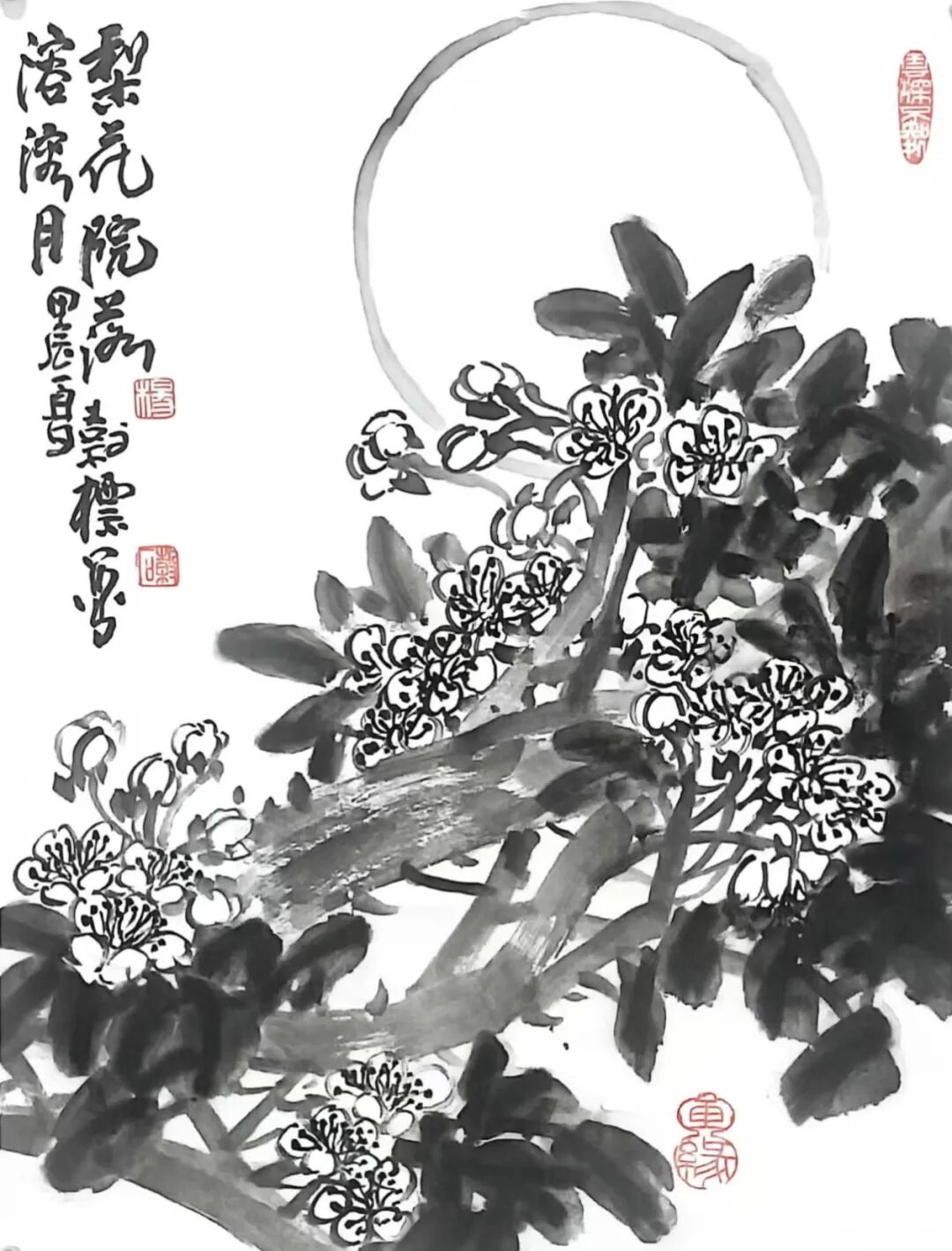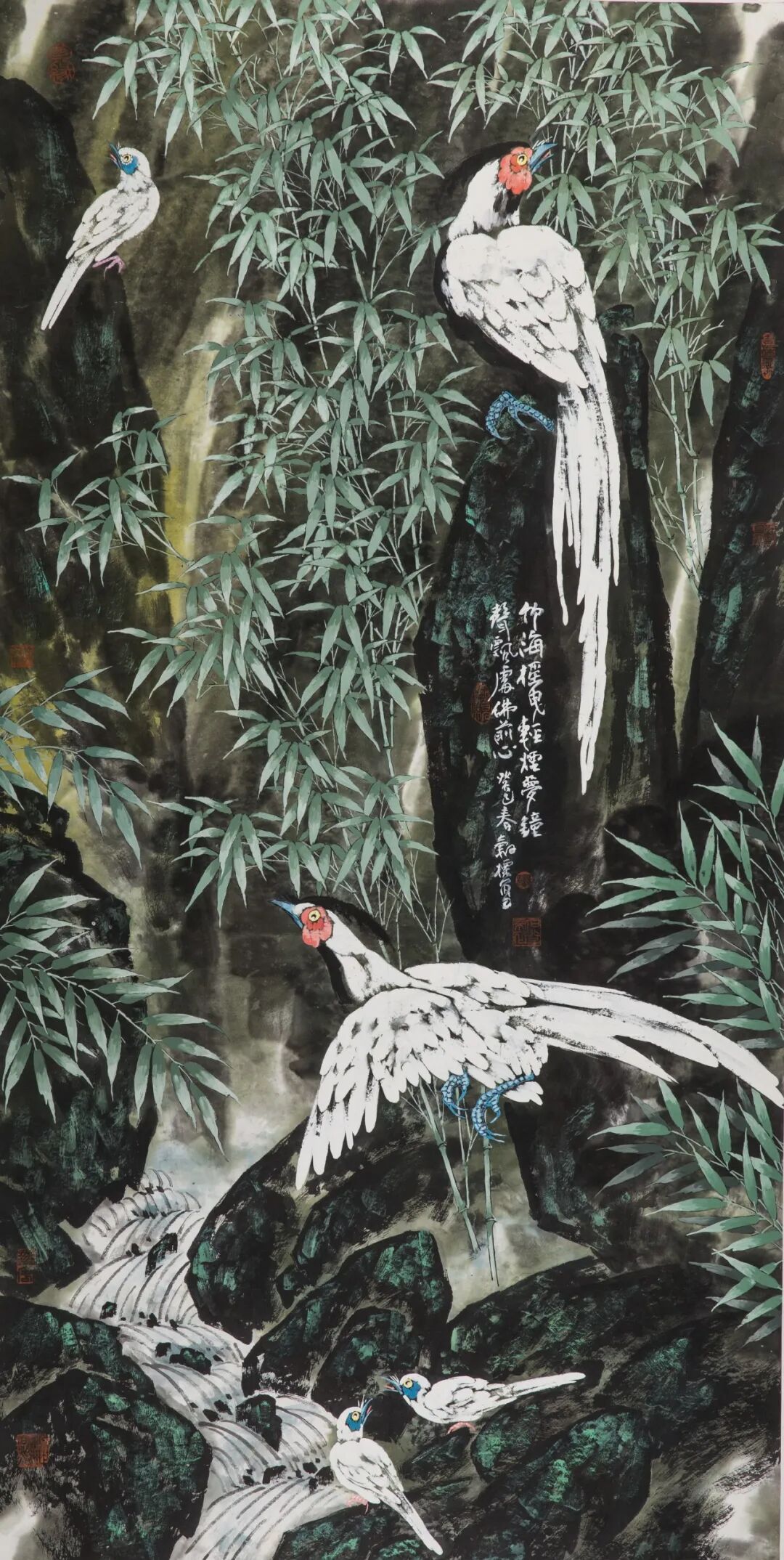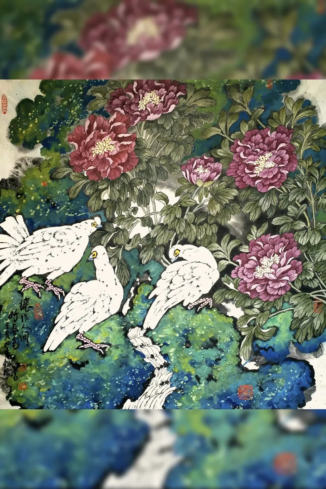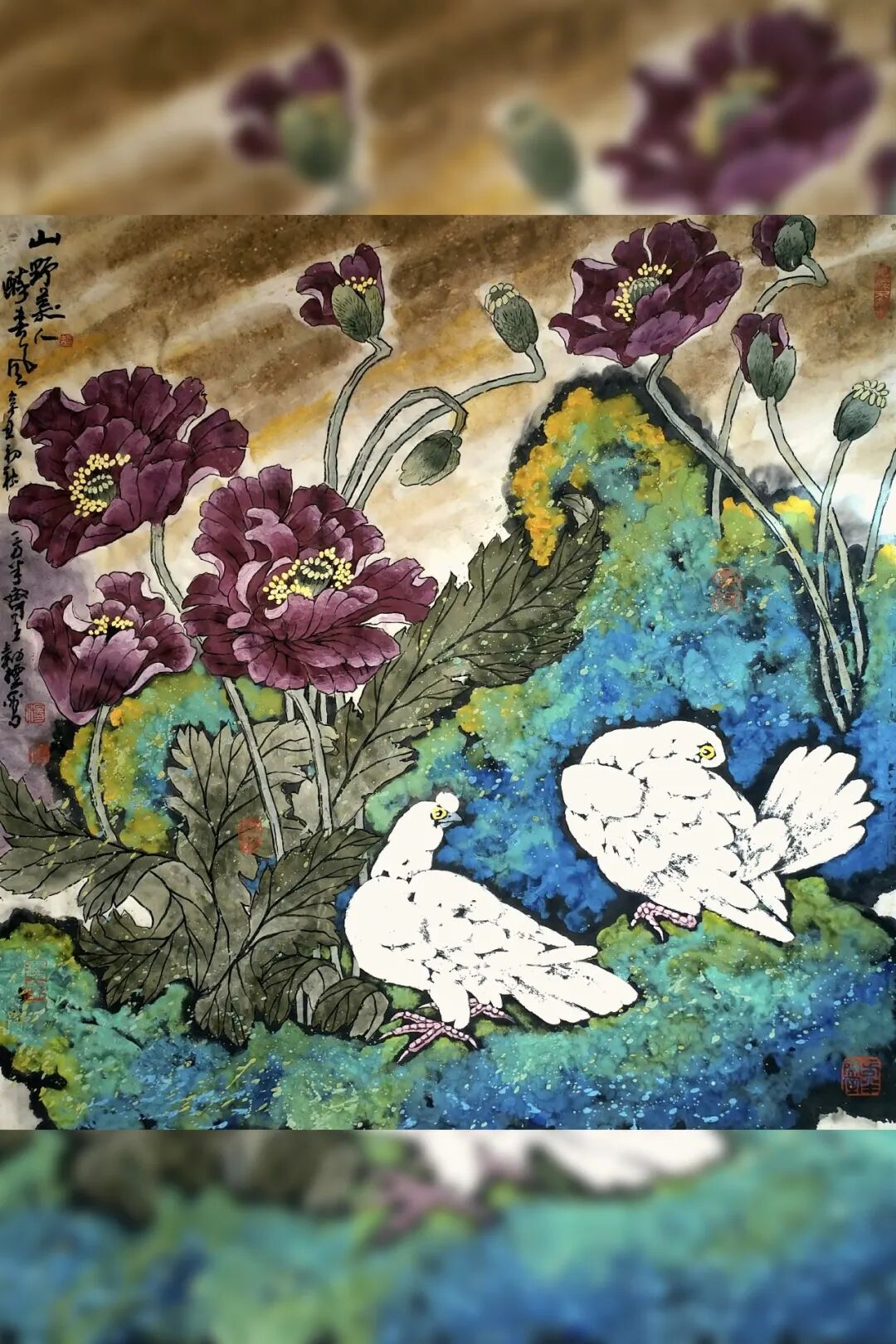 请读读他对作品的创作随想:满树银杏错落有致远近分明,水墨树干浓淡得宜层层叠叠,银杏叶在秋色的月夜中呈现一片金灿灿,仿佛鲜花散落人间,动中有静煞是好看。银杏树下溪水淙淙,白鸽伫立于坡石之上,顾盼生情安详宁静,聆听小溪潺潺的流水声,欣赏着大自然无限的美景.....此画中西结合兼长并用,将花鸟画与山水画技法浑然一体,粉彩添之泼墨墨上擦青粉绘丹鸟,写意中见笔,写实中见形,取自然之意趣得天然之真境。