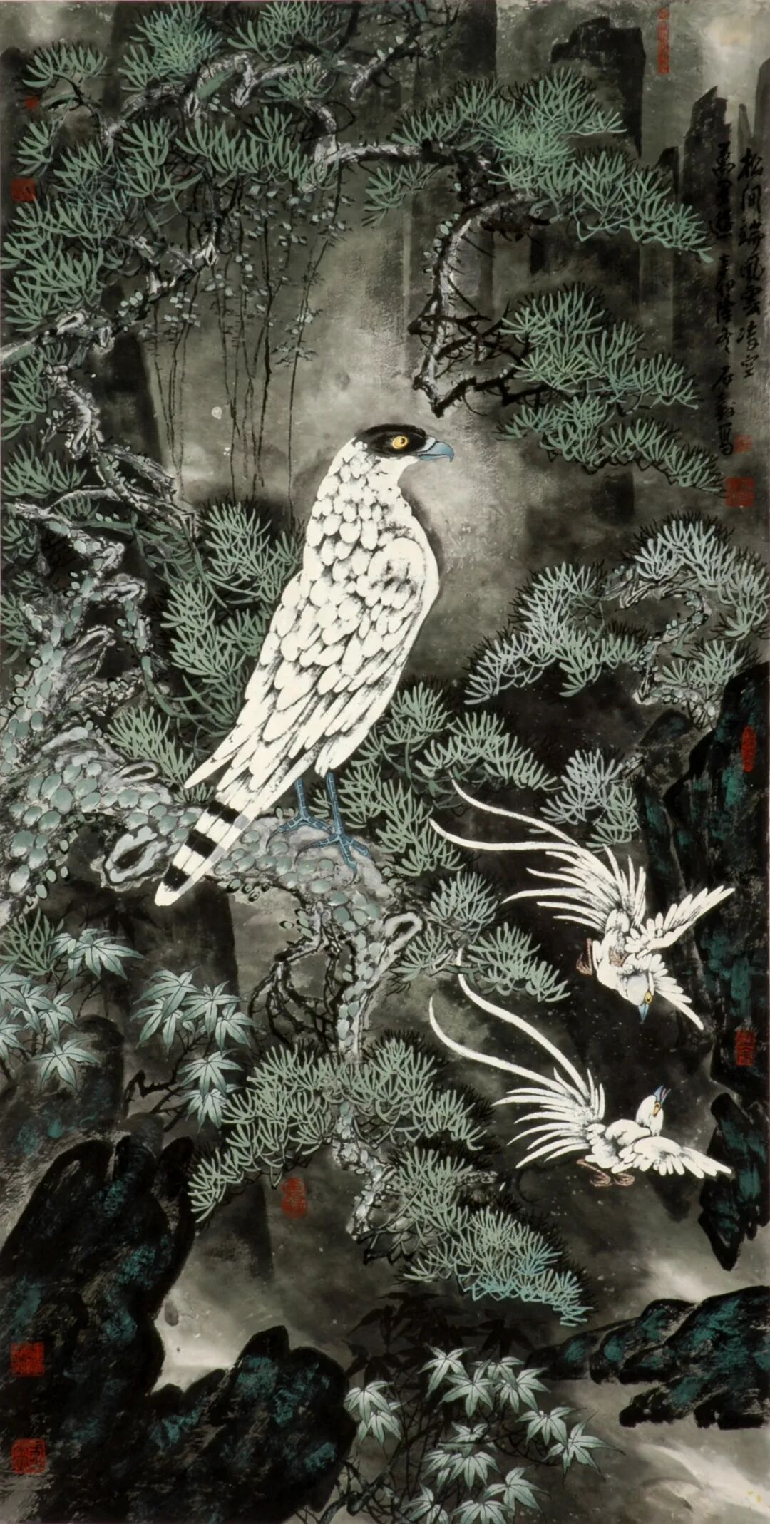 “双鹤同春孤山情”中画家画的白鹤用白粉勾点出仙鹤羽毛,细腻处不板滞,阔笔处不凌乱,准确生动颇具质感。“艳阳秋高图”画白鸡时用铅粉写出白鸡的片片羽翼,笔触大胆犹如用墨般轻松,雄鸡的尾羽穿插自如,坚挺的羽毛方显雄鸡的英雄本色,如此母鸡更显得其特有的温和亲切。“英风卓立”的白鹰用丹粉绘成的雄鹰造型准确神态生动,气势恢宏的笔笔羽翅似横扫千军,细腻而厚重的笔笔鸟身如万磊叠石。