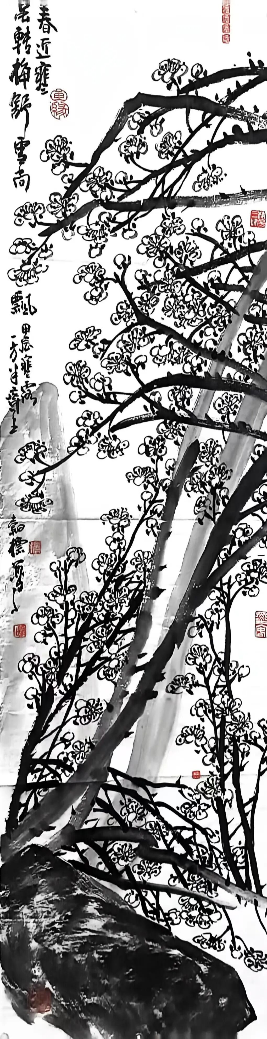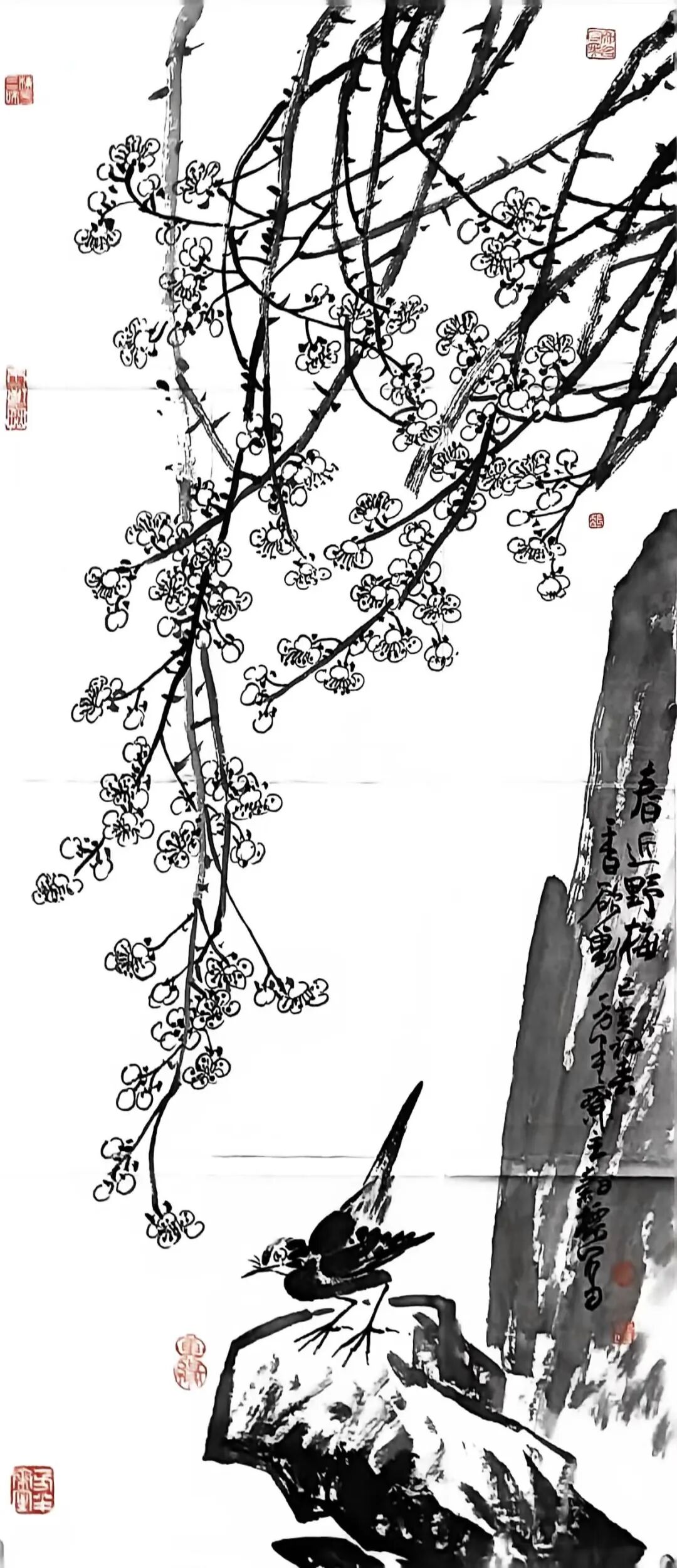 潘天寿先生说:“中国画的创新涉及两个方面,一方面对传统的下功夫刻苦磨练,另一方面必须创作新东西,既要有时代性又要有个性。”中国画的传统技法已沿袭千年,风格应该可以改变。杨谷标先生所画的花鸟画既重传统又不乏创新意识。“百花百鸟图”水墨画“寂静的山林”直至历时数年画成的千树梅花百只八哥,花鸟山水相结合的25米长卷“梅花鸲鹆图”可见对传统技法用力之勤。先生画过许多生动的水墨花鸟画,有时将传统水墨用之极妙。