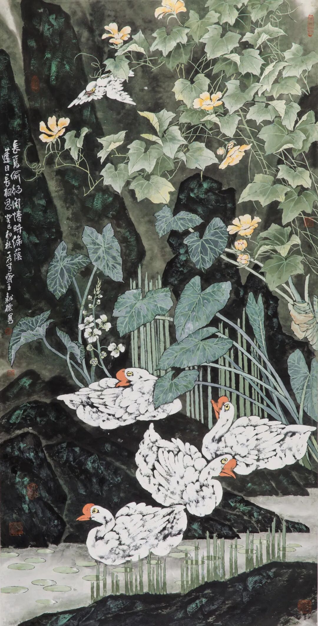 杨谷标对绘画的热衷已胜于一切,画之心境全在画图中。在“长夏偷得闲情时”一幅中先生是这样描述的:“绿郁葱葱的瓜叶迎风摆动风卷自如,淡黄色的丝瓜花散发着她特有的芳香。大片瓜叶似一把大伞筑起一道天然的遮阴篷帐,叶荫下几只白鹅相依簇拥依坡成趣。