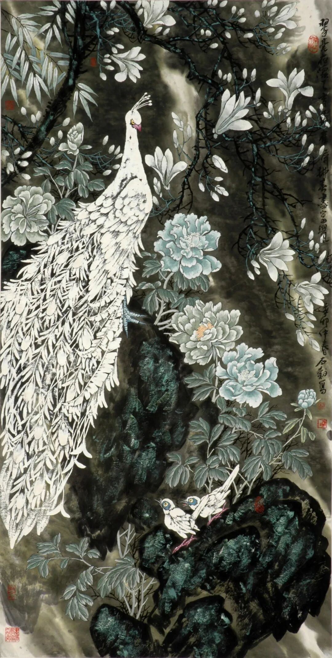 在先生的许多幅作品中如热烈奔放的“红枫鹦鹉”温馨迷香的“梅花八哥”清韵滴露的“白鹭树丛”柔情宁静的“银杏白鸽”和令你无限遐想的“孔雀牡丹”,正如画家所说:“我画白鸽的祥和吉福,白鹭的美丽温和,鹦鹉的玲珑乖巧,孔雀的富贵大气,这些都是老百姓喜闻乐见的,我将它们绘成一幅幅花鸟画作品挂在现代装潢的居室中品读经典,陶怡情操。”