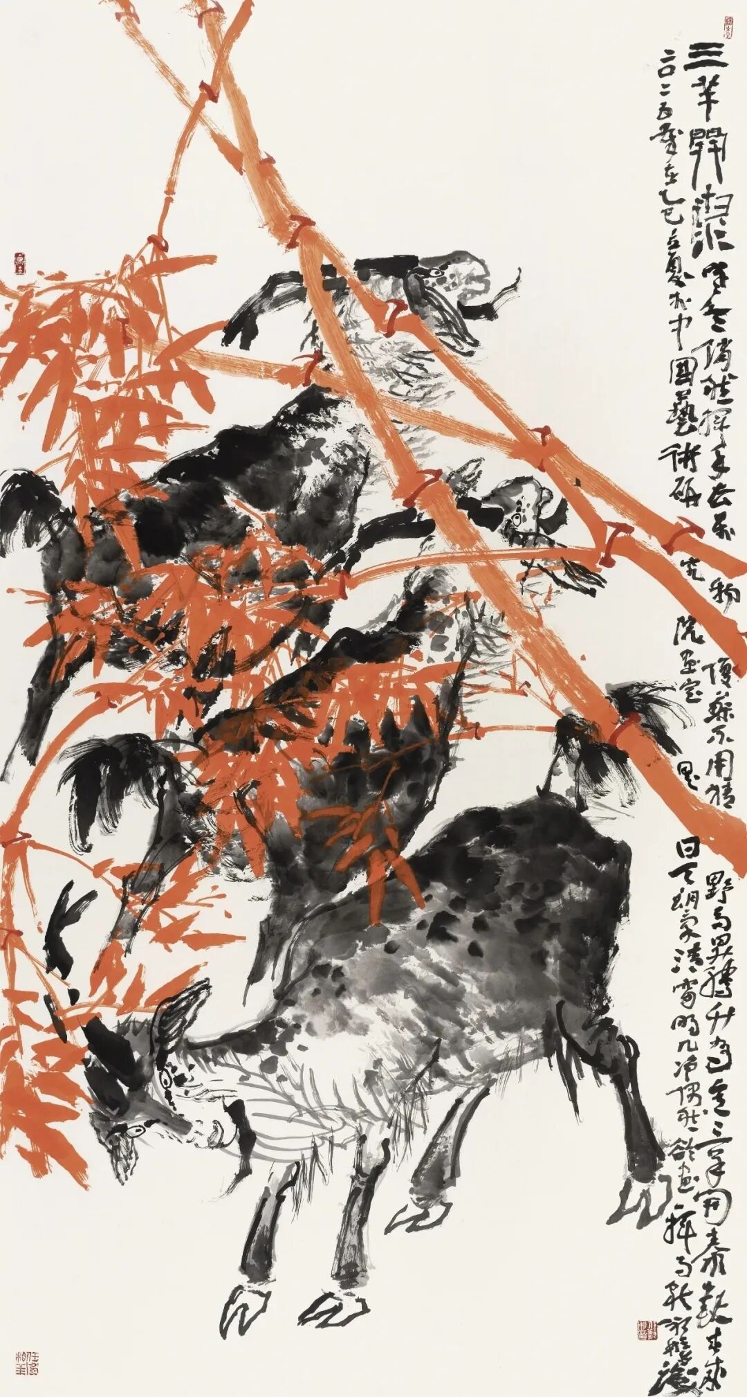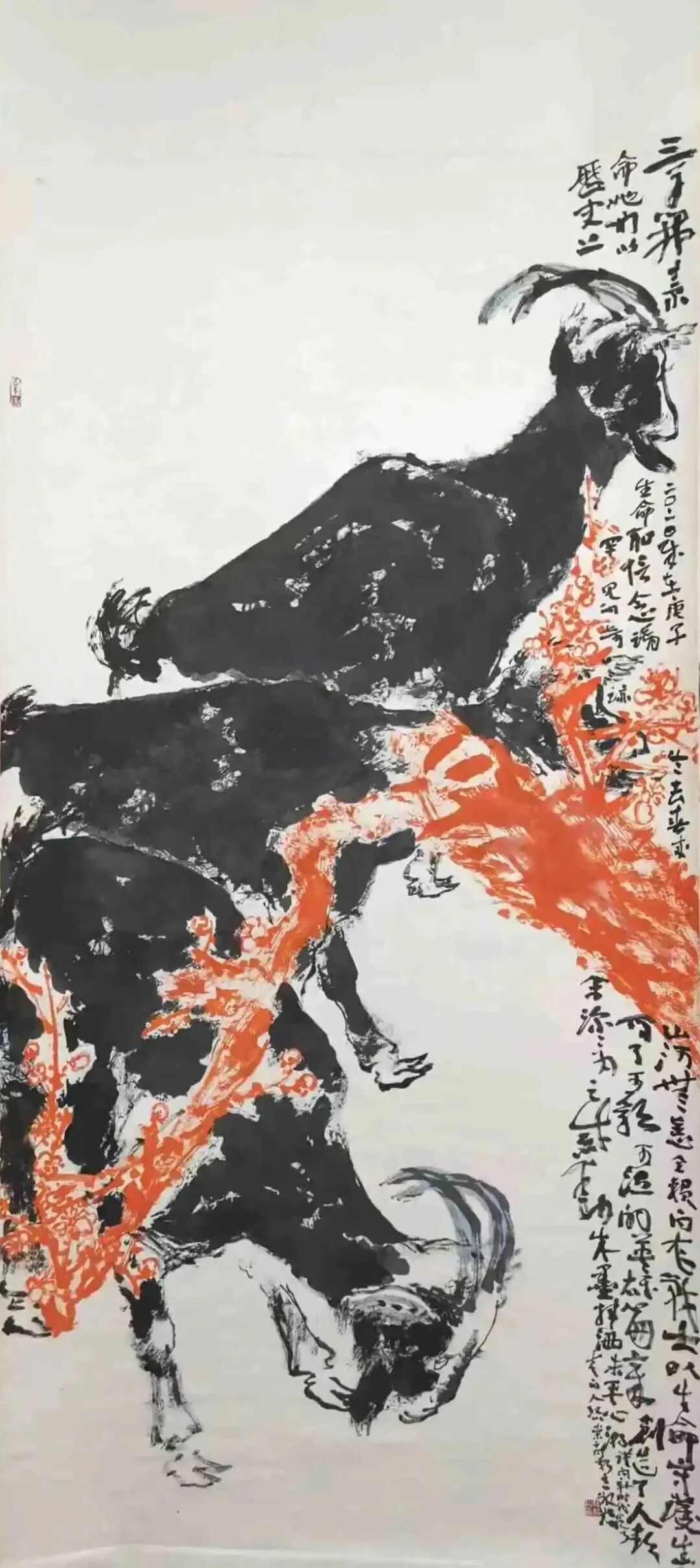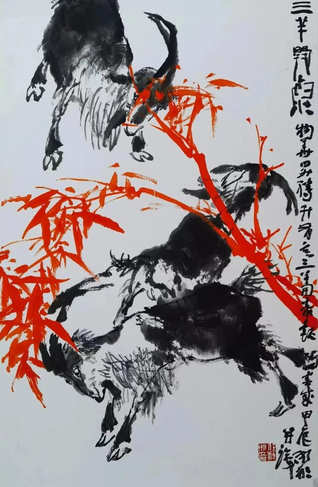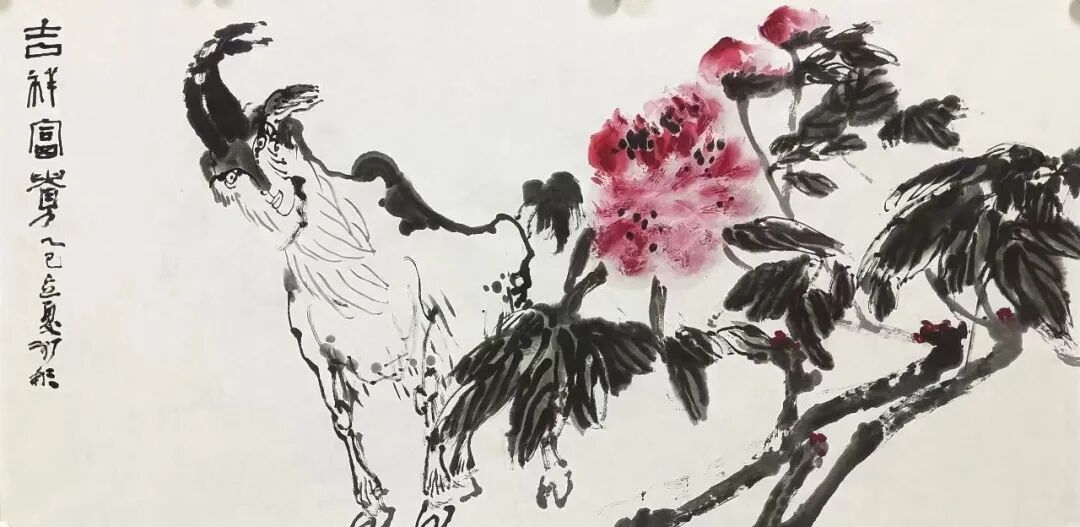 耳顺之年,在此思想指导下的追寻实践中,于是他又有了更多体验。有诗为证:其一:“是生愿许事丹青,日里挥写夜复梦,自信生来称钝手,一笔一划系真情”;其二:“是生愿许事丹青,日里挥写夜复梦,安得抟云蘸墨海,我以我心绘苍穹。”见其对绘画的痴情与壮心。其在巨幅小品画(高3.6米宽2.4米)高山之巅中题道:“羊为善良客,时登山之巅,拾级怀忧乐,欣慰望人间。”又见其对“羊”(说文中说:“羊者祥也”)的人格化描写和对人间疾苦悲欢的关照,悲悯之心可见。