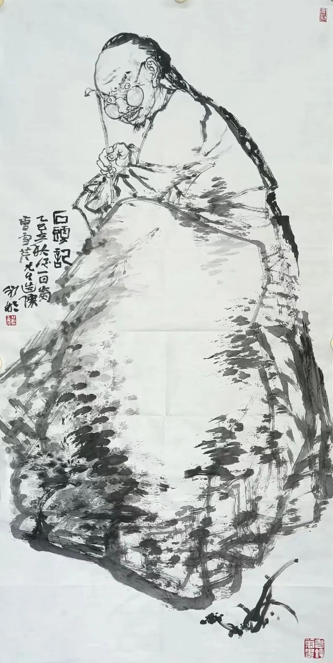 它表现出了作为一位画家应具有的深刻的人文关怀和时代责任,以及禀赋与情怀。而在他另一类人物作品中,如《老者》《萧大爷》《无题》《冬之惑》《画室的眼睛》中则既体现了画家深厚的造型根柢,也展示了他传统的笔墨修养。在这些充满了节奏与速度的线性组织中,极大地拓展了中国画的语言内涵,真正地体现了当代中国画的精神度高度与形式意义,可以说,这也正是任敬彬与一般意义上“学院派绘画”的迥异之处。至于在他近年所创作的《黄河魂》《草原精灵》系列、《双清图》等作品中,我们又惊喜地发现他的笔墨状态又有了一个可喜的变化和转捩,那就是再一次向传统回归。
