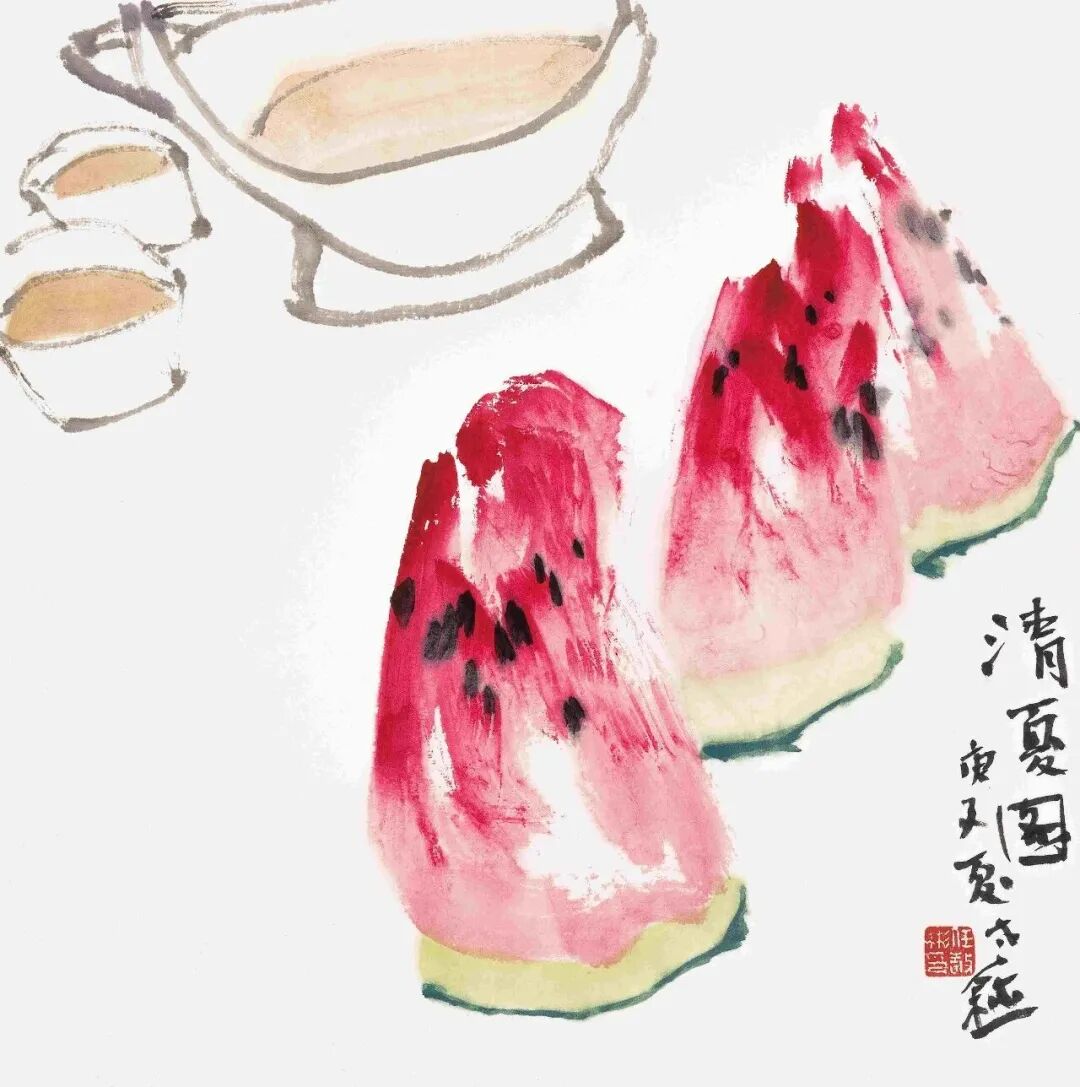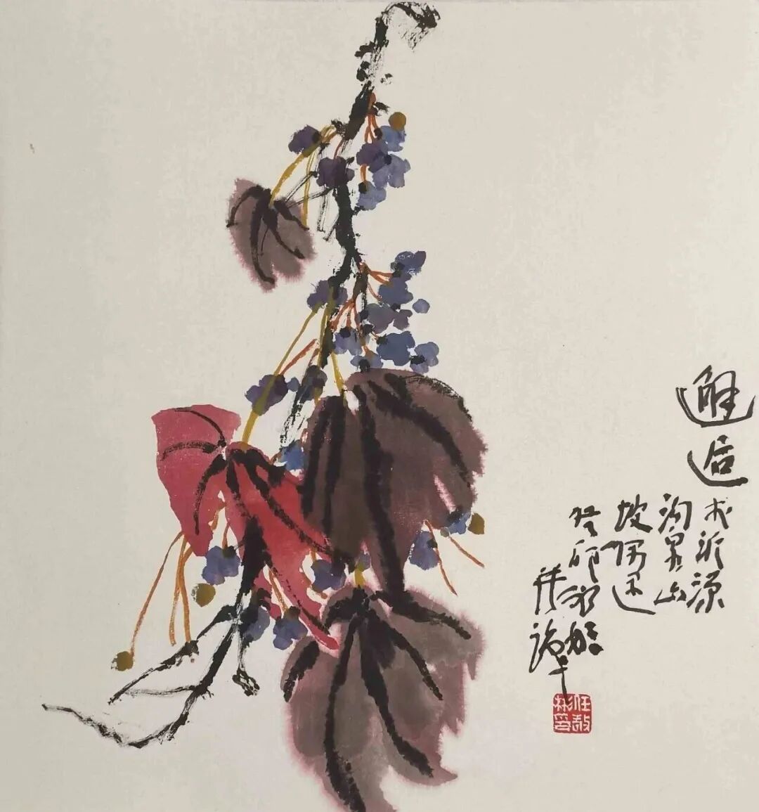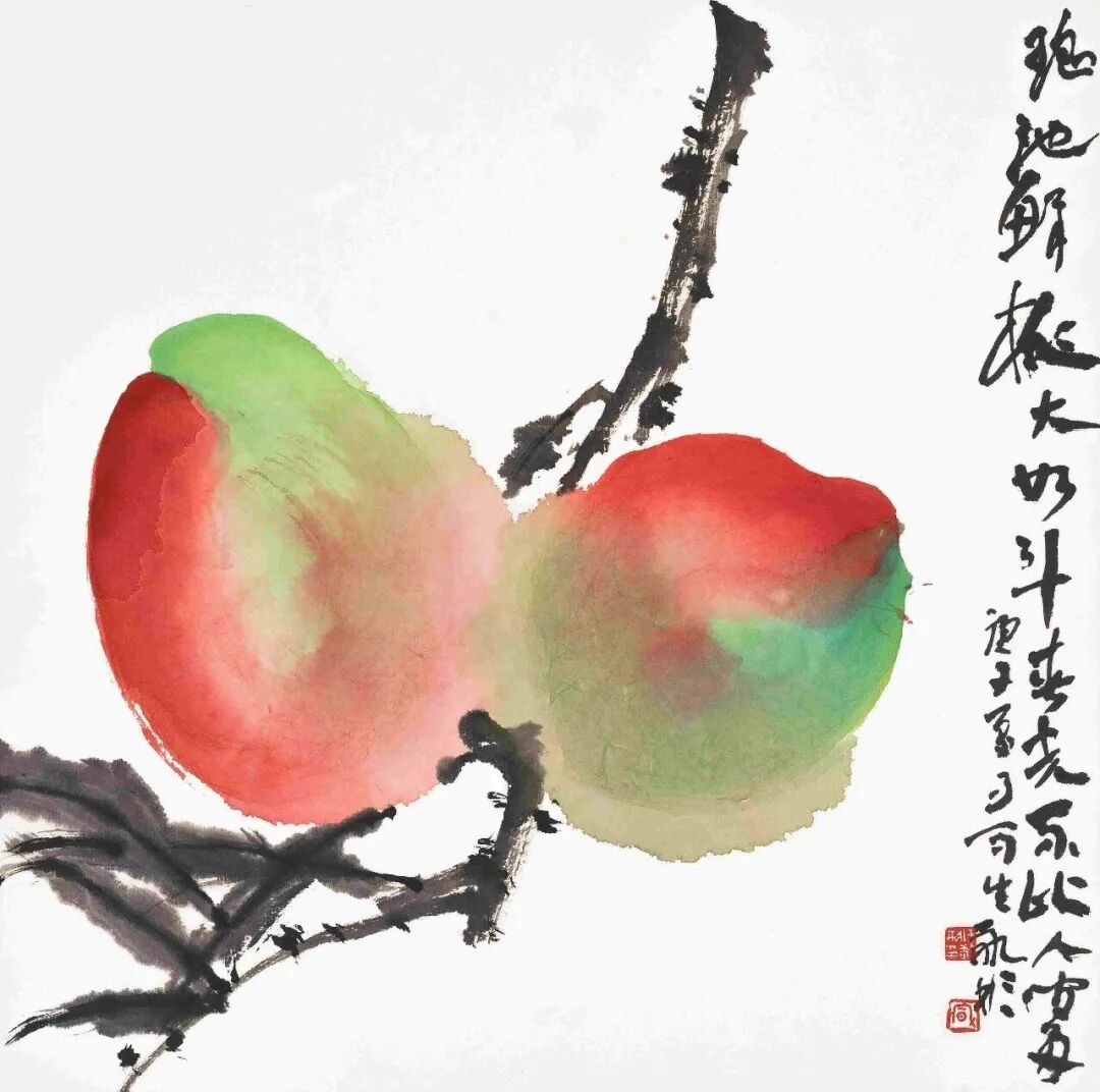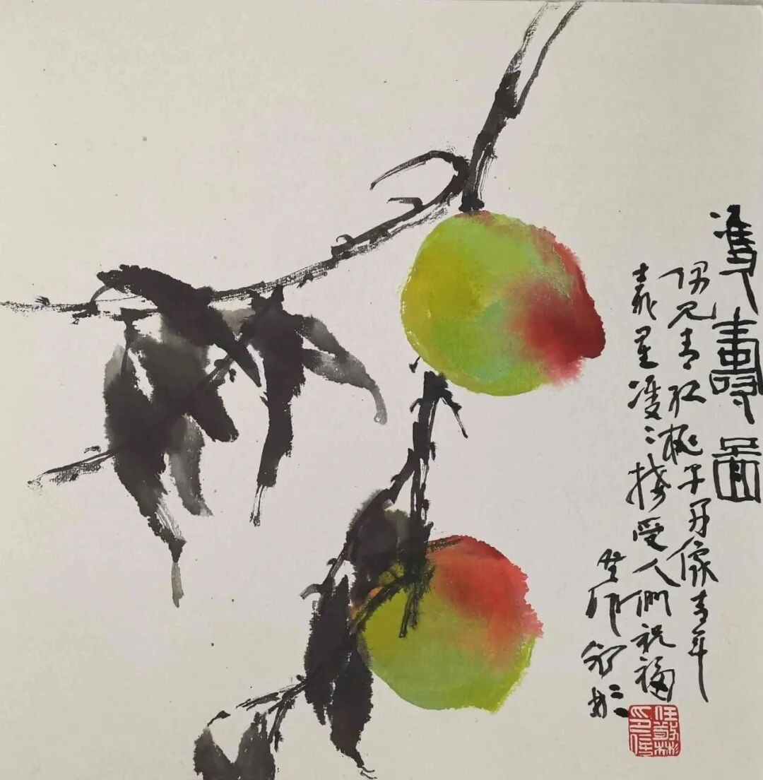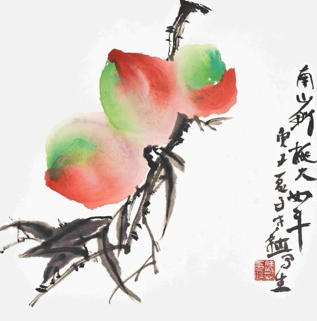任敬彬的南山桃李系列小品近作,让我眼前一亮似有共鸣。于是有下面这些话。我与任敬彬相识相交多年,其为人为艺诚恳执着印象深刻。其有两方章,一曰“雄逸境界”,一曰“我师我心”。是十几年前请一位朋友所制,表明其耳顺之年之前就开始的新追求。耳顺之年他刚从高校教职退休,作了“回眸思高远·任敬彬高教35年回顾展”——回眸有所思,所思谓高远。那是十几年前其刚刚告别其钟情的高教园丁生涯之际,有所不舍或意犹未尽?回忆丹青教学温馨岁月有所不舍?但,无论如何似乎的确没有一点歇歇的怡情,便开始了其“我师我心”的新境界的追求。在回顾美术高教生涯和学习绘画过程时,他说:“我拜访先生,于是知道如何对待学生;面对学生,更知道应该适时充实自己”。寥寥数语即可见其对教学工作和国画事业的殷殷情怀。