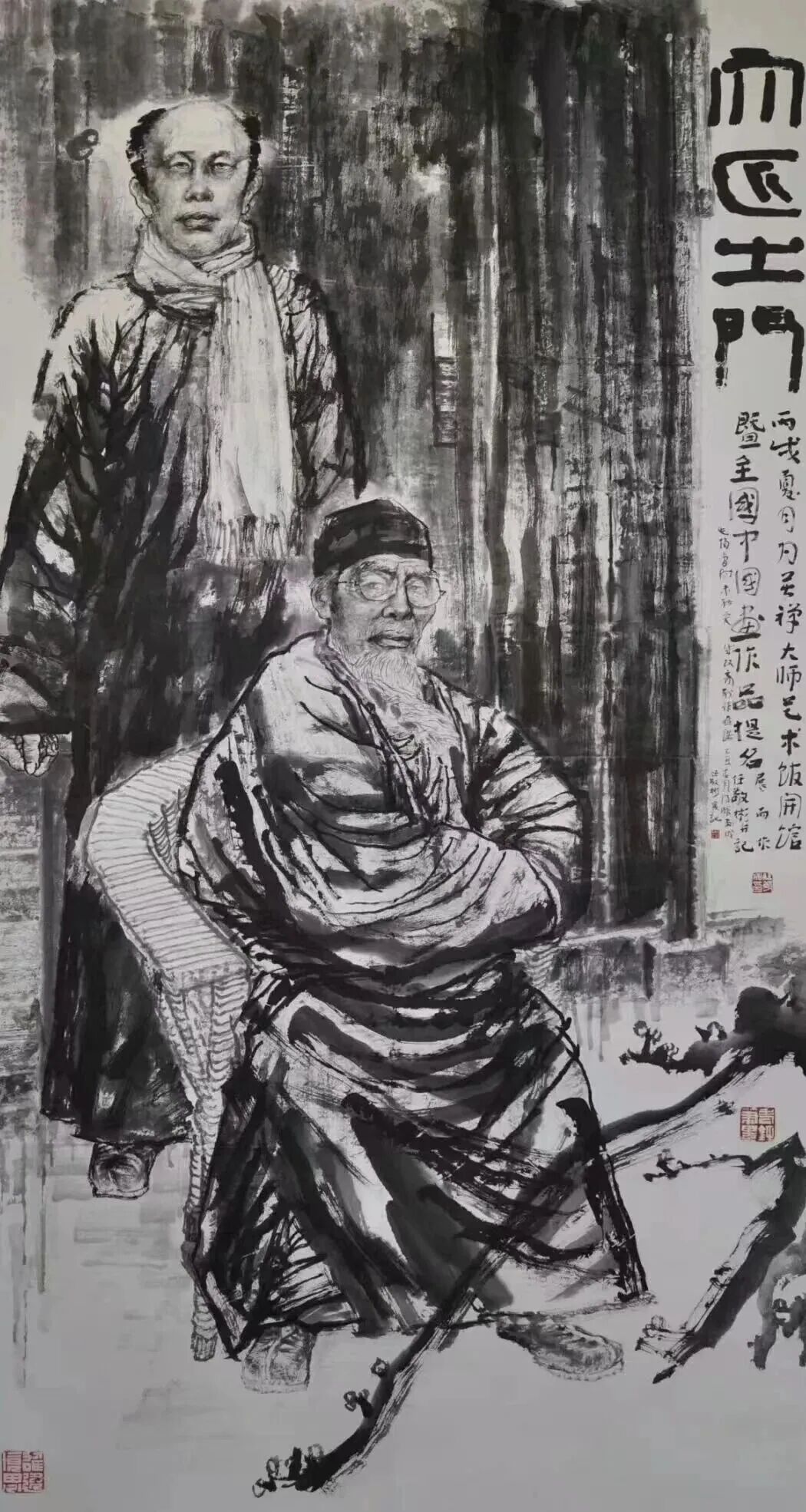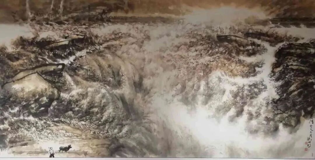 但我们看到,在任敬彬绘画作品中,虽然有“主题性”的立意在先,比如他的《黄河系列》,在表现浪涌奔流的激越中,不乏借鉴西画的手段与方法,但更多的还是传统中国画的水云线式,大量留白处还有“皴擦点染”充实其间。还有他以白石老人与李苦禅先生为题材的人像《大匠之门》,虽是“西式造型”,但其笔墨趣味却盎然于画面之上,长髯、衣褶交织的长线更体现了画家笔墨的趣味与修养。这对于一位从写实、造型、注重素描关系处走来的画家的确不是一件容易的事情。
