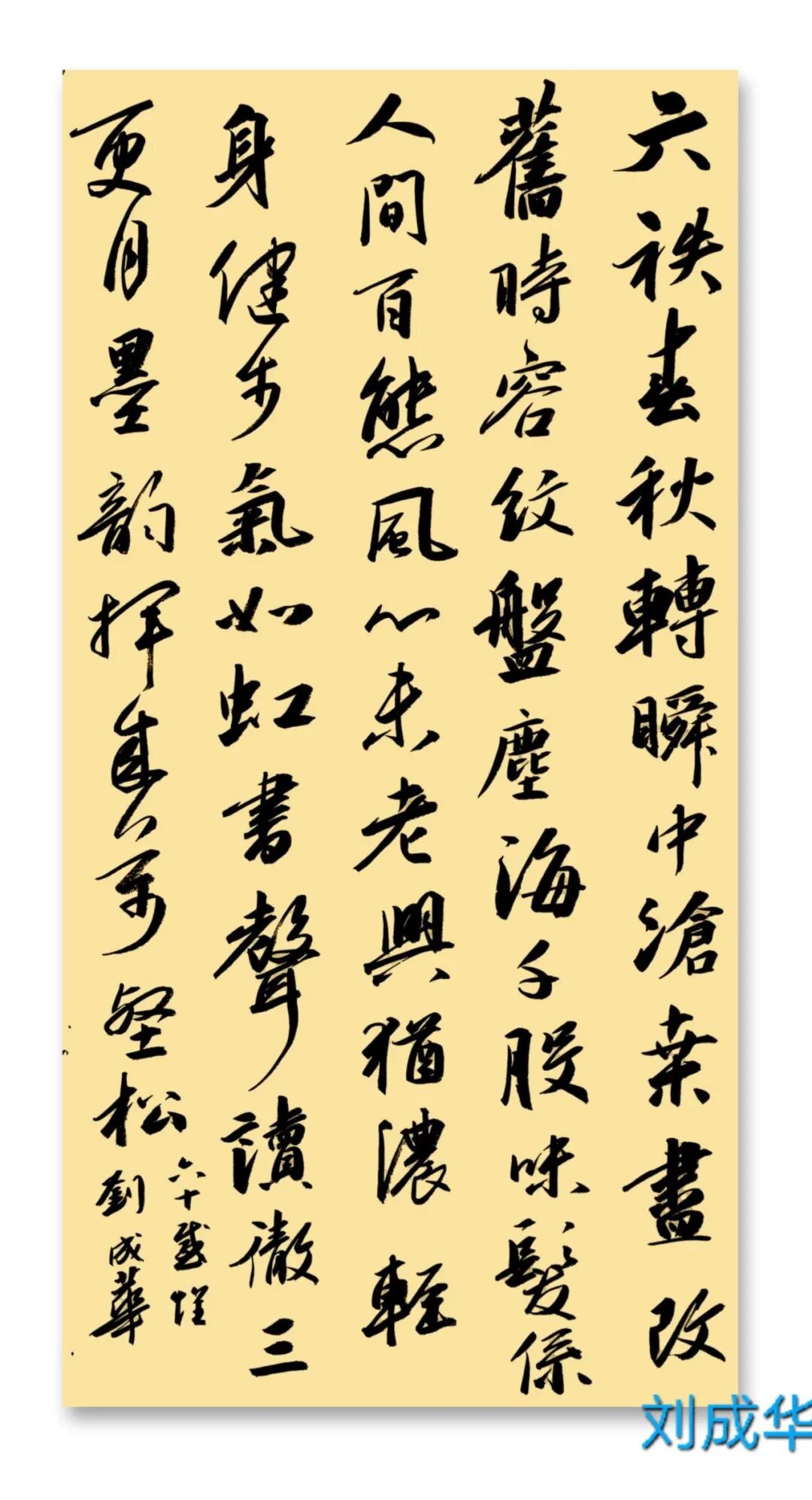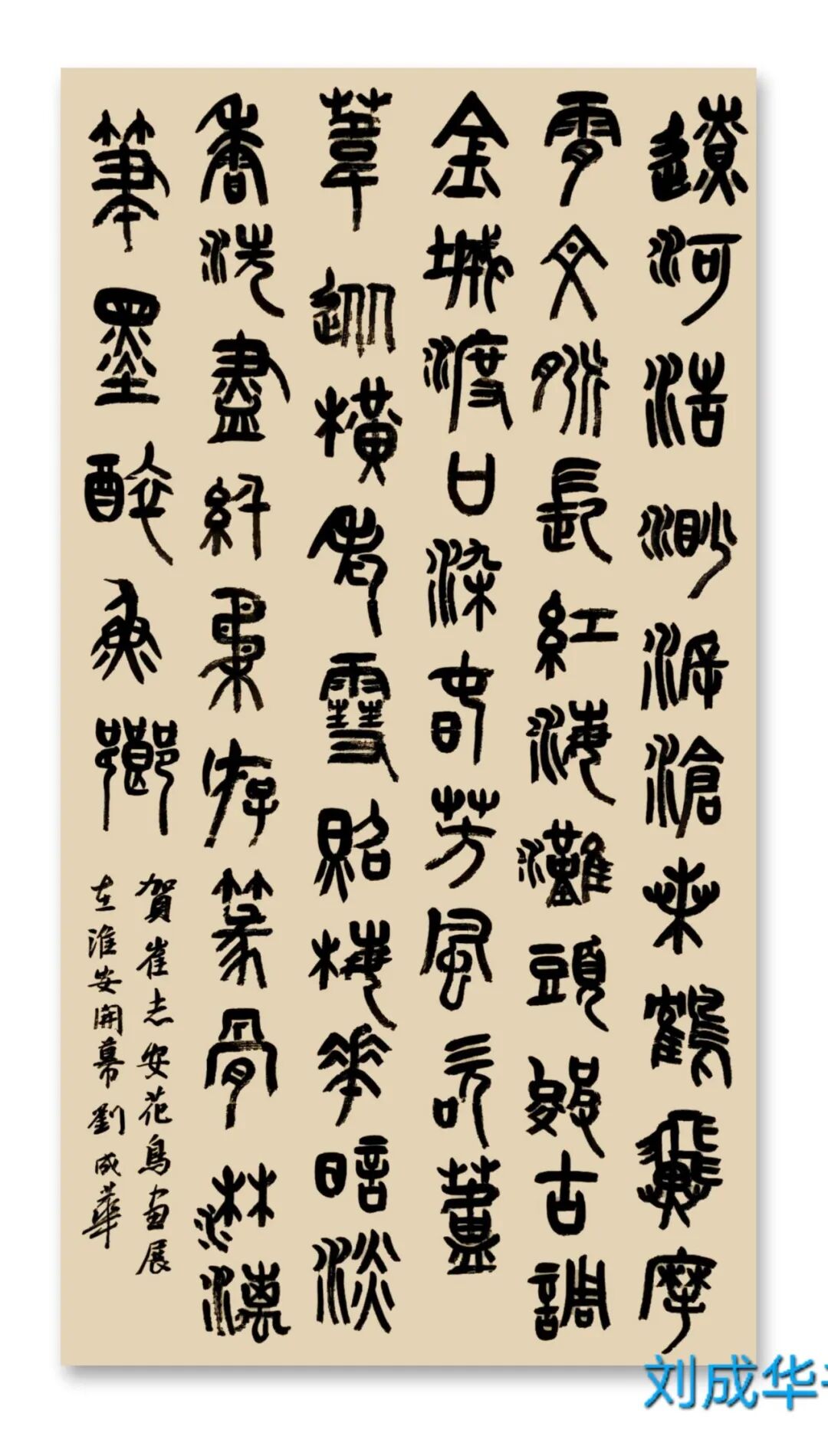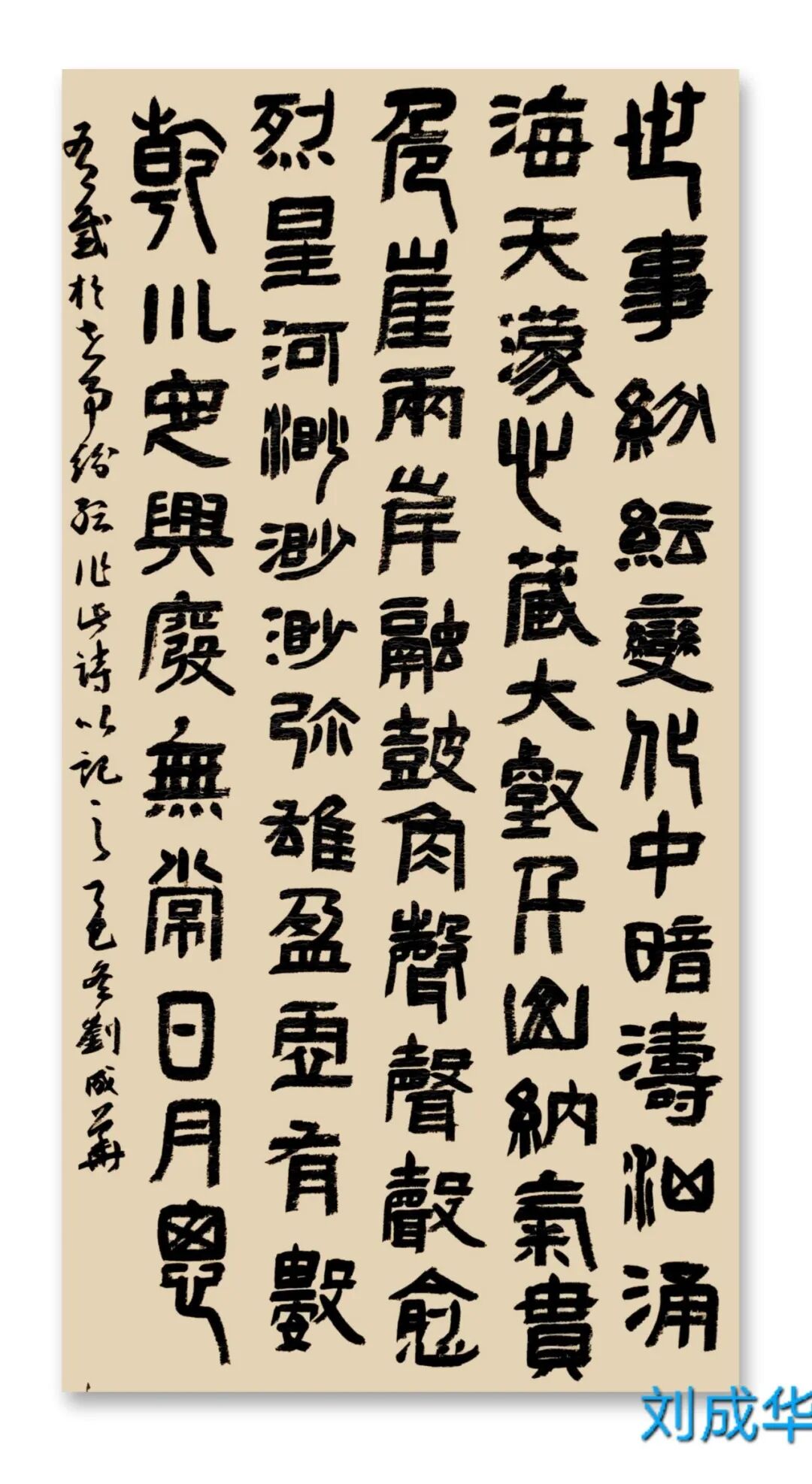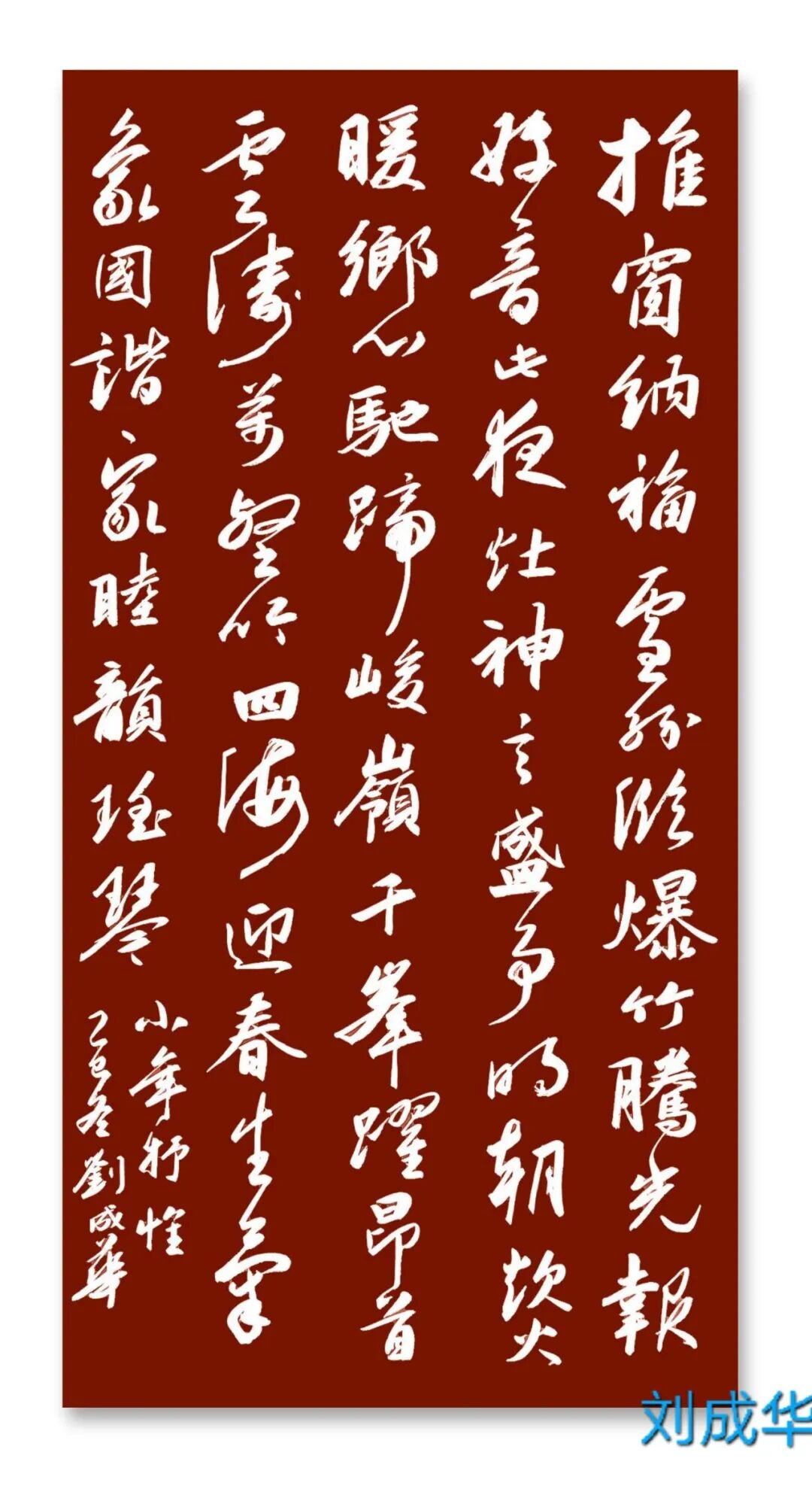 刘成华 中国书法家协会会员,中国书法家协会考级中心考官,共青团中央中高级人材培训中心讲师,全国教师书法展评委。曾任营口市书法家协会副秘书长,大石桥市文联副主席、秘书长,大石桥市书画院副院长。书法作品20余次在中国书法家协会主办的展览中入展获奖,并在中央书画頻道展播,多幅作品被中国文字博物馆、日本、美国、泰国收藏。50余次在辽宁省书协展览中入展获奖,荣获辽宁省有突出贡献书法家,被中国美协、中国书协、宋庆龄基金会授于书法伯乐奖,全国农行杯电视书法大赛优秀奖。作品两次在日本展出。出版文集《岁月留痕》(东北师大出版社)、《刘成华论书绝句百首》(春风文艺出版社)、《刘成华五体书法作品集》。美术评论,文学评论,报告文学在《美术报》、《书法导报》、《鸭绿江》、《辽河》等报刊杂志发表,《论美术界的实验艺术对书法艺术的冲击》荣获全国铜奖。