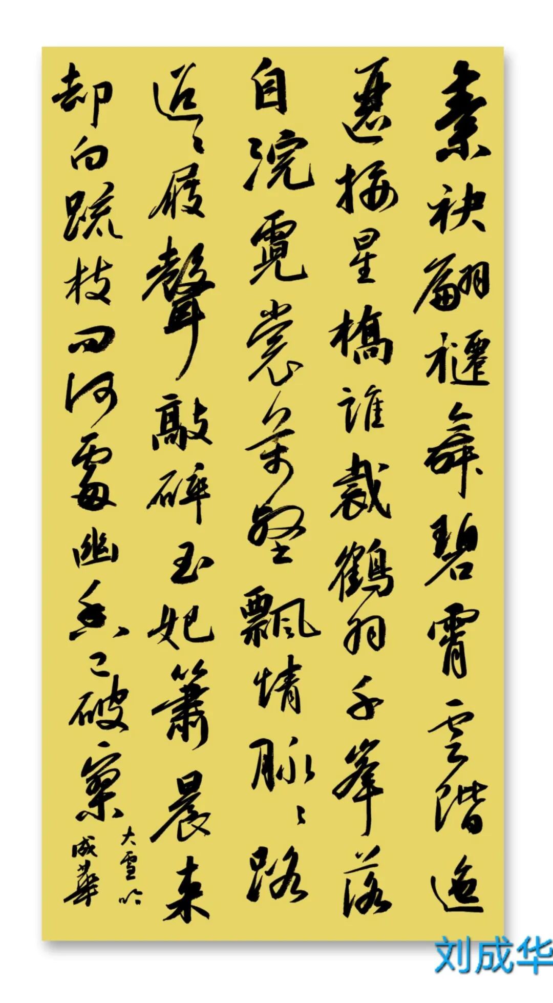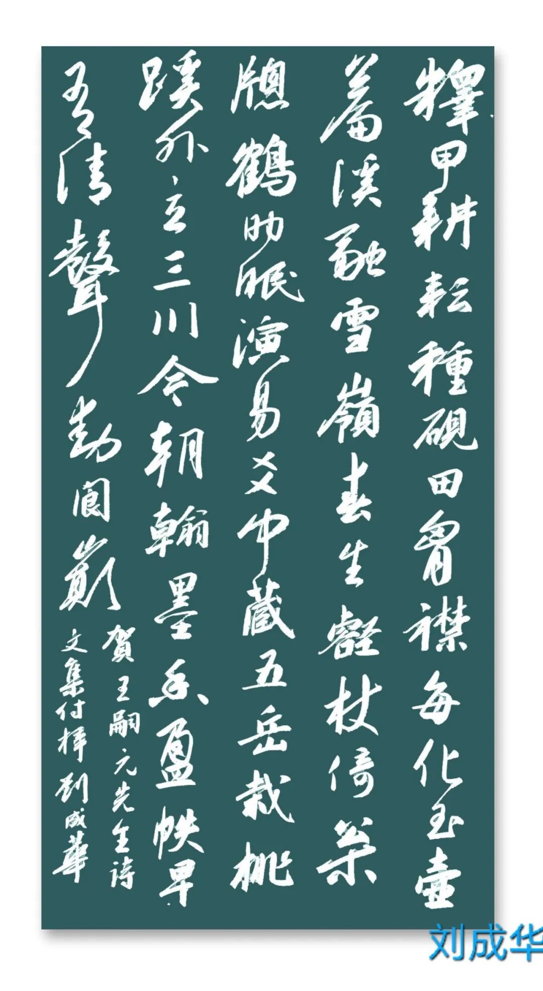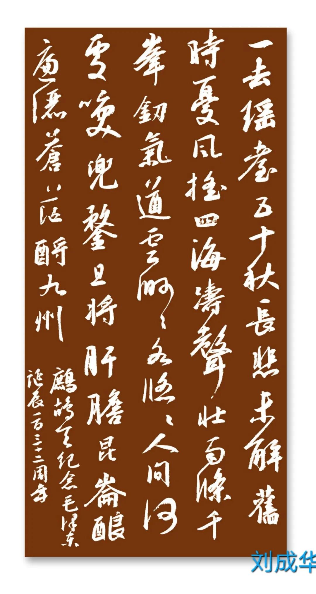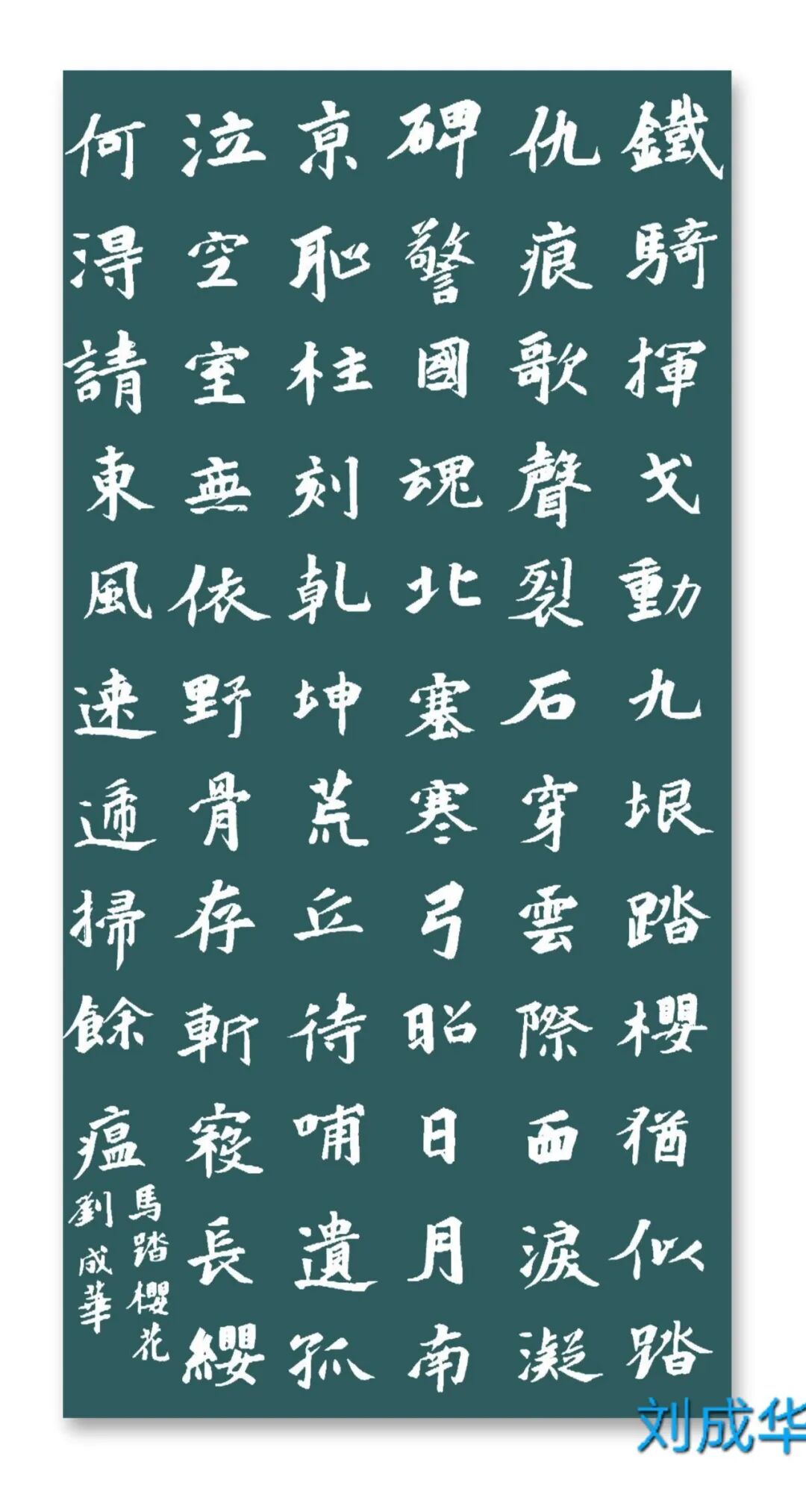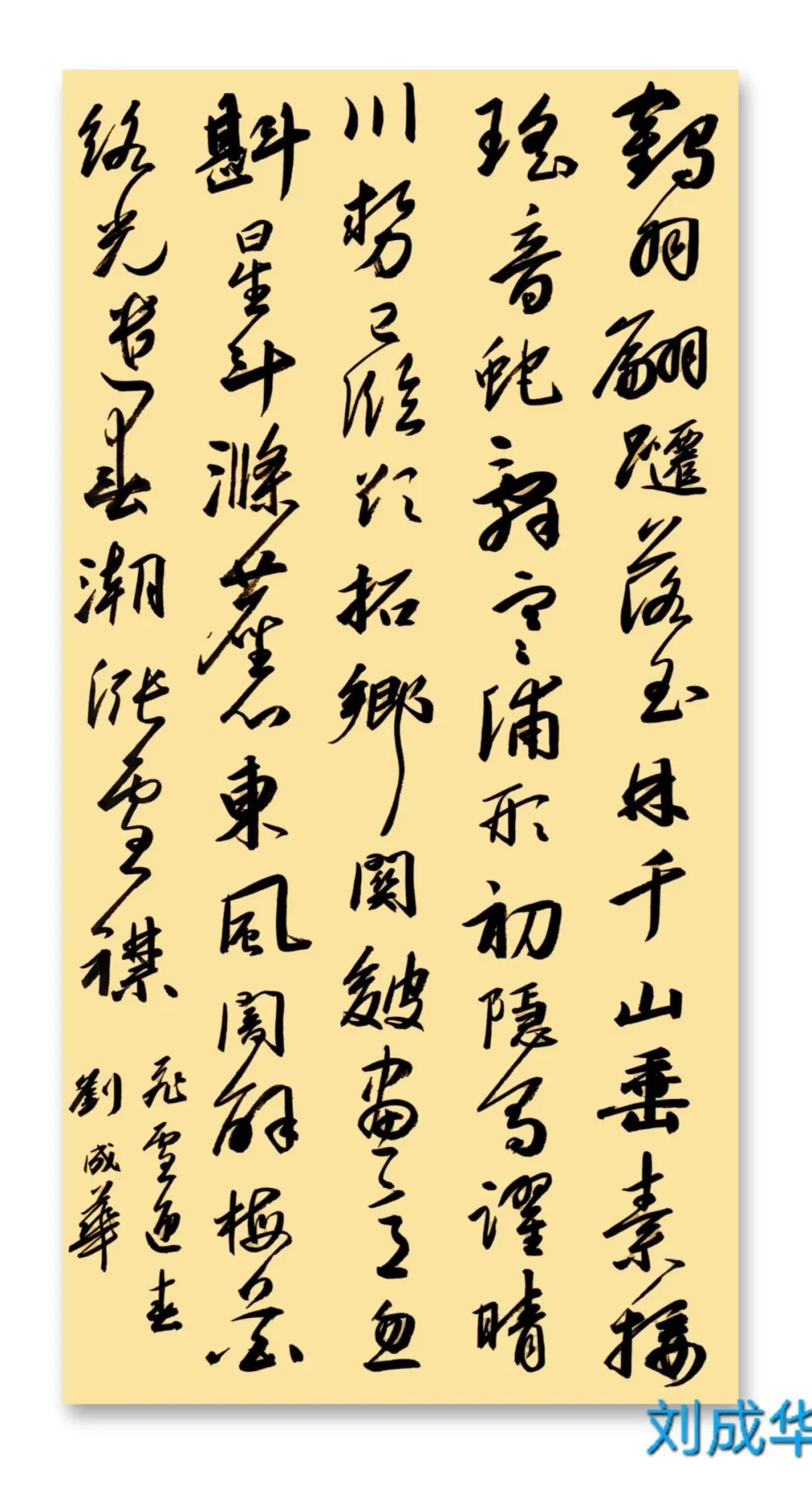 刘成华 中国书法家协会会员,中国书法家协会考级中心考官,共青团中央中高级人材培训中心讲师,全国教师书法展评委。曾任营口市书法家协会副秘书长,大石桥市文联副主席、秘书长,大石桥市书画院副院长。书法作品20余次在中国书法家协会主办的展览中入展获奖,并在中央书画頻道展播,多幅作品被中国文字博物馆、日本、美国、泰国收藏。50余次在辽宁省书协展览中入展获奖,荣获辽宁省有突出贡献书法家,被中国美协、中国书协、宋庆龄基金会授于书法伯乐奖,全国农行杯电视书法大赛优秀奖。作品两次在日本展出。出版文集《岁月留痕》(东北师大出版社)、《刘成华论书绝句百首》(春风文艺出版社)、《刘成华五体书法作品集》。美术评论,文学评论,报告文学在《美术报》、《书法导报》、《鸭绿江》、《辽河》等报刊杂志发表,《论美术界的实验艺术对书法艺术的冲击》荣获全国铜奖。