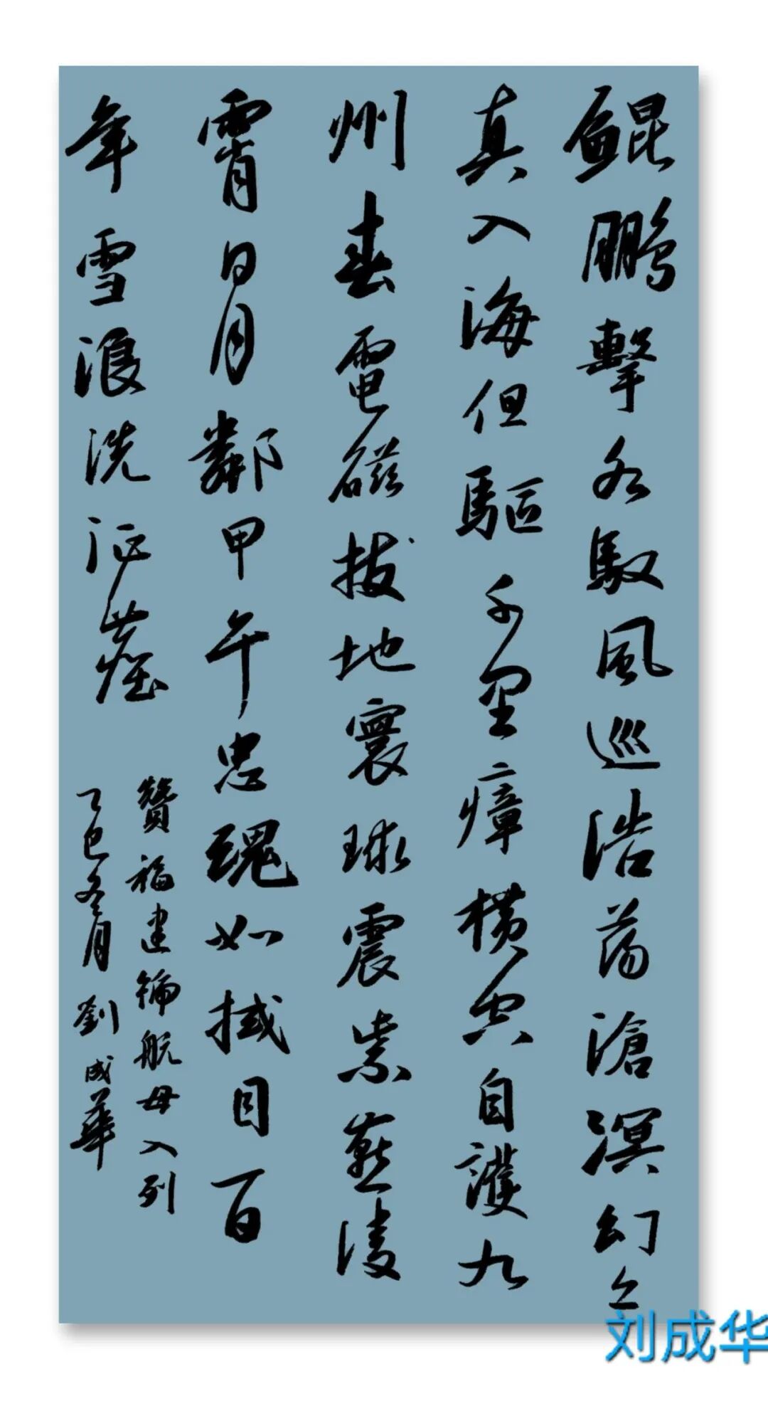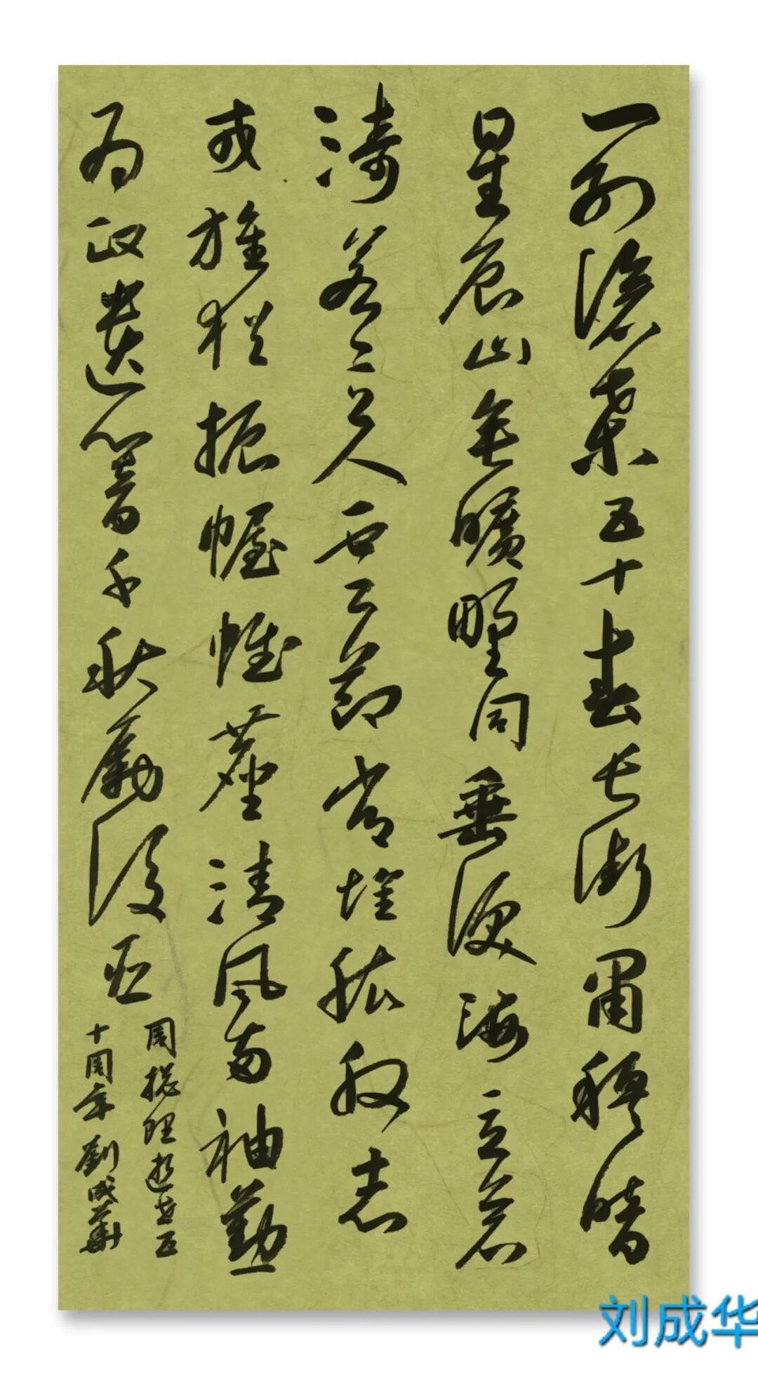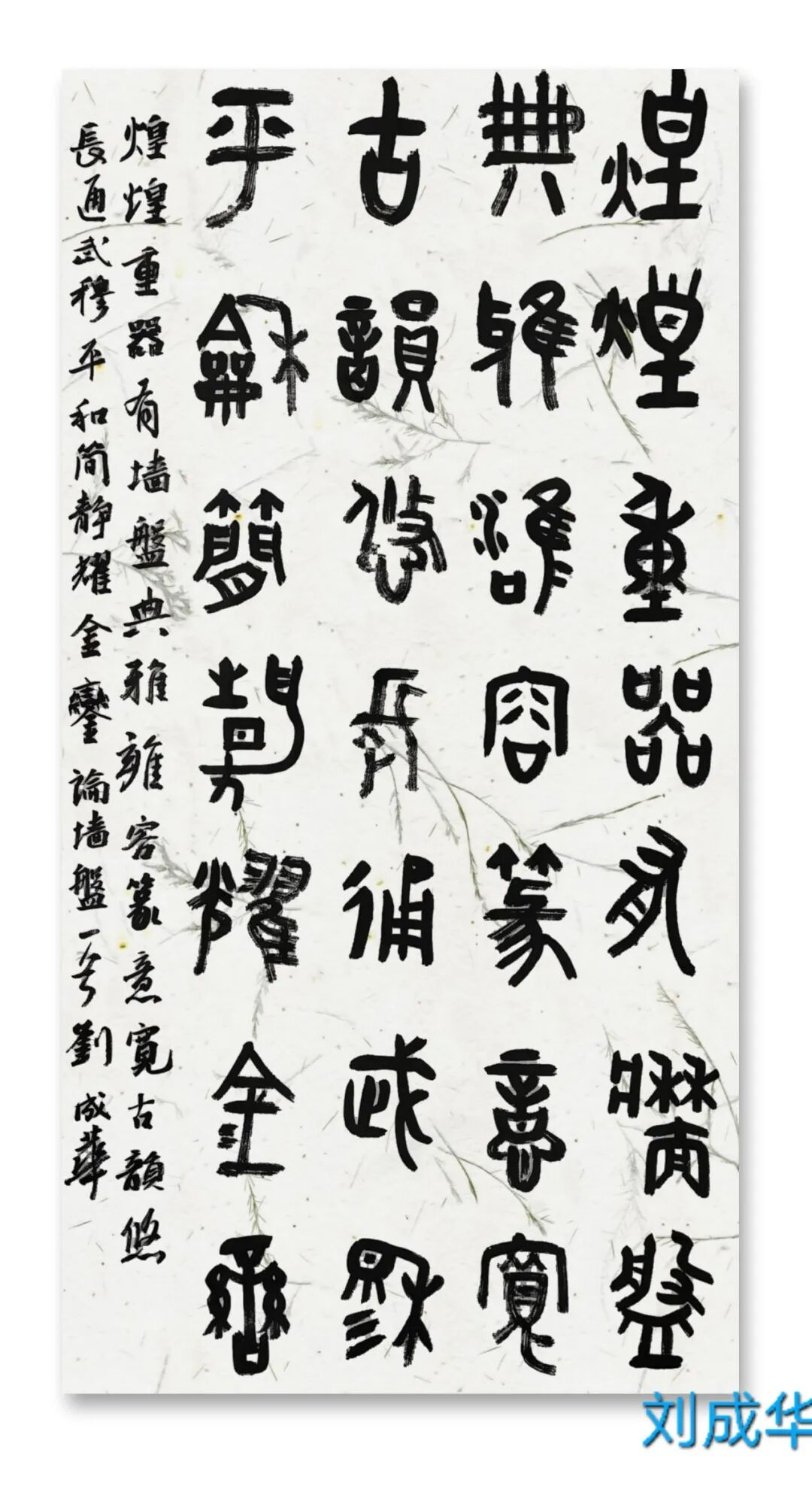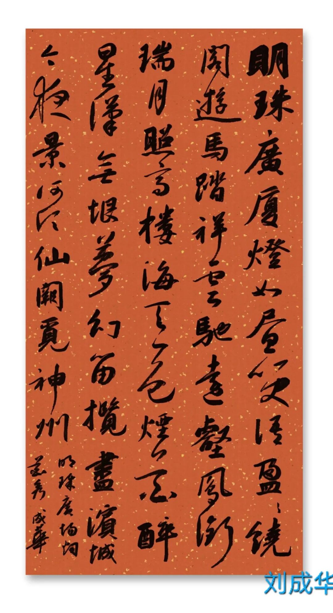 刘成华 中国书法家协会会员,中国书法家协会考级中心考官,共青团中央中高级人材培训中心讲师,全国教师书法展评委。曾任营口市书法家协会副秘书长,大石桥市文联副主席、秘书长,大石桥市书画院副院长。书法作品20余次在中国书法家协会主办的展览中入展获奖,并在中央书画頻道展播,多幅作品被中国文字博物馆、日本、美国、泰国收藏。50余次在辽宁省书协展览中入展获奖,荣获辽宁省有突出贡献书法家,被中国美协、中国书协、宋庆龄基金会授于书法伯乐奖,全国农行杯电视书法大赛优秀奖。作品两次在日本展出。出版文集《岁月留痕》(东北师大出版社)、《刘成华论书绝句百首》(春风文艺出版社)、《刘成华五体书法作品集》。美术评论,文学评论,报告文学在《美术报》、《书法导报》、《鸭绿江》、《辽河》等报刊杂志发表,《论美术界的实验艺术对书法艺术的冲击》荣获全国铜奖。
