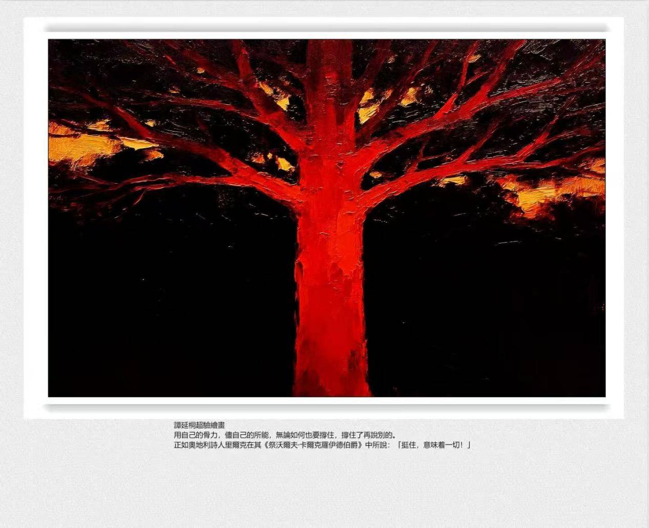 色彩是这幅画的精神皮肤,红与黑的对抗构成了存在的基本张力。黑色是存在的背景,虚无是存在的容器,只有当生命从虚无中凸显,它的存在才有意义。画中的黑色背景没有渐变,没有层次,像一块沉重的石头压在画布上,却恰恰让红色的树更显刺眼,黑色的静衬托出红色的动,黑色的无凸显出红色的有。红色是自我支撑的颜色,它不依赖阳光的滋养,不依赖土壤的哺育,只依赖自身的骨力,树干的红像凝固的血液,像晒干的肌肉,像老树的皮层,每一道笔触都带着生命的脉搏。橙色是红色的余温,是希望的火种,它分布在枝桠的分叉处,像被风吹散的火星,告诉观者撑住不是绝望的坚持,是带着希望的坚守,就像里尔克说的“挺住,意味着一切!”,一切是继续存在的可能,是“再说别的”的权利。