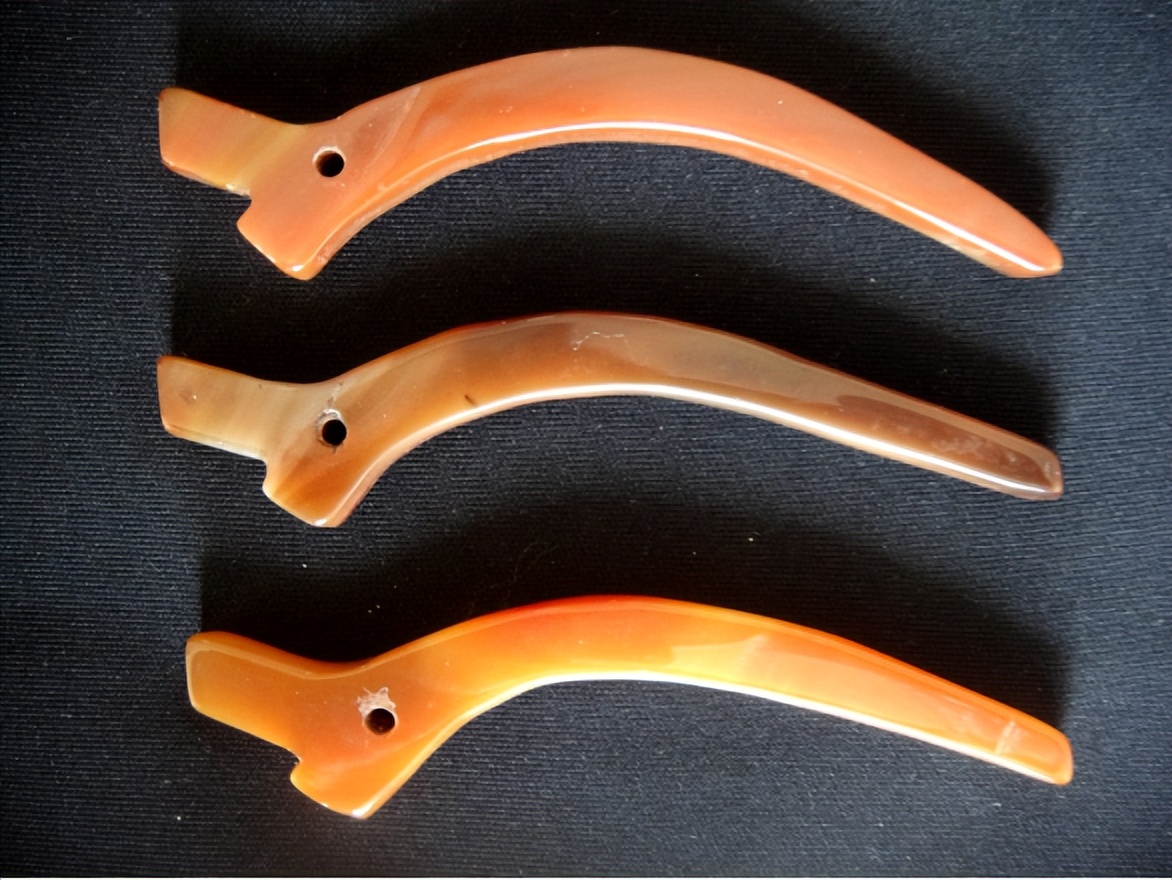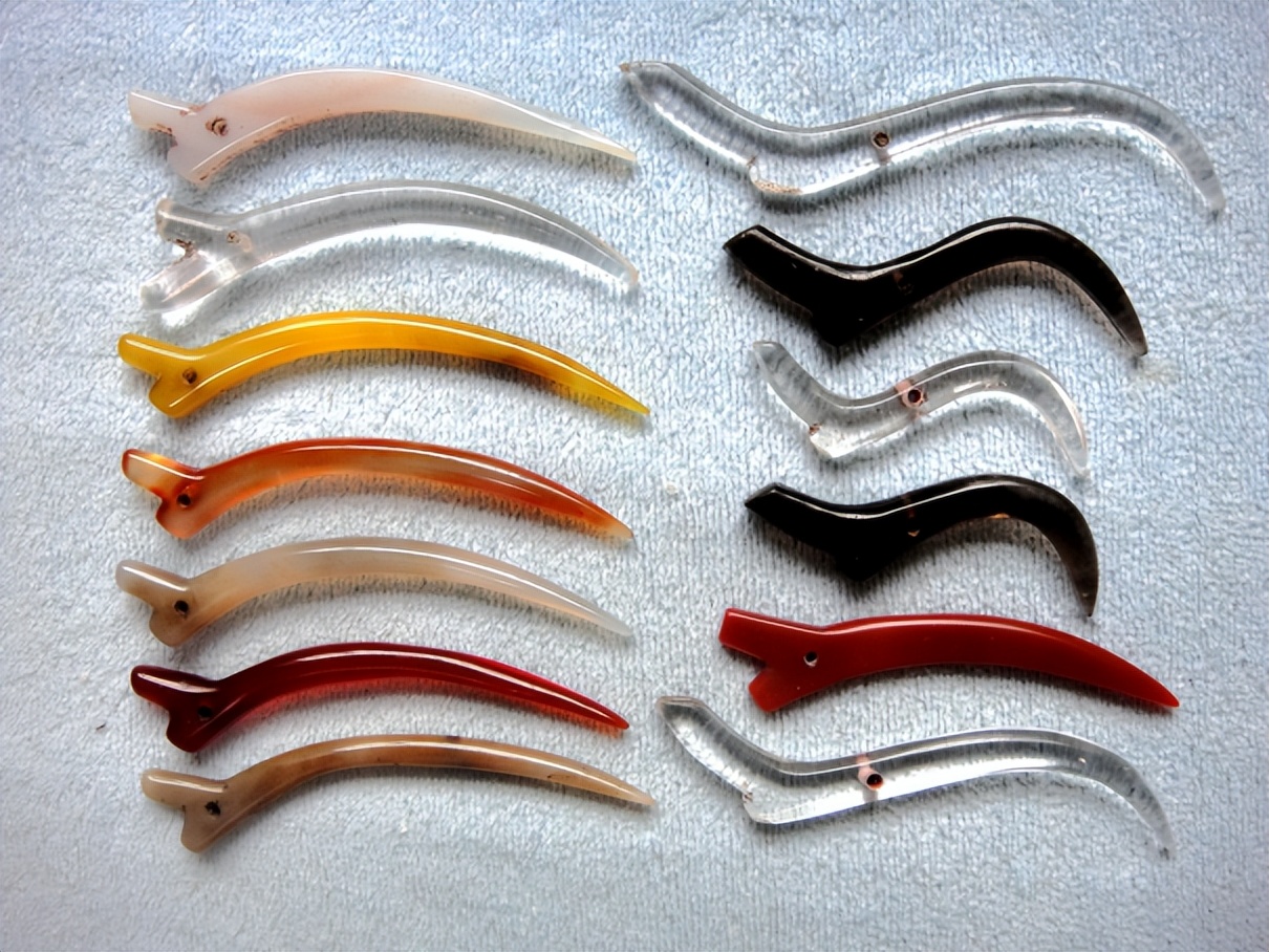 值得注意的是,在齐地出土大量水晶丶玛瑙觽的同时,也发现不少玛瑙冲牙(未发现水晶冲牙)。玉觿与玉冲牙,是古代一类形制相似甚至近乎雷同的弯角形玉佩,但文献记载的两者名称、渊源、功用、文化内涵是不同的。玉冲牙是古代与组玉佩兴盛相联系的一种弯角形玉器。文献中的玉冲牙之称始现于西周时期组玉佩之制的记载中。《周礼·天官冢宰·玉府》:“佩玉上有葱衡,下有双璜,冲牙、蠙珠以纳其间。”《礼记·保傅》:“下车以佩玉为度,上有葱衡,下有双璜,冲牙、螓珠以纳其间,琚瑀以杂之。”