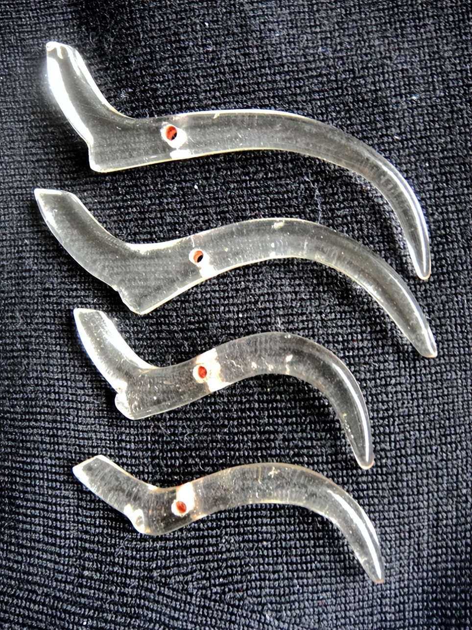 自战国起,玉组佩不再套于颈部,而系在腰间的革带上,或在胸部以襟钩(一种小铜带钩,齐国墓葬常与水晶珠丶环等同出)直接悬挂。因此长度仍然不短,但组合方式相对简单丶自由。从现有的文献与出土实物看,玉冲牙的出现应晚于玉觽,而且常常是成对出现。齐国玉冲牙形如弯角,也是C字状龙形,与玉觿相似;但玉冲牙下端不是尖锐似锥而是钝角,是不能用以解结的。玉觿是可以当冲牙使用的,而冲牙是不可能做玉觽使用的。尖者为觽,钝者冲牙,这应是齐国战汉玉觽与玉冲牙的根本区别。齐国发现的战汉玉冲牙,全是玛瑙片雕制品,呈色亮洁,包浆灿烂,与玉觽一样精美华贵。