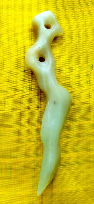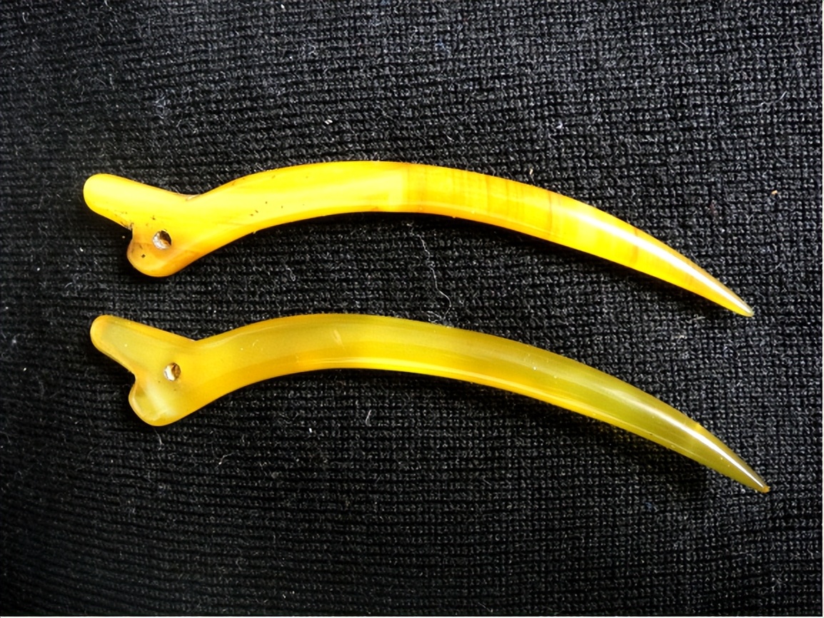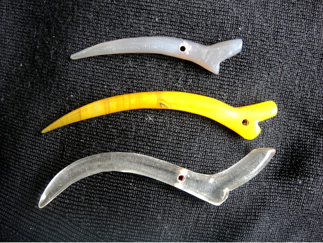 玉觽因为是以觽为祖型琢磨加工而成的弯角形器,只是在角丶牙形的基础上进行了象形丶夸张的变化。所以品种样式既古雅又简洁。