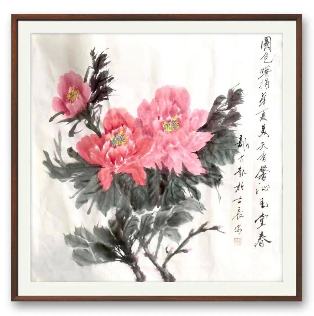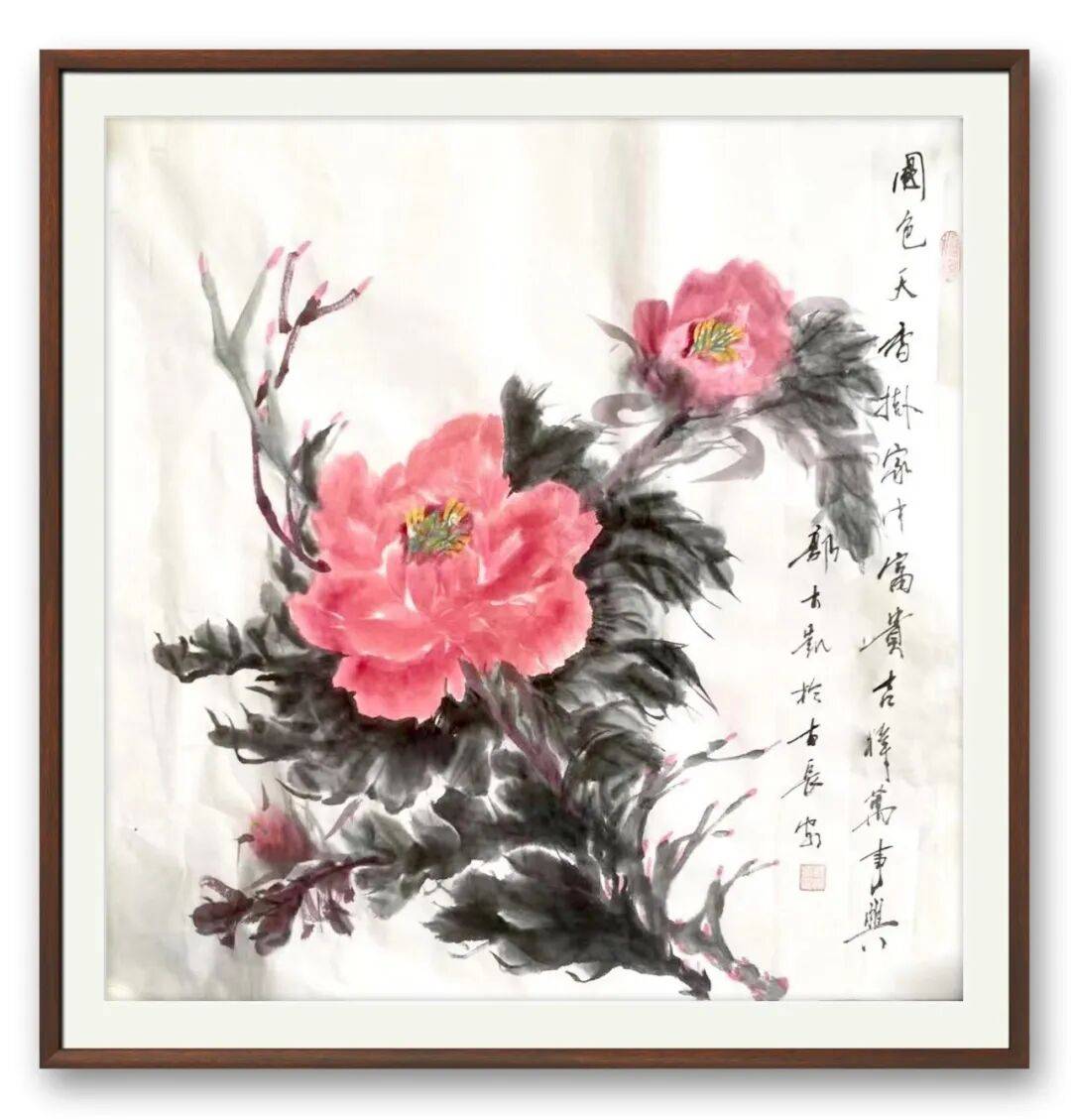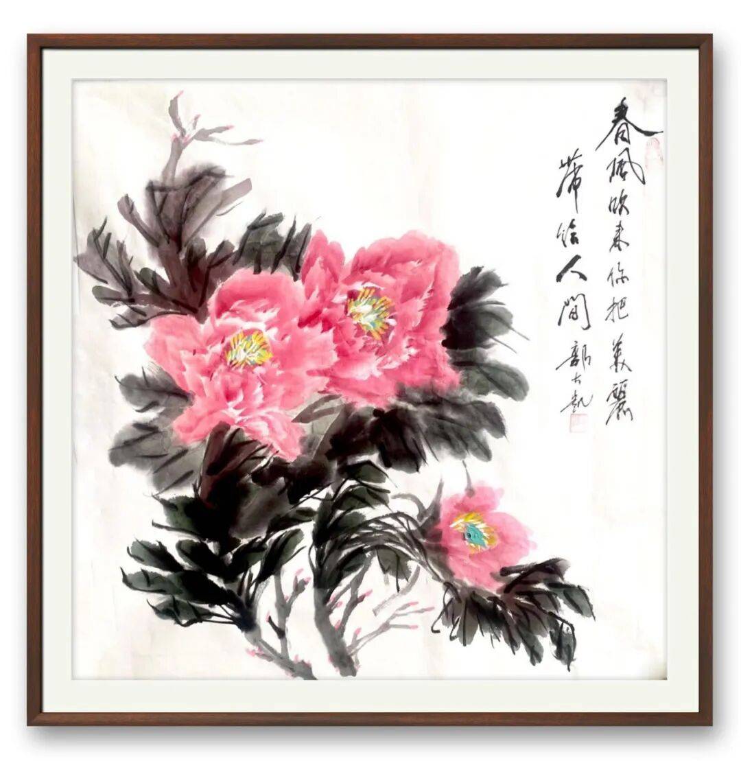 不同于书法的刚劲洒脱,郭大凯的牡丹作品,则尽显柔婉灵动与生命张力。他笔下的牡丹,不追求艳俗的华贵,而是以墨为骨,以彩为魂,寥寥数笔便勾勒出牡丹的雍容姿态。花瓣层次分明,墨色浓淡渐变,既有含苞待放的娇羞,又有怒放枝头的昂扬,叶片舒展自然,脉络清晰可辨,寥寥数笔,便将牡丹“花中之王”的气度与清雅表现得淋漓尽致。他善用墨色的对比,浓墨点染花叶,淡墨铺陈背景,虚实相生间,让牡丹既有传统工笔的细腻,又有写意画的洒脱,打破了工笔与写意的界限,赋予牡丹鲜活的生命力。