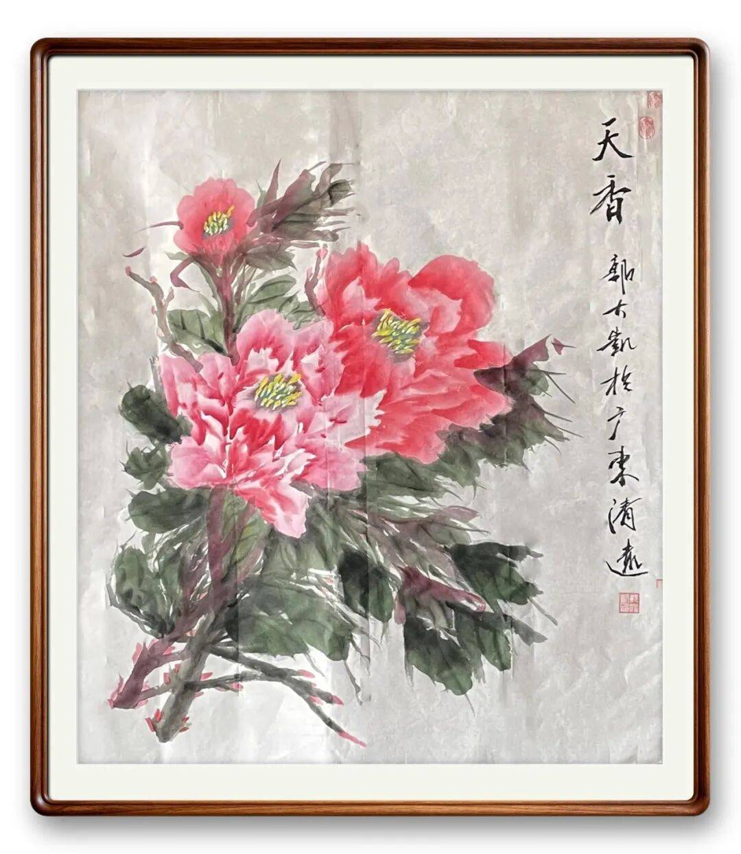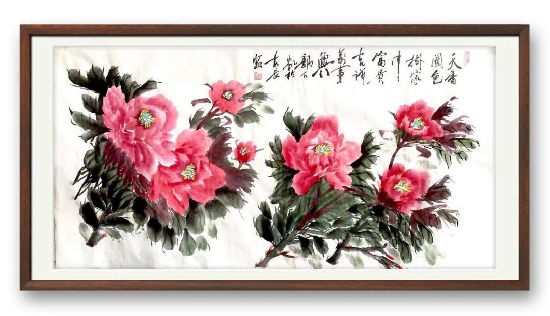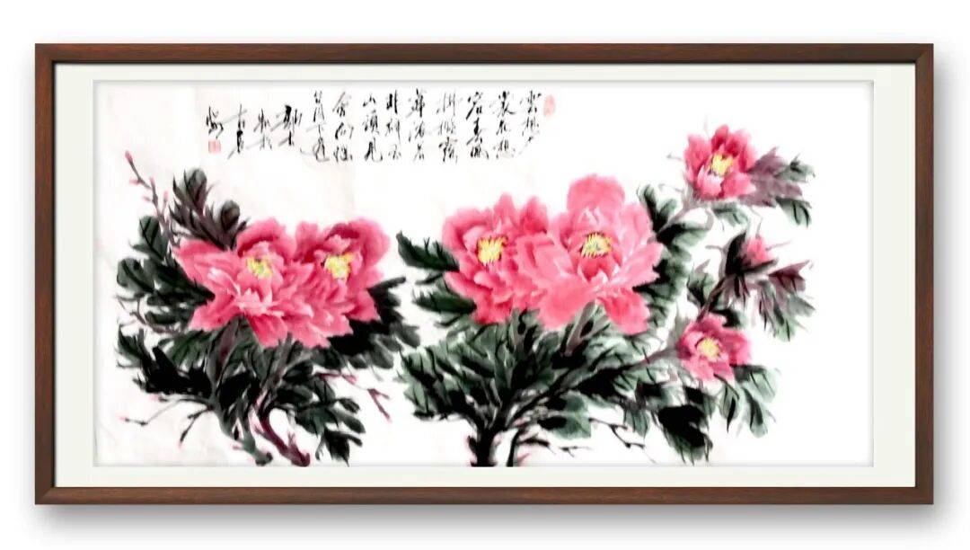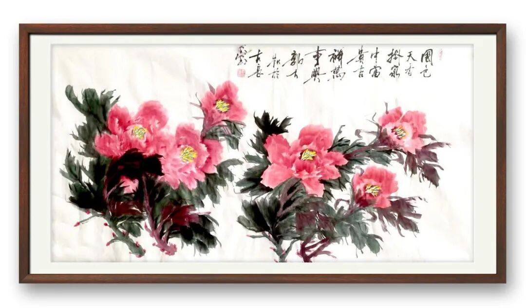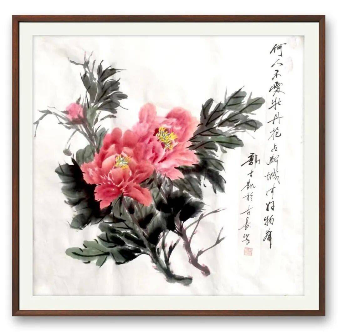 不同于书法的刚劲洒脱,郭大凯的牡丹作品,则尽显柔婉灵动与生命张力。他笔下的牡丹,不追求艳俗的华贵,而是以墨为骨,以彩为魂,寥寥数笔便勾勒出牡丹的雍容姿态。花瓣层次分明,墨色浓淡渐变,既有含苞待放的娇羞,又有怒放枝头的昂扬,叶片舒展自然,脉络清晰可辨,寥寥数笔,便将牡丹“花中之王”的气度与清雅表现得淋漓尽致。他善用墨色的对比,浓墨点染花叶,淡墨铺陈背景,虚实相生间,让牡丹既有传统工笔的细腻,又有写意画的洒脱,打破了工笔与写意的界限,赋予牡丹鲜活的生命力。