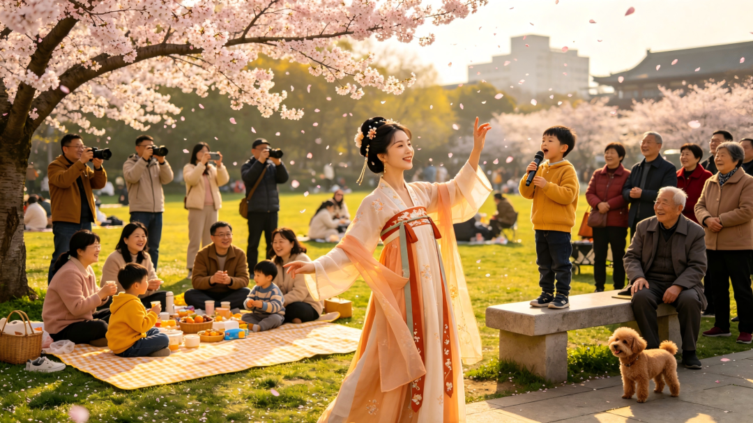 樱花正值盛花期,枝头一朵挨着一朵,一簇挤着一簇,开得热烈而奔放,饱满而鲜活,仿佛要把整个春天的美好,都尽情绽放。赏花的游人络绎不绝,欢声笑语不绝于耳。大家身着盛装,满怀期待而来:穿鲜艳汉服的,衣袂飘飘,穿梭在花林间,宛若穿越千年的佳人,一颦一笑,皆成风景;身着时装的中年人 ,钻进樱花林深处,举着手机相机,打卡拍照、直播录屏,用镜头记录下春日美好,定格下瞬间永恒;还有的在樱花树下铺好垫子,三五人、十几人围坐在一起,谈天说地、闲话家常,分享生活趣事,欢声笑语回荡在花海之间。