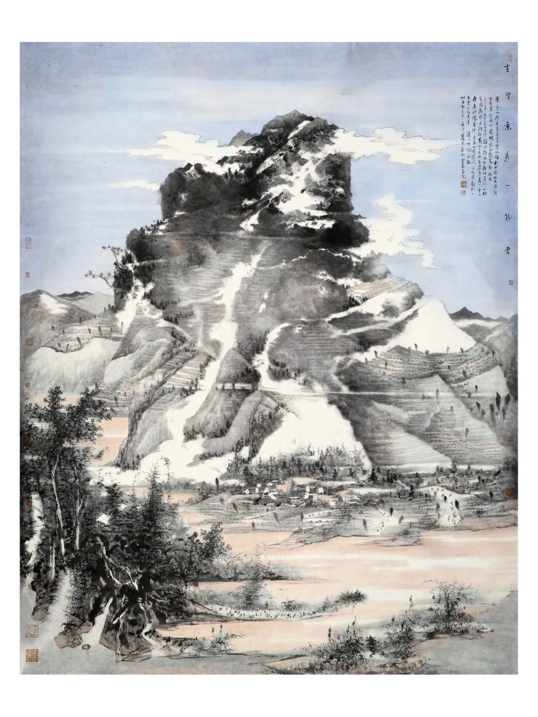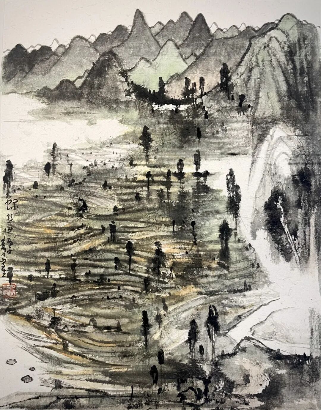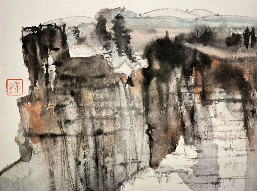 云南地理环境在宽广的整体中有其鲜明的特质,换言之它有着一种奇特的华美。对于艺术创作主体来说:它的地域特征会影响它的技术成分,并通过技术成分再影响它的社会成分和观念成分。用水墨怎样表达这种地域特质?这是一项有着较高技术性含量的课题。从肖凡的作品看:他正朝这方向努力求索,努力耕耘。《乌蒙春行图》《万峰山色》《红河写生册》这一时段的作品,无论是笔墨与形式方面或是形式与内容关系,已预示方向性研究的积极因素,若肖凡把水墨山水画出地方特色,画出云南画风,是值得赞赏的。肖凡对家乡的自然景观情有独钟,通俗一点说:他爱这片热土。也是值得敬意的。然而,艺术它是人类共同认同的形而上的大概念。就艺术本体来说它是多元的、宽泛的、非功利性的,艺术植根于人的心理需要,而且满足了人的心理需要。艺术若以人的知性作为坐标,那么这种艺术所表现宏观上不再是局限于时间、空间、区位……的思维与表达。微观上不再是局限于对客体物表层的探讨和描写。