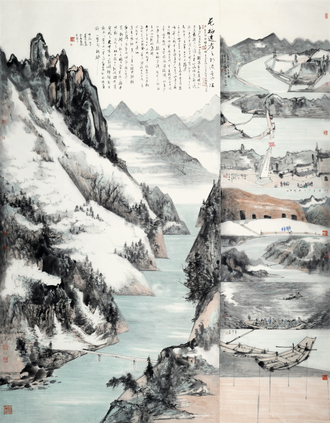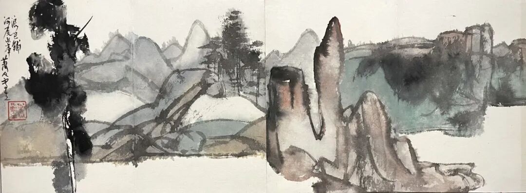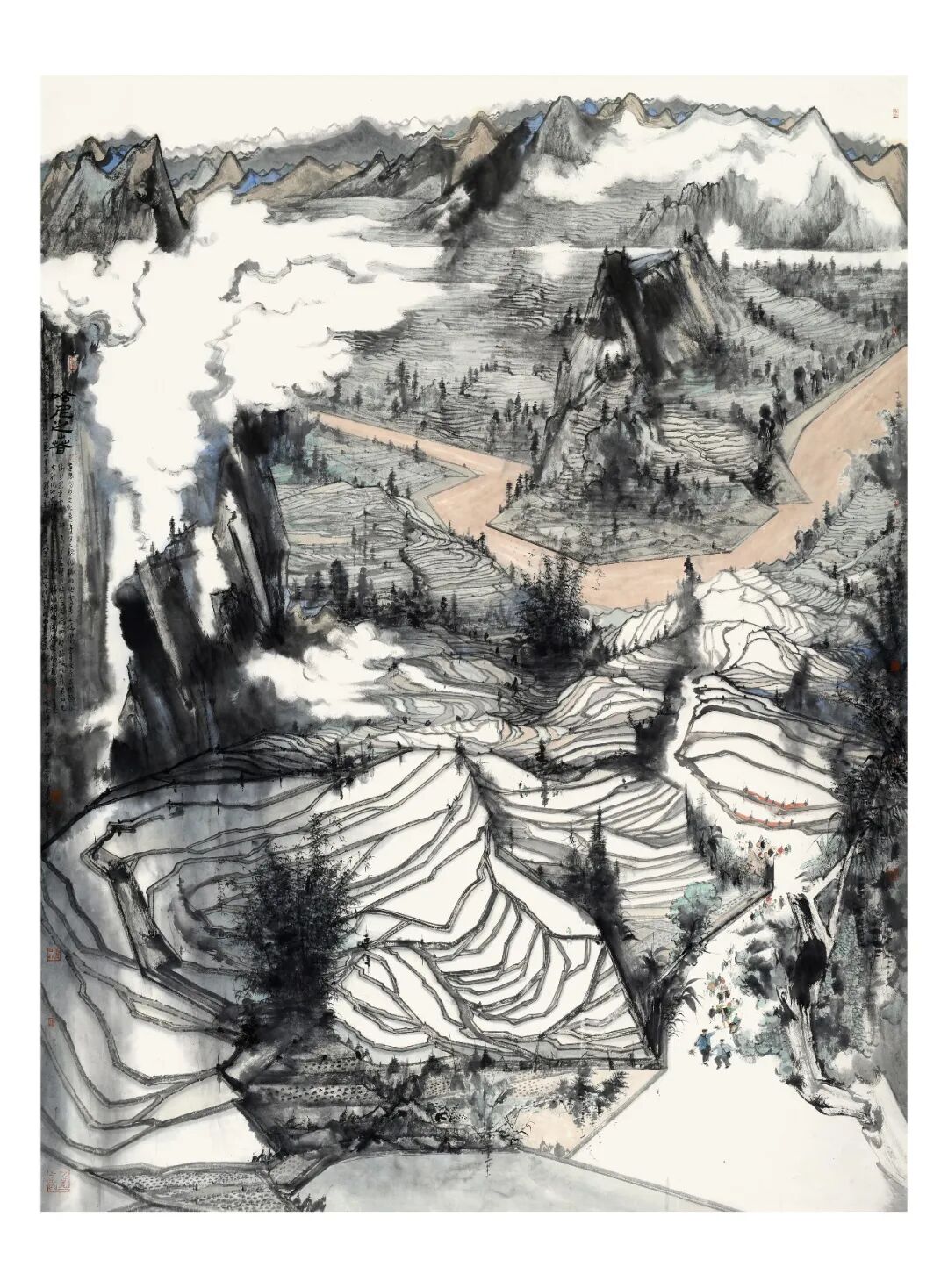 德美学家黑格尔指出:“美的要素可分为两种,一种是内在的,即内容。另一种是外在的,即内容所借以现出的意蕴和特征的东西,内在的显现于外在的,就借此外在的人才可以认识到内在的,因为外在的从它本身指引到内在的。”可见绘画中外在界的形式感的艺术显现是十分可贵的,它直接的影响人的视美直观。肖凡在作品中强化形式感意识,拓展了形象思维的审美空间。企图使理性与个人意志在思想中更加鲜明起来。肖凡在求变,但他不反传统。从他处理画面空间感手法上看出,他面对石涛绘画章法的“三叠式”“两段式”所述的空间理论,肖凡有自己的思索。他根植传统“古为今用”又在当下大文化环境中探寻载体。从而,他赢得更为多元的空间感显现的方式,犹如作品《万峰微雨润秋田》《红河谣》《海峰秋色》等等、形式意味是明晰的、多样化的,形式和形象进而变得更有诗意般的描写。画面处理彰显形态各异的视觉律动,有着良好的视觉引力和看点。