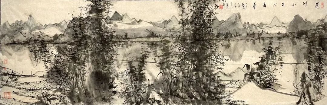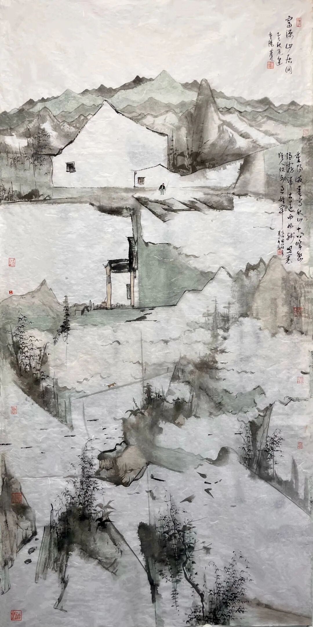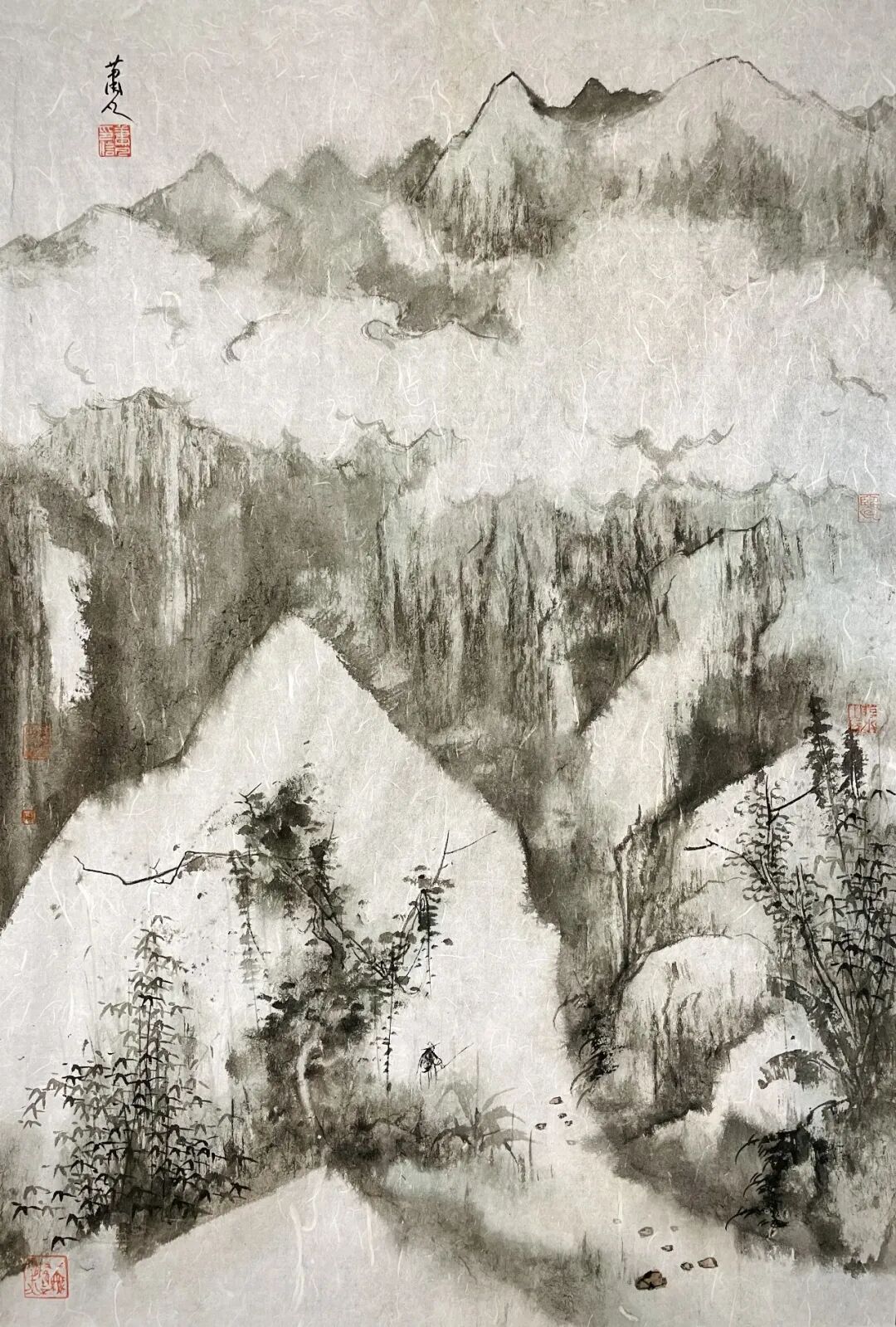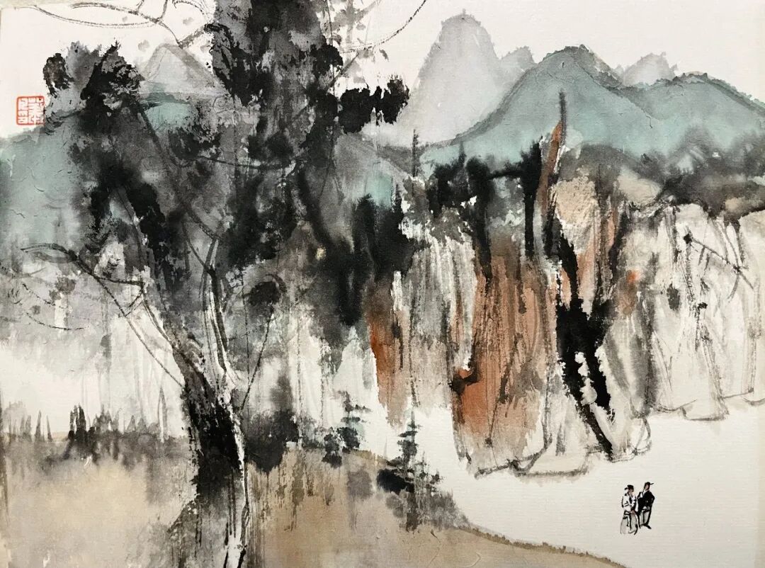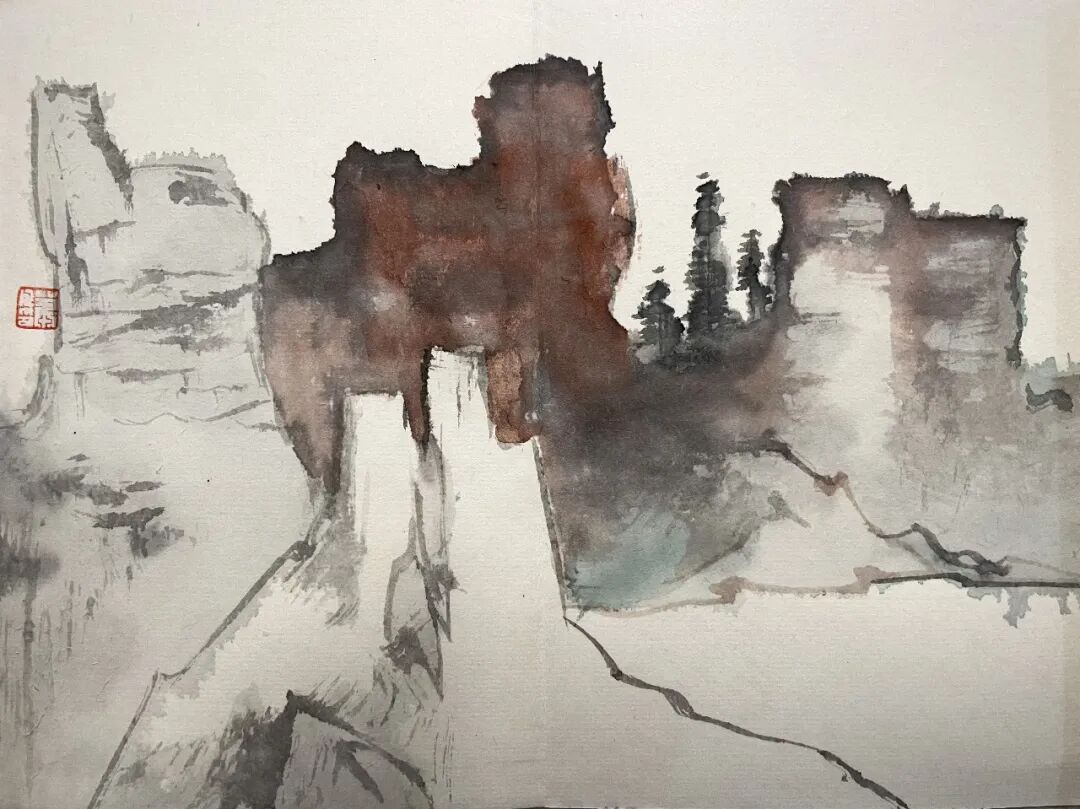 二是,良好的笔墨悟性。肖凡的作品其笔墨是一亮点。笔墨是中国画的语言,也是国画区别于其他画种的第一要素。从视觉直观上讲,它有着极强的视觉美意和冲击力。中国画笔墨的视觉魅力源远流长。笔墨,也常常被誉为水墨画的评判或议论的标尺。肖凡作品笔墨明快舒朗多变化,笔触时而是侧锋卧笔的挥写,时而中锋行笔勾点。在刻画某细节时却显得十分谨慎,但不显生硬和拘谨。如《梅里雨晴图》《独龙雪晴》《水洼子》作品的用笔为例:用斧劈皴写岩石,方笔多见顿挫,笔调刚柔并济;笔法粗放、稳健、多变化。树的枝干多见中锋行笔,笔势顺、逆、疾、徐,张弛顿挫,灵动舒展。
