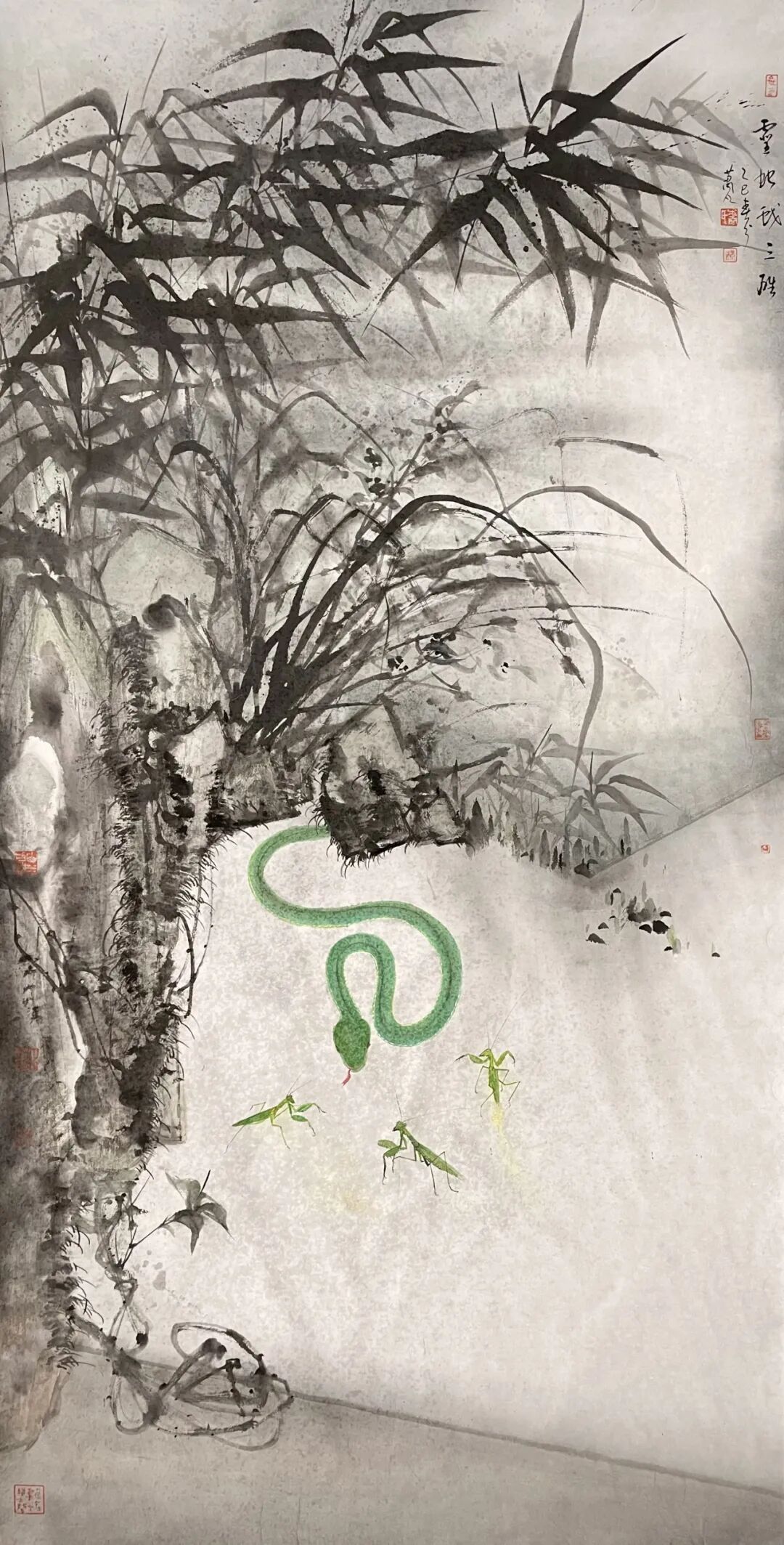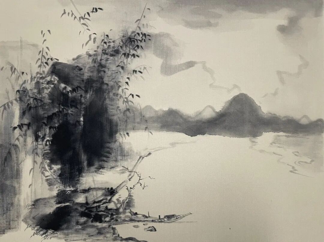 在水墨画中,笔墨是语言,然而从审美的更深层次讲,笔墨构架是审美心灵和灵魂的载体:笔墨表现出画家独特的艺术见解和人生态度。我喜欢肖凡用墨那种即兴自觉地表现。墨色浓淡之间随心随意的泼写,却营造出一种气象万千之意韵,墨色或重或轻,深浅干湿相映成趣,酣畅清朗显逸气,《轿子雪山》《玉龙烟云》《江湖系列》等作品系列或许是他画法的一种尝试。从有法到无法,泼墨、积墨、冲刷……墨之水迹苍润、通透,生发某种偶然的效果。肖凡也时常产生出一些近于异化之作,艺术中充满着一种非特定情绪的移入,或者说是内心不安的产物,或许是借酒兴所为之。亢奋、激情、释怀。画家此时从有我到无我之境升华。绘画冲动、行为意欲、节节上升,试想在这样的状态下,笔墨一定产生意想不到的效果,笔墨也将进入新的视觉空间,试比较,这些作品它一定超乎寻常,视觉感染力更强劲,这就是所谓的“难得糊涂”的艺术情操。