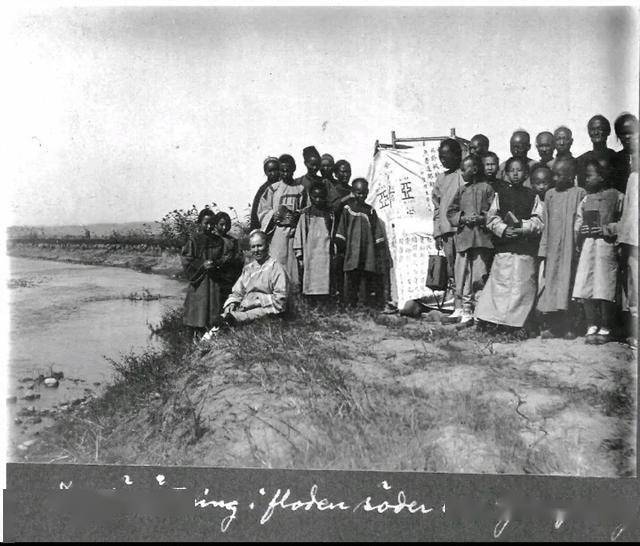 照片显示一位西方女传教士与中国学童在永宁县城南的洛河边合影,后面隐约能够看到北边的山塬。人群中立着带有十字架、“亞”字标志的布告牌,学童手中拿着书本《圣经》,通过多名男童的衣着服饰及侧脸看,他们扎着发辫,推测此照片应该拍摄于清末。