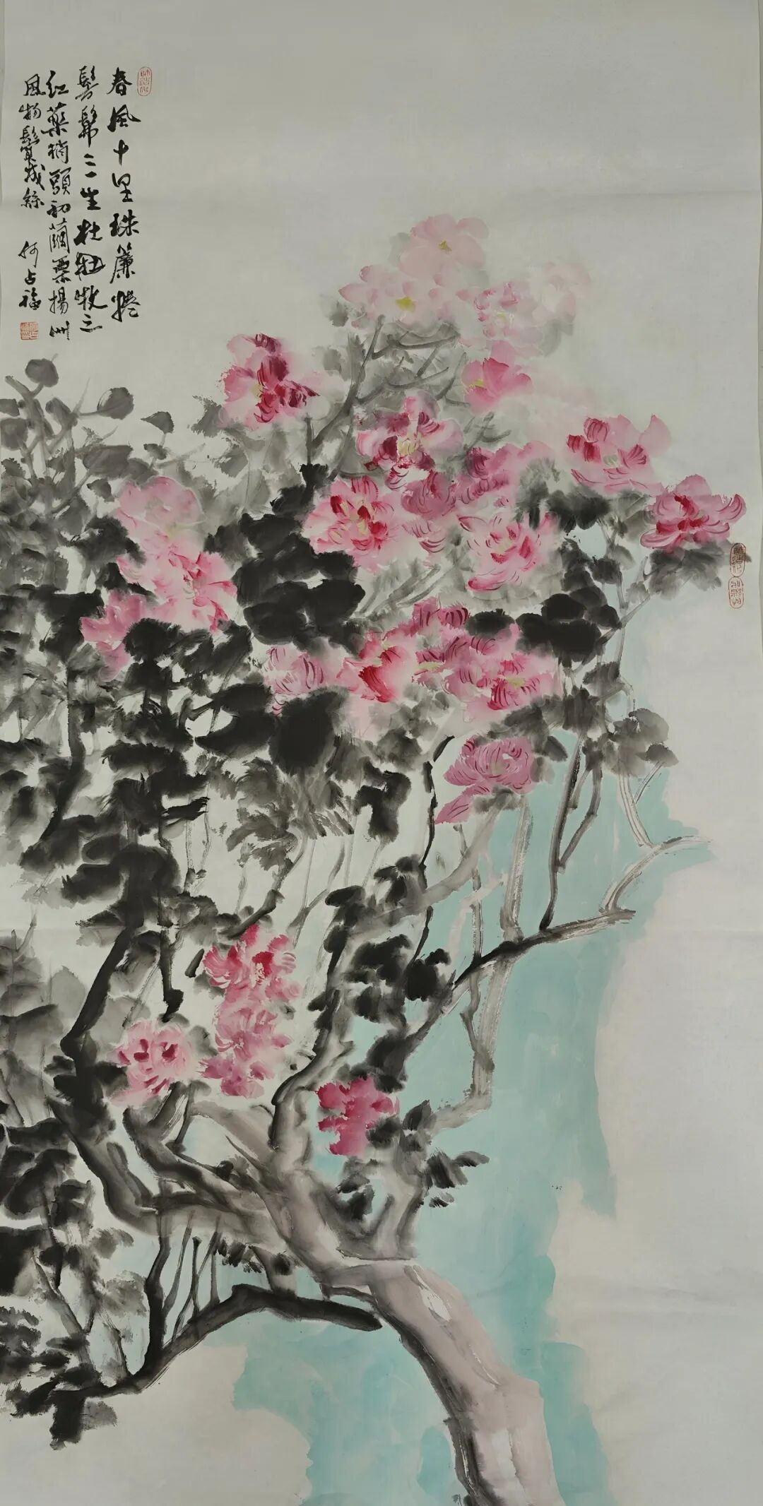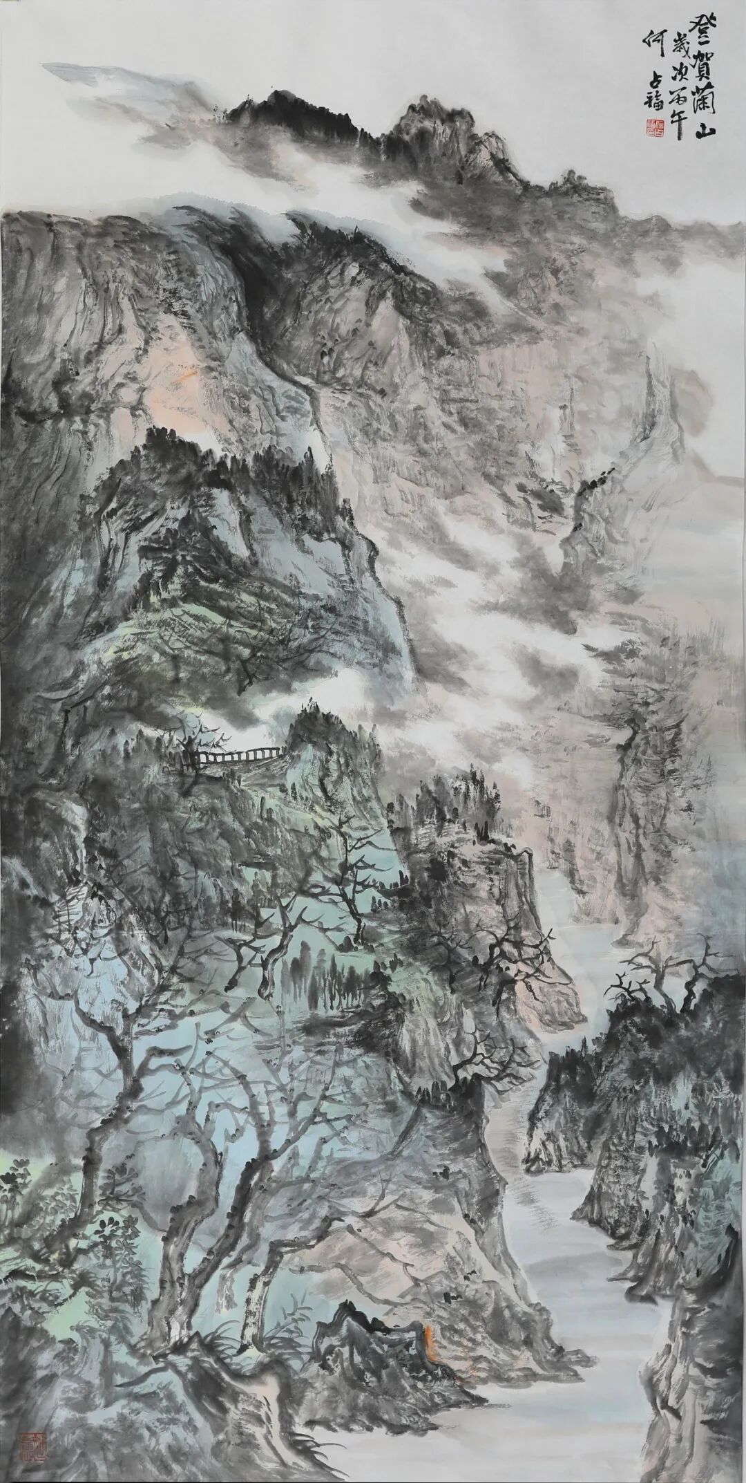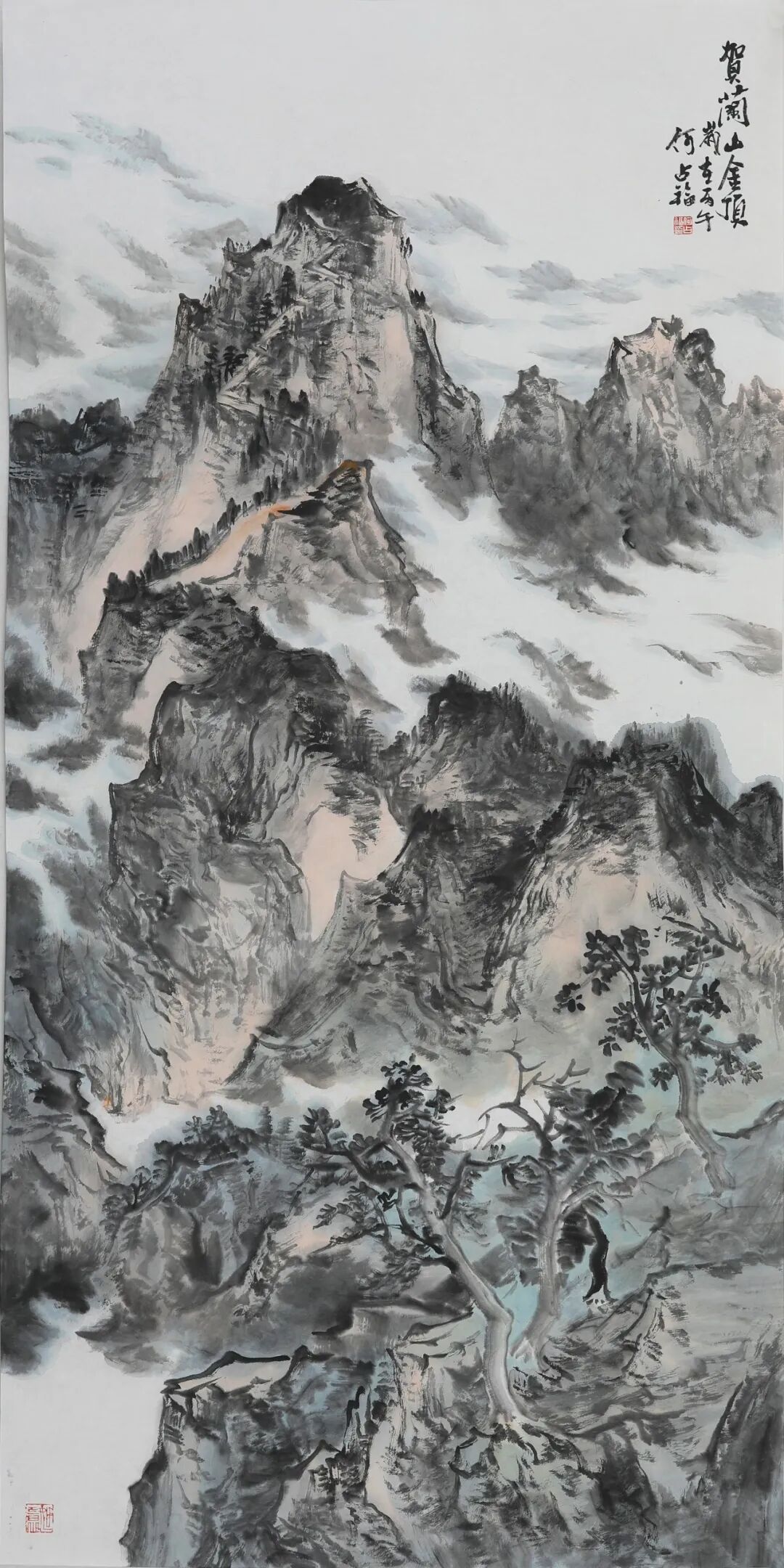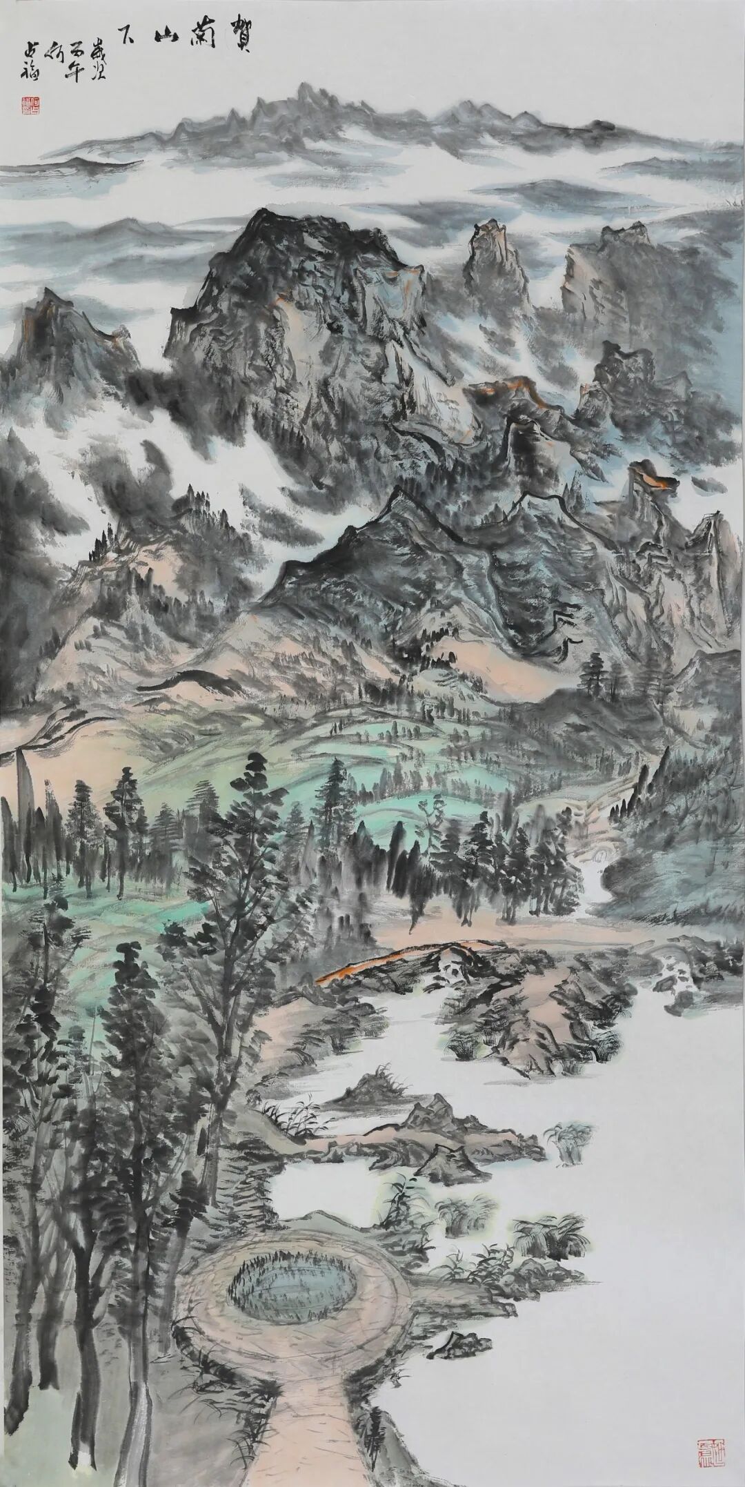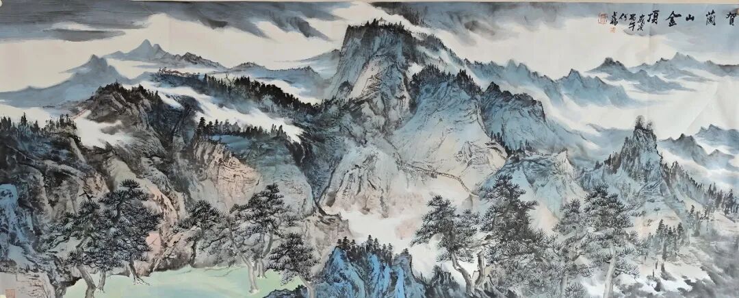 随着年岁渐长,父亲的画风也在发生变化。近年来的作品愈发浑融含蓄,笔墨之间多了几分从容与淡定。他笔下的贺兰山,少了几分早年的奇峭,多了几分与天地精神相往来的静穆。这种变化,正是他人生境界不断提升的写照。我深知,他画的,早已是他人格与生命的化身。前些日子回家,看他完成一幅五米乘六米的巨作,画的仍是贺兰山。父亲的创作,有一种令人屏息的从容。旁人作画,总要反复起稿,炭笔的痕迹在宣纸上擦了又改,唯恐失之毫厘。他却从不如此——即便是五米乘六米的巨幅创作,也无需粉本,不依草稿。只见他立于宣纸前,凝神静气,那浩荡的山水仿佛早已在他胸中生长了千百年,脉络分明,气血充盈。