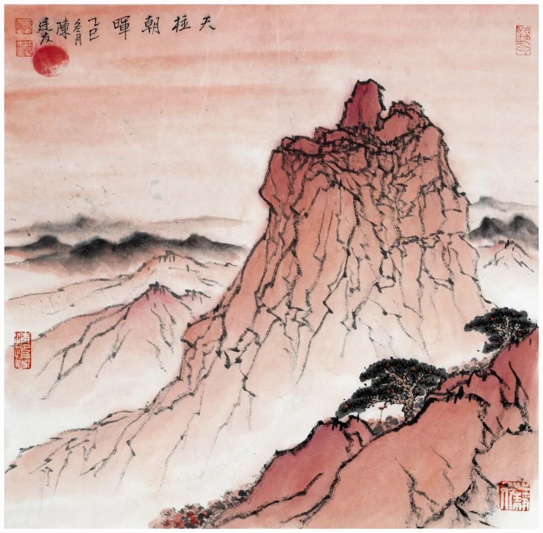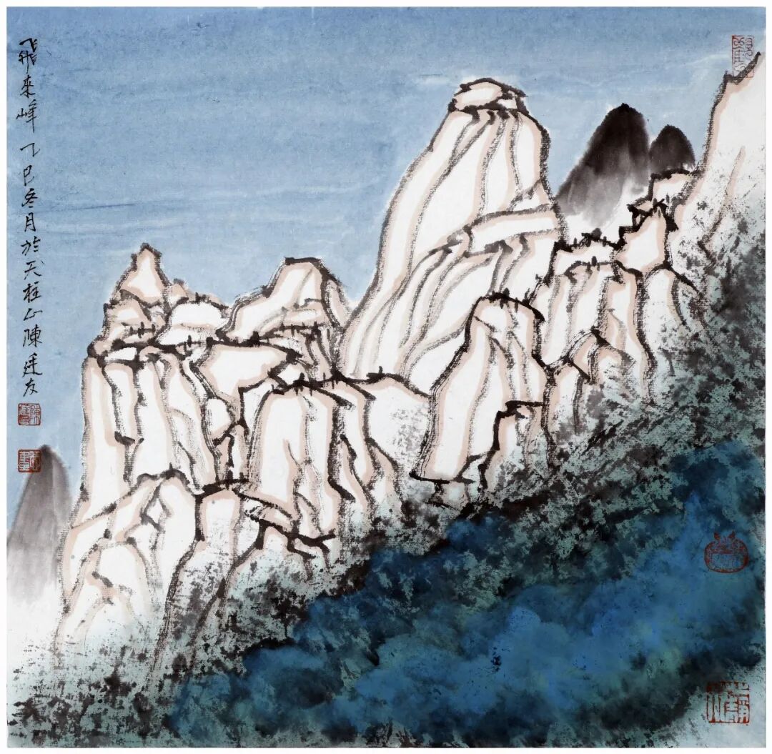 陈廷友果断舍弃画黄山时的灵动笔法,转而以凝重坚韧的线条勾勒山骨,以兼具金石质感的皴法雕琢山石,精准契合天柱山的独特气韵。他的用色亦随景随心,朝晖之时暖晕温润,晨曦之际淡墨朦胧,雪霁之日素净空灵,每一种色调都与天柱山的气场完美相融,不见半分刻意雕琢。