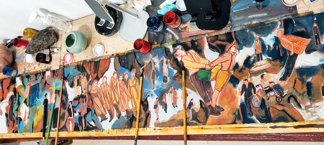 田流沙的“流沙溢梦”最令人震撼的,首先是它的物理尺度与叙事结构。五十四米,这不是一个适合在手机屏幕上划拉观看的尺寸,这是一种需要你扭动脖颈、挪动脚步,甚至需要你付出一点“体力劳动”才能看完的仪式。他聪明地借用了东方式的长卷叙事逻辑——不是西方教堂壁画那种扑面而来的神性压迫,而是像《清明上河图》一样,让你在移步换景中,去窥探这个时代的烟火与荒芜。