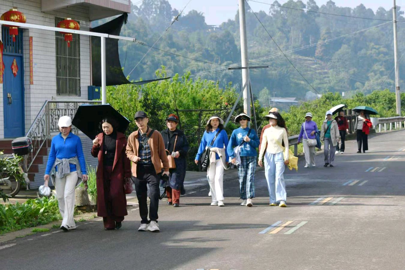 我赶到时队伍已经行走在甘家沟桔香园农家乐旧址的公路上,比会员群里报名的十多人,多了一倍不止,有旗袍走秀的资深美女,有周末爬山走路的行脚,有爱好摄影的发烧友。