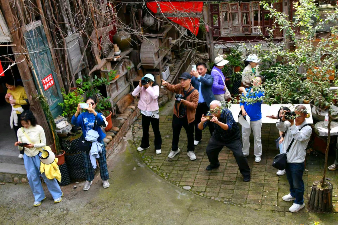他们三五成群边走边聊指指点点,偶尔发出一声惊讶,手持相机的发烧友跑前跑后喀嚓声不断。路边陈旧的竹片篱笆缝隙里伸出的豌豆藤上挂着一串嫩米豆角,不知名的野花争奇斗艳似乎要挣脱篱笆的限制,鹅黄的温暖,红色的热烈,紫色的高贵,把草长莺飞二月天装扮成人间最美的季节。没有了冬天的寒冷,大地刚刚苏醒的样子。