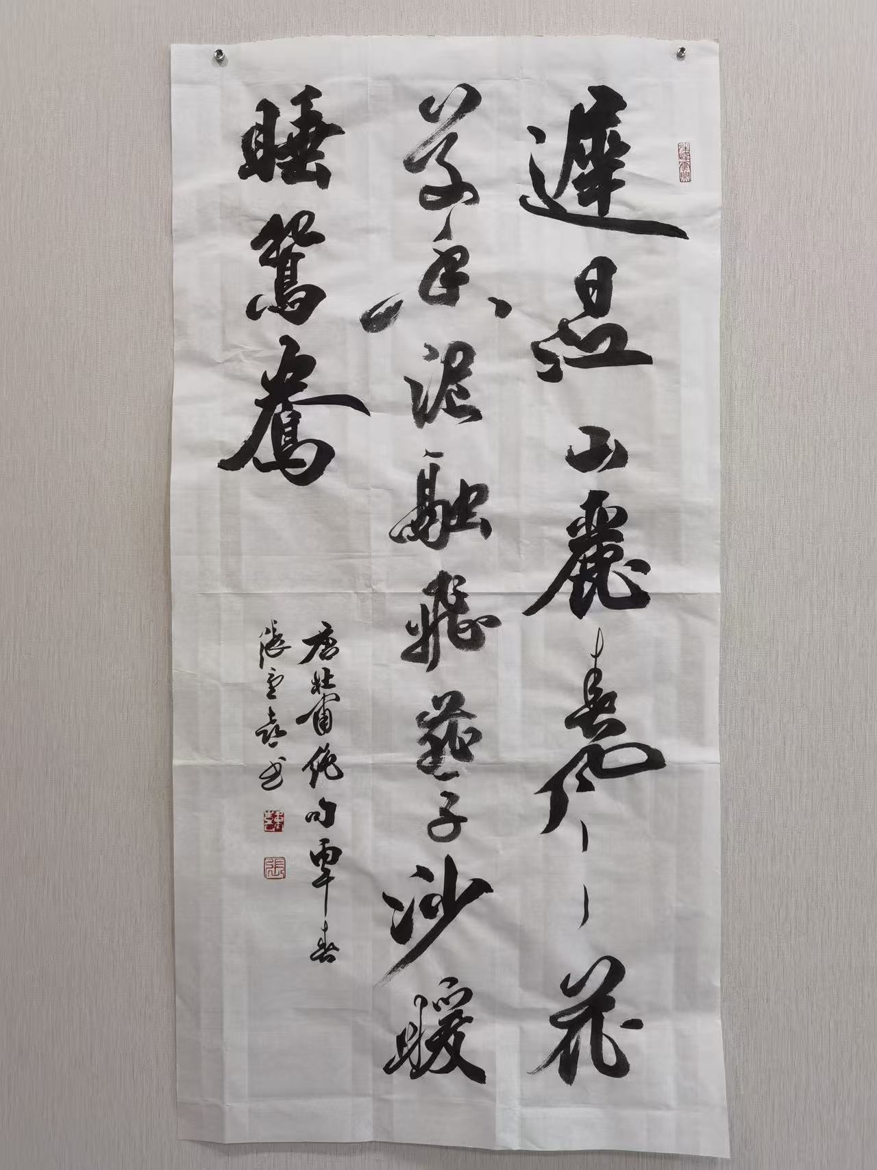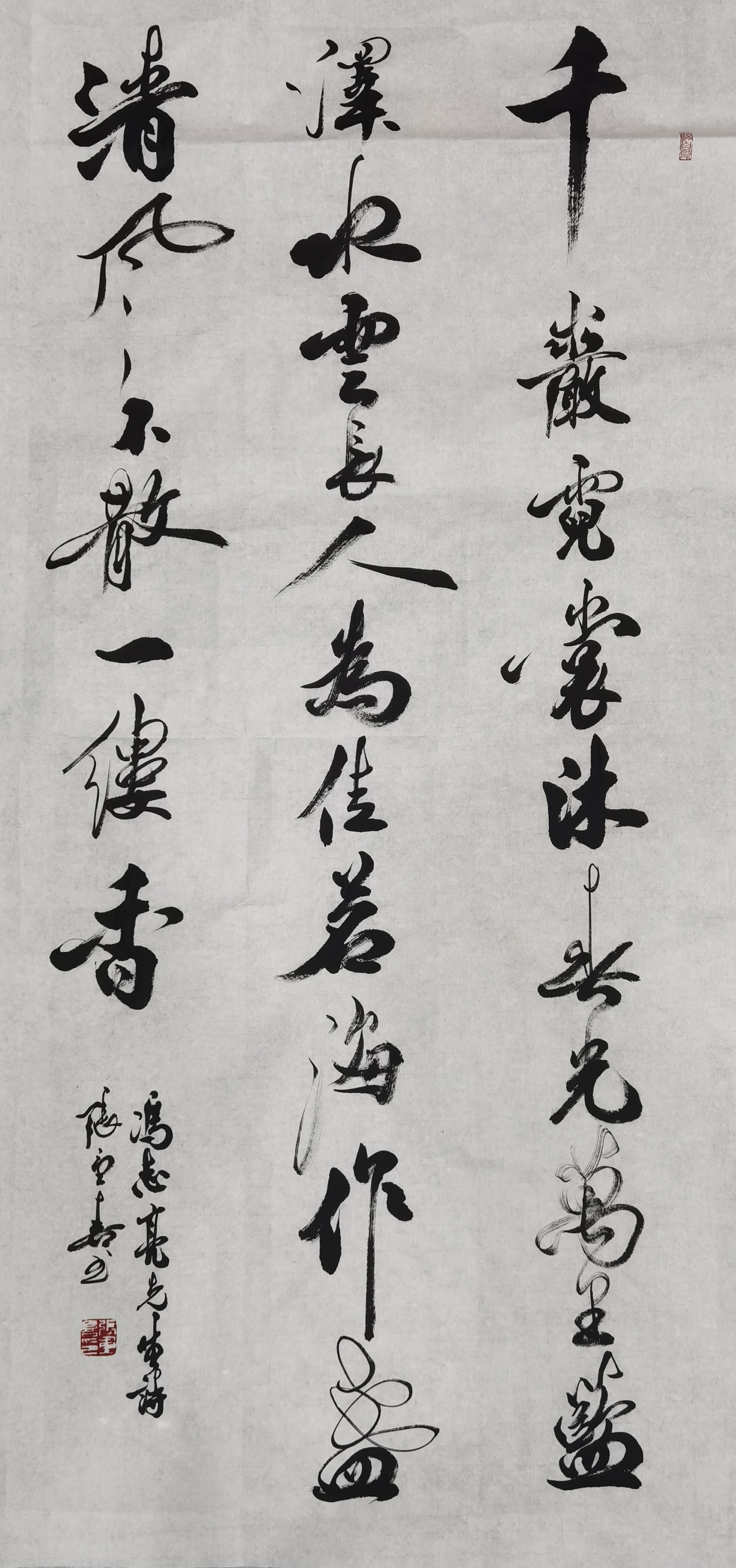 草书是张重喜最具情感张力的书体,其草书风格以“豪放不羁、气势磅礴、跌宕洒脱、墨韵淋漓”为特色,融合张旭、怀素的奔放与王铎、傅山的雄浑,兼具狂放之态与法度之度。在笔法上,笔锋翻转、提按起伏、疾徐相间,线条连绵缠绕、跌宕起伏,刚劲有力,干墨湿墨交替、浓淡变化丰富,线条苍劲老辣、灵动奔放,如蛟龙入海、笔走龙蛇,极具艺术张力;在结构上,打破常规、变化万千,字形大小错落、欹正不定、疏密对比强烈,结构夸张而不失法度,狂放而不失规矩,尽显草书的自由洒脱与个性张扬;在墨法上,浓墨、淡墨、干墨、湿墨、涨墨灵活运用,墨韵淋漓,增强了作品的视觉冲击力与艺术感染力;在意境上,雄浑大气、豪放洒脱,多书写抒发情怀、彰显志向的内容,笔墨与情感深度融合,尽显书家的豪迈胸襟与精神气度。