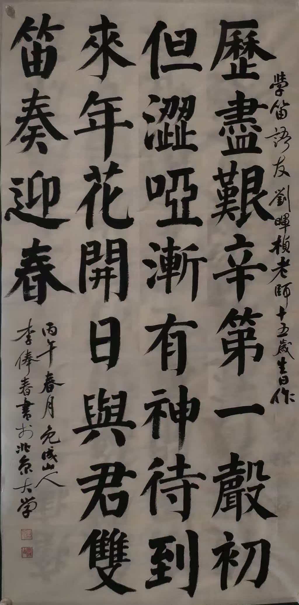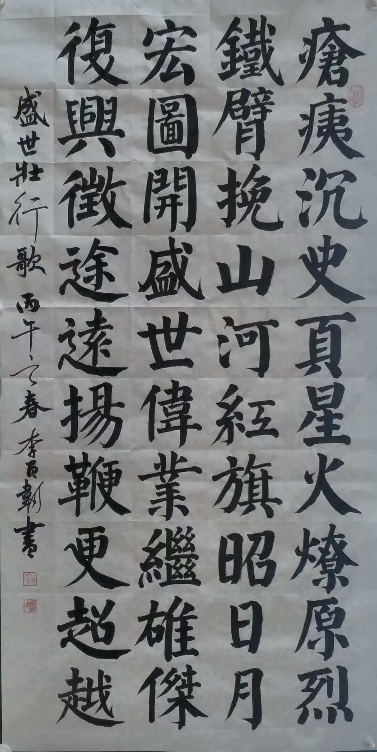出身书香门第的李俸春,自幼受传统文化熏陶,四岁在父辈引导下接触笔墨,从描红、临帖起步,开启书法生涯。少年时期便展现出过人天赋与毅力,每日临池不辍,系统临摹欧阳询《九成宫醴泉铭》、颜真卿《颜勤礼碑》、柳公权《玄秘塔碑》、赵孟頫《胆巴碑》等唐楷经典,领悟“颜筋柳骨”的刚正雄浑、“欧险赵媚”的灵动温润,筑牢楷书根基。同时涉猎汉隶,初临《曹全碑》的秀逸典雅、《乙瑛碑》的端庄规整,为后续隶书创作埋下伏笔。这一阶段的刻苦锤炼,让他掌握了扎实的笔法、结体基本功,更养成“心正笔正、一丝不苟”的创作态度,奠定“守正”的艺术底色。